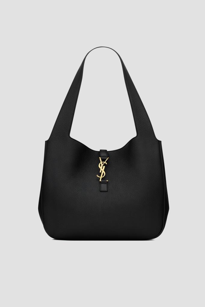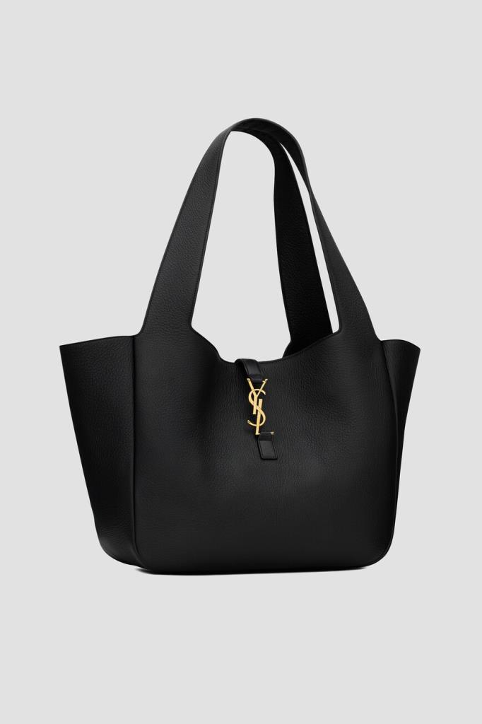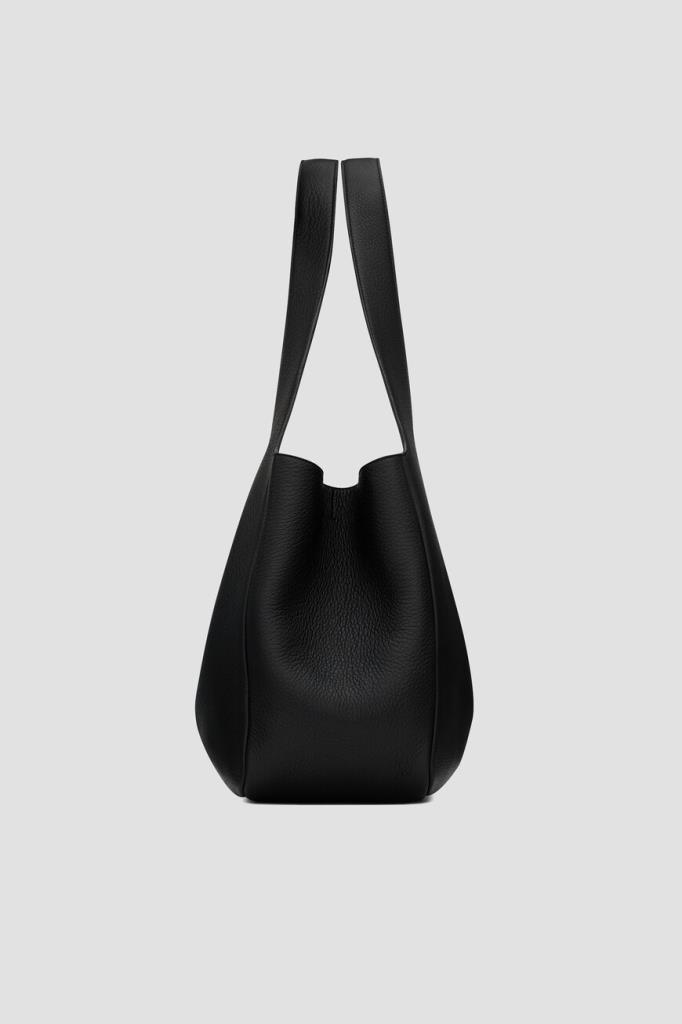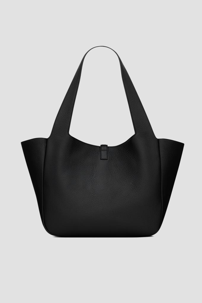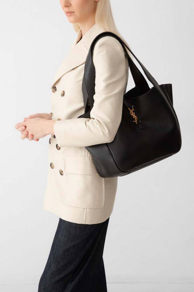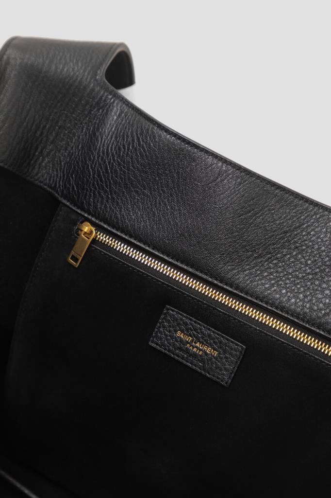 Сумка East/West от бренда Saint Laurent, выделанная внутри тональной замшей. Аксессуар изготовлен из мягкой зернистой кожи ягнёнка чёрного цвета. Внутри расположены завязки, позволяющие регулировать объём изделия и фиксировать широкие боковины. Модель застёгивается на тонкий ремешок с крючком в виде крупной культовой делали Cassandre бронзового оттенка.