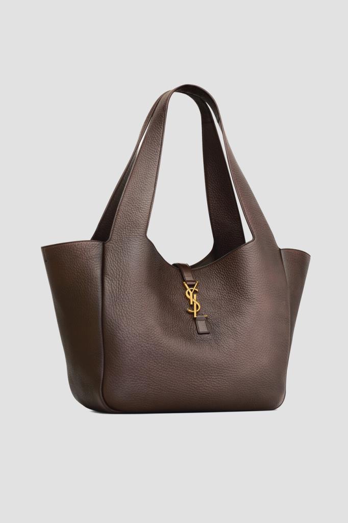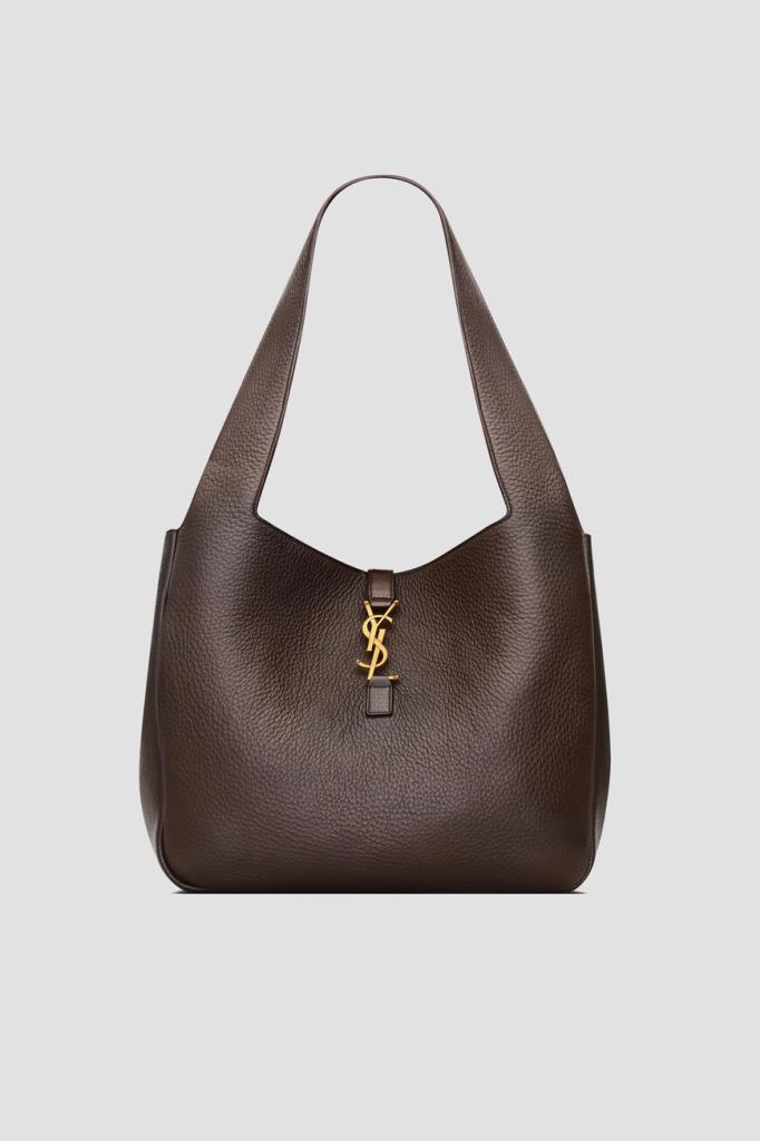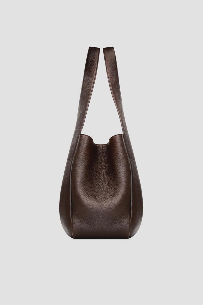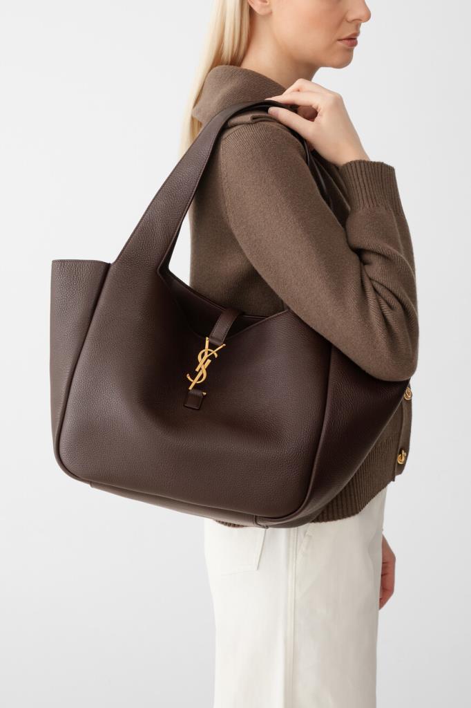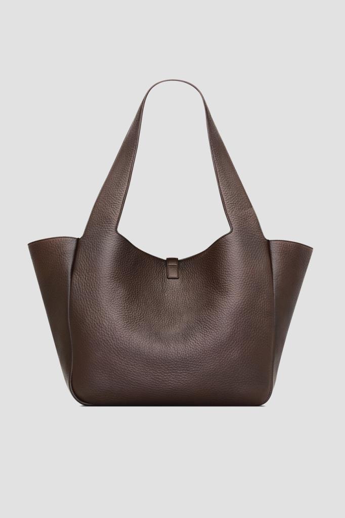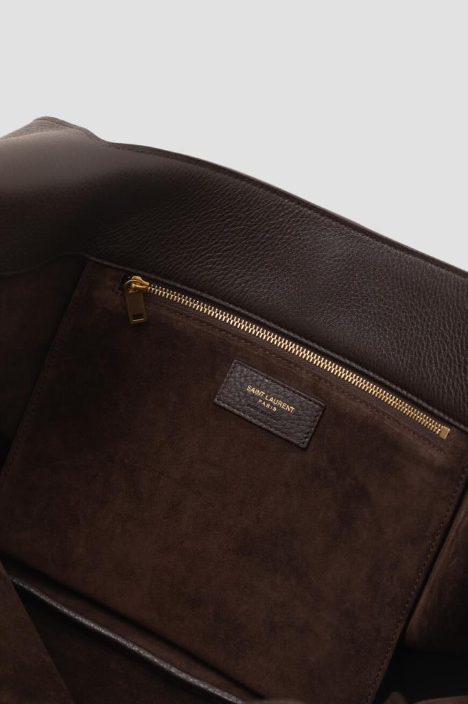 Тёмно-коричневая сумка East/West от бренда Saint Laurent с мягкими формами. Конструкция вместительного аксессуара из кожи ягнёнка с характерной зернистой текстурой отличается наличием просторного внутреннего отделения на ремешке с застёжкой-крючком и складных боковин. Модель можно носить в руке или на плече за две широкие округлые ручки.