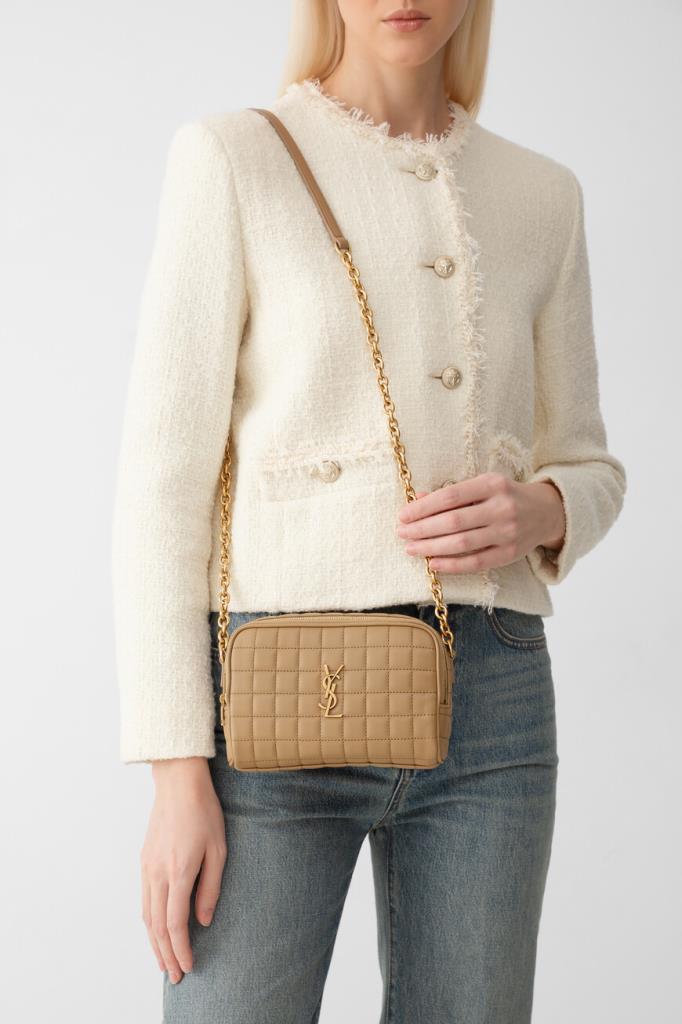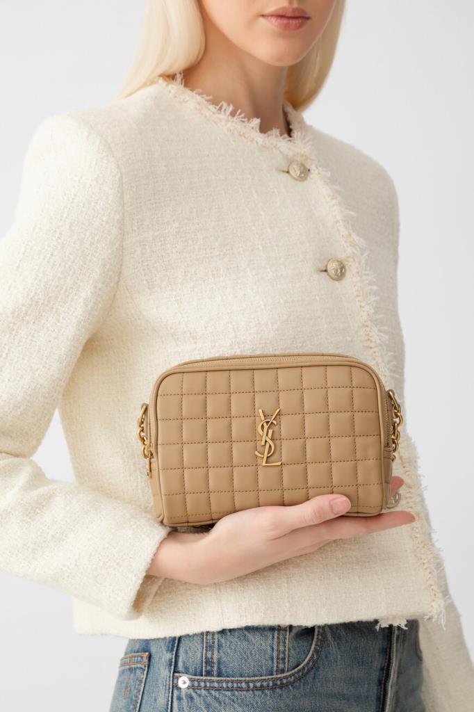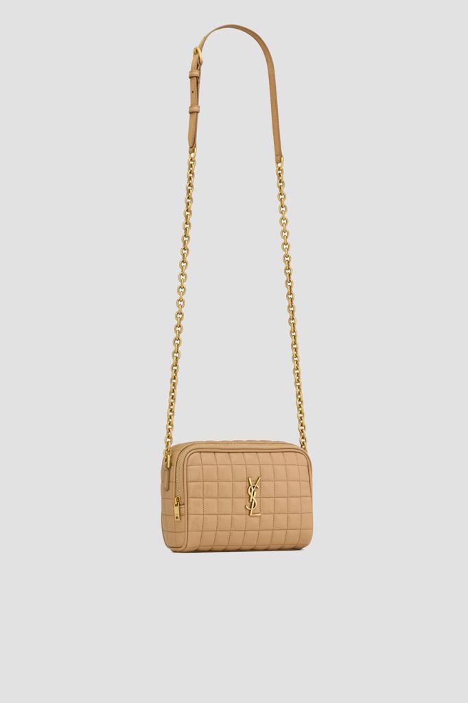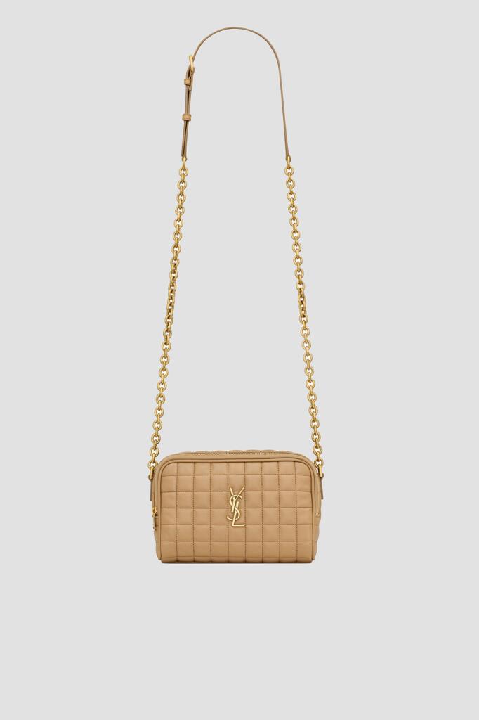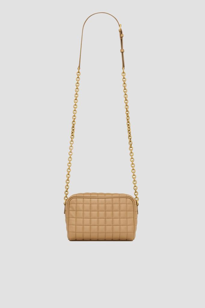 Маленькая сумка Saint Laurent с бронзовой металлической фурнитурой. Модель изготовлена из бежевой кожи ягнёнка со стёганым геометрическим узором в виде квадратов. Сохранность содержимого аксессуара обеспечивает застёжка-молния. Функциональный скользящий ремень-цепочка с регулирующей кожаной вставкой сверху предлагает несколько вариантов переноски.