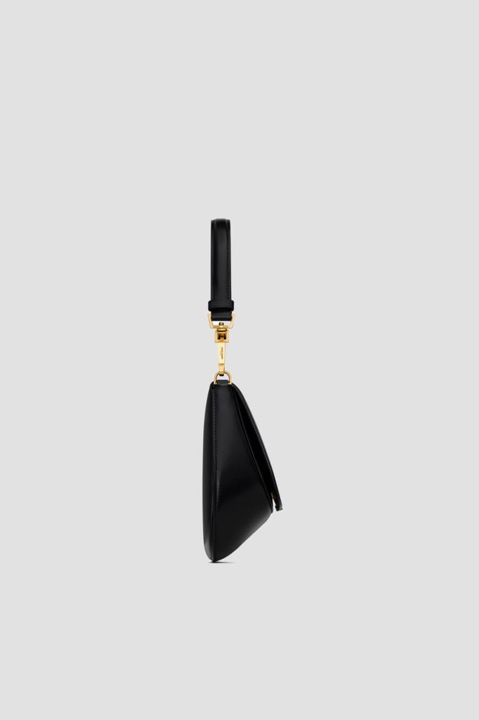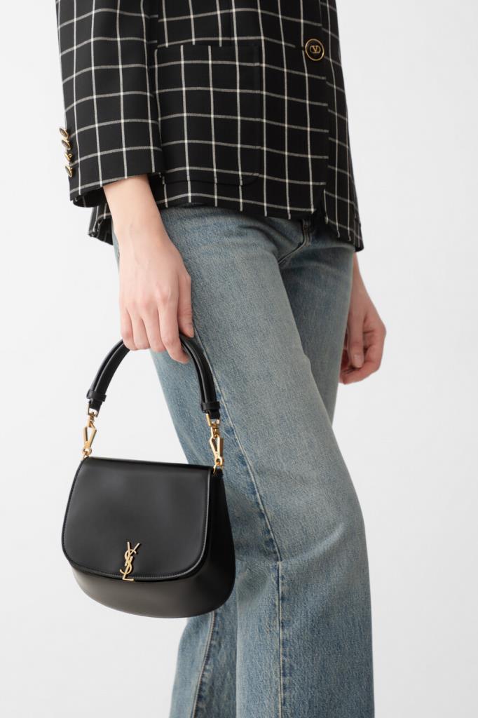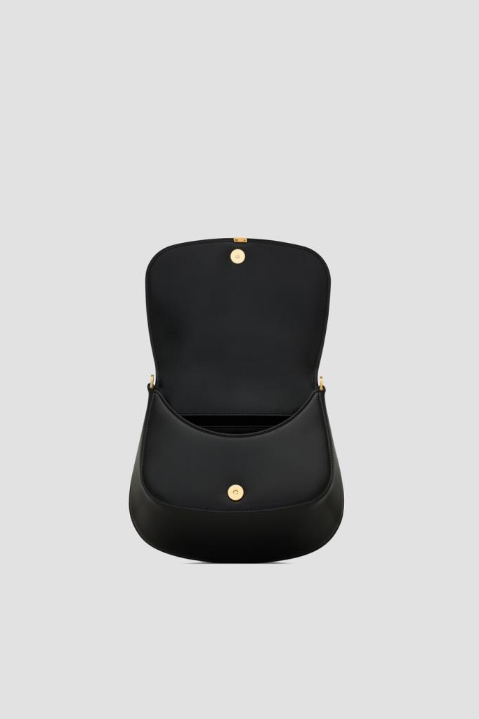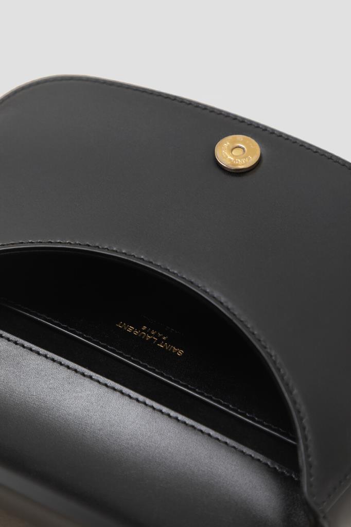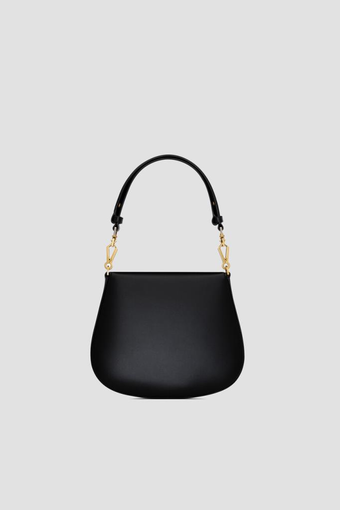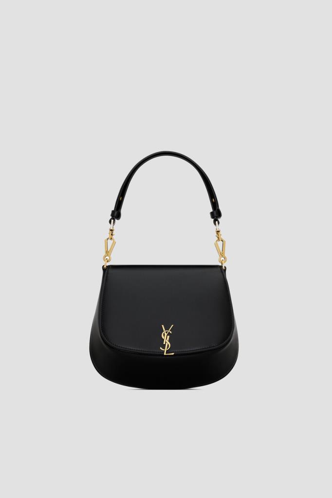 Структурированная сумка Saint Laurent Voltaire чёрного базового цвета. Для изготовления современного аксессуара используется гладкая телячья кожа. Конструкция изделия предполагает наличие одного внутреннего отделения на подкладке из бархатистой замши в тон основе и съёмной округлой ручки с бронзовыми карабинами. Атрибутом Дома выступает крупная металлическая деталь-монограмма Cassandre на клапане спереди.