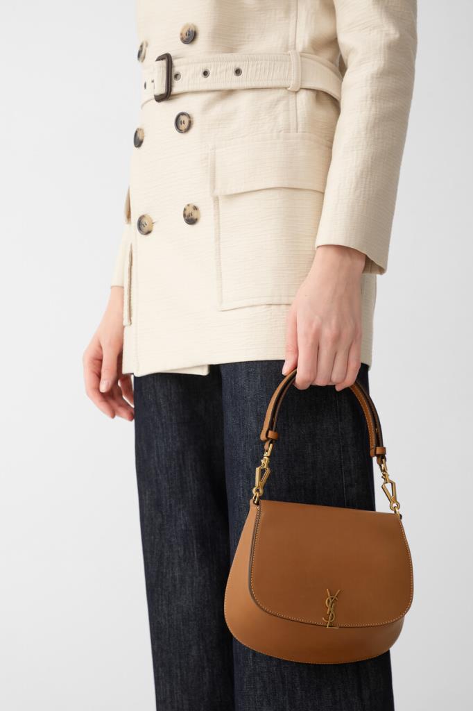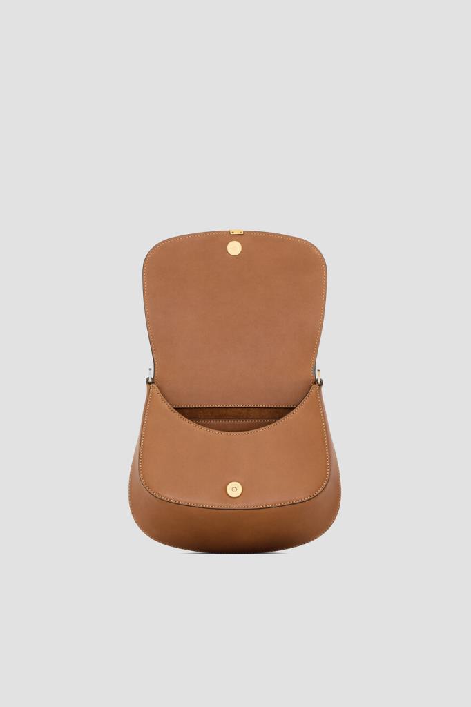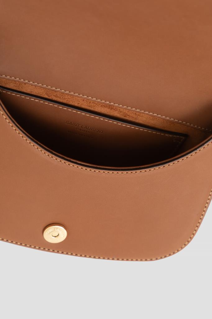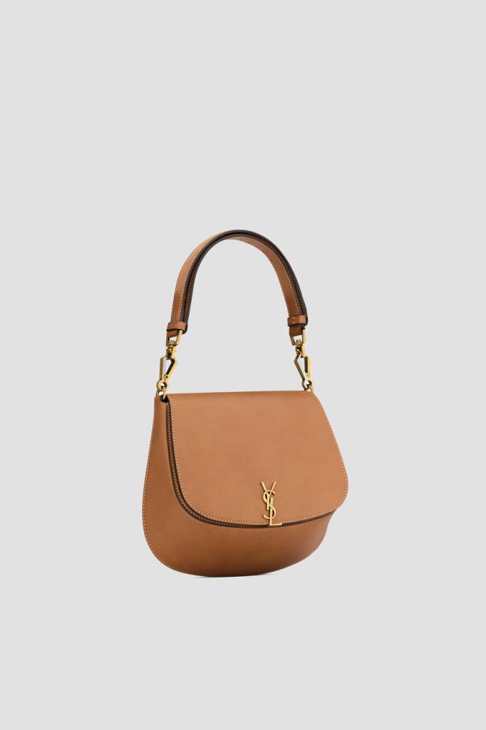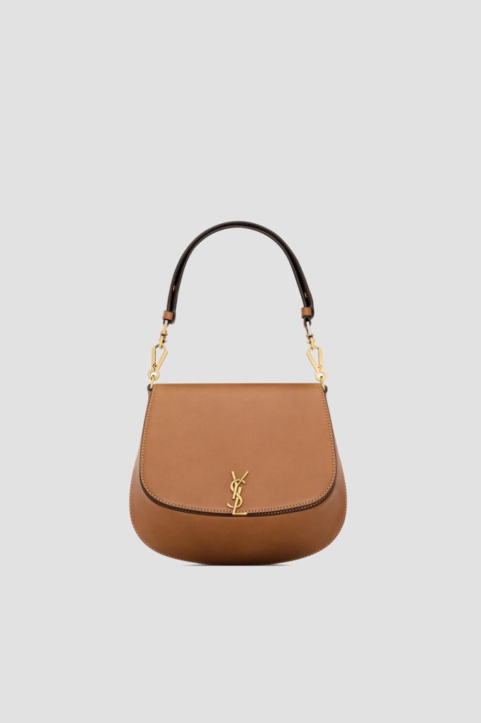 Сумка Saint Laurent Voltaire с откидным клапаном на магнитной застёжке. Эта современная и структурированная модель, изготовленная из мягкой телячьей кожи растительного дубления, отличается наличием съёмной округлой ручки с бронзовыми карабинами. Внутри - одно большое отделение на подкладке из бархатистой замши в тон основе и брендированный боковой карман.