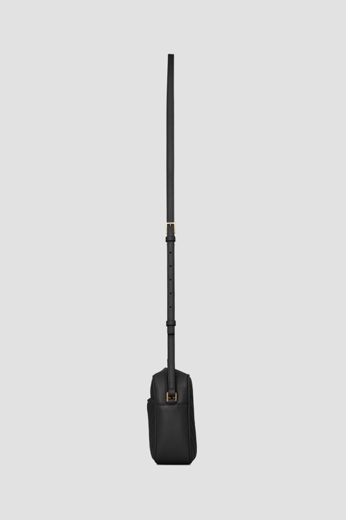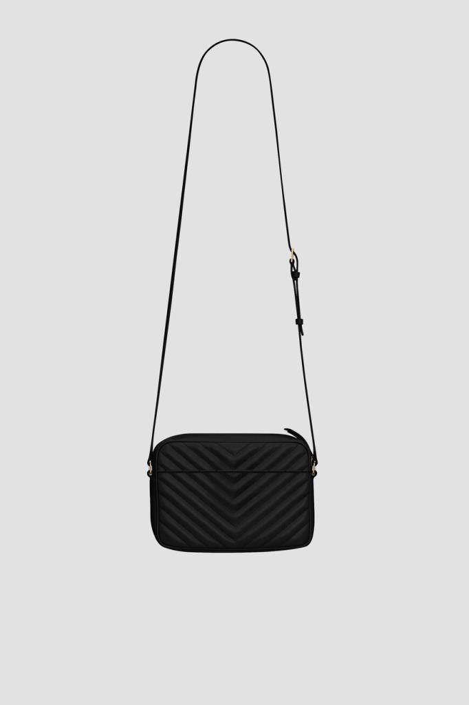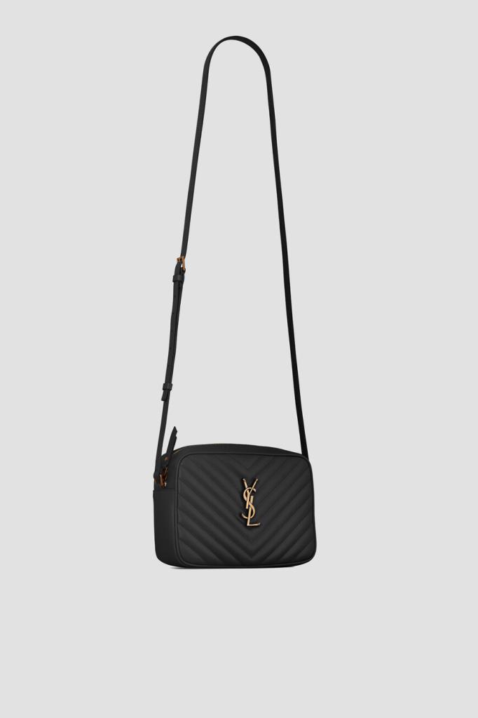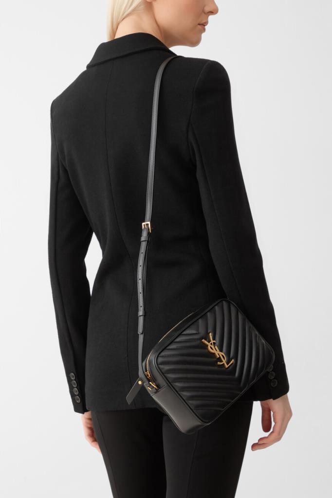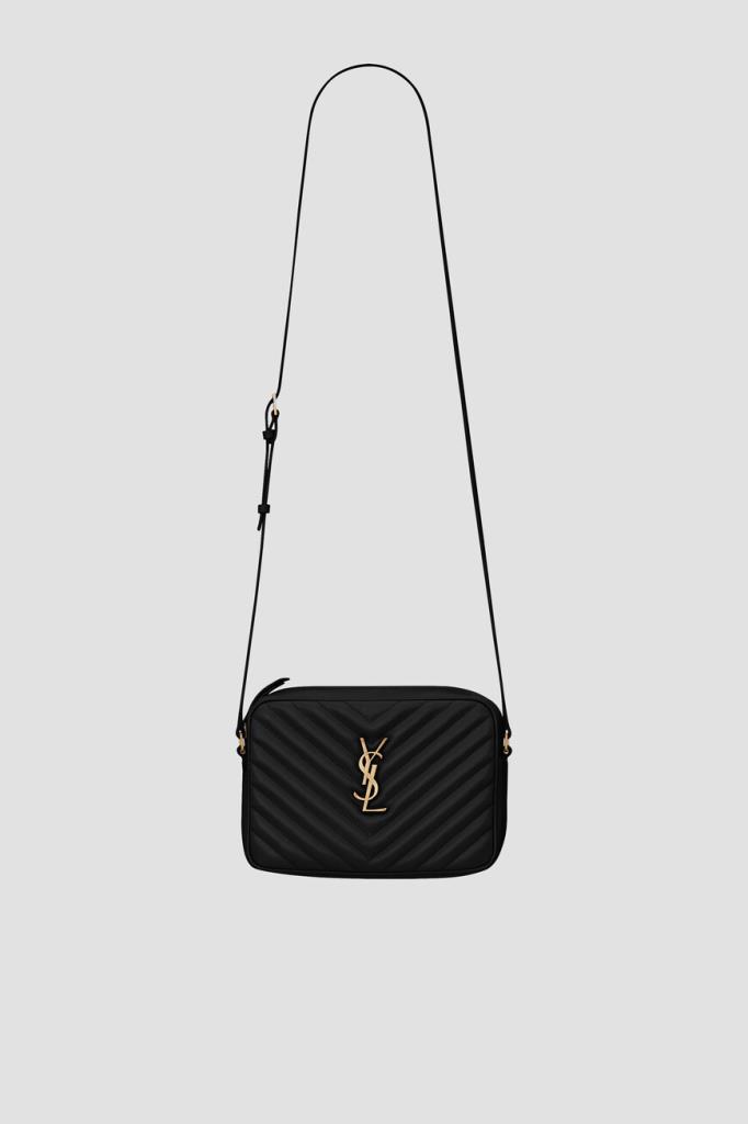 Чёрная сумка Lou на тонком регулирующем ремешке от бренда Saint Laurent. Аксессуар выполнен из мягкой кожи телёнка и декорирован стёганым геометрическим узором в «ёлочку» на передней и задней гранях. На принадлежность изделия Дому указывает крупная рельефная монограмма Cassandre из металла бронзового оттенка.