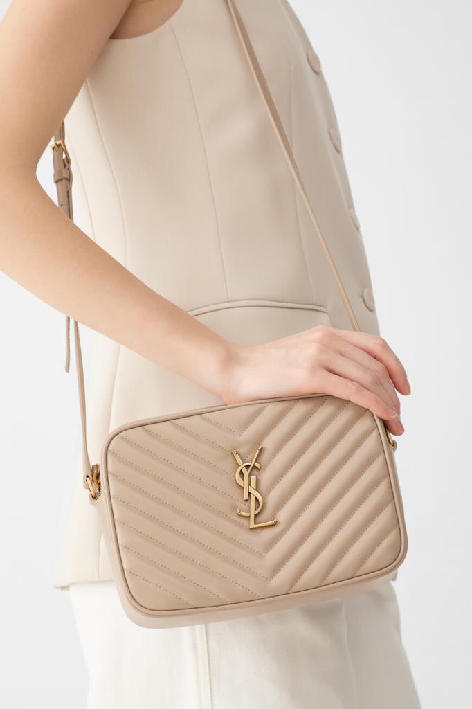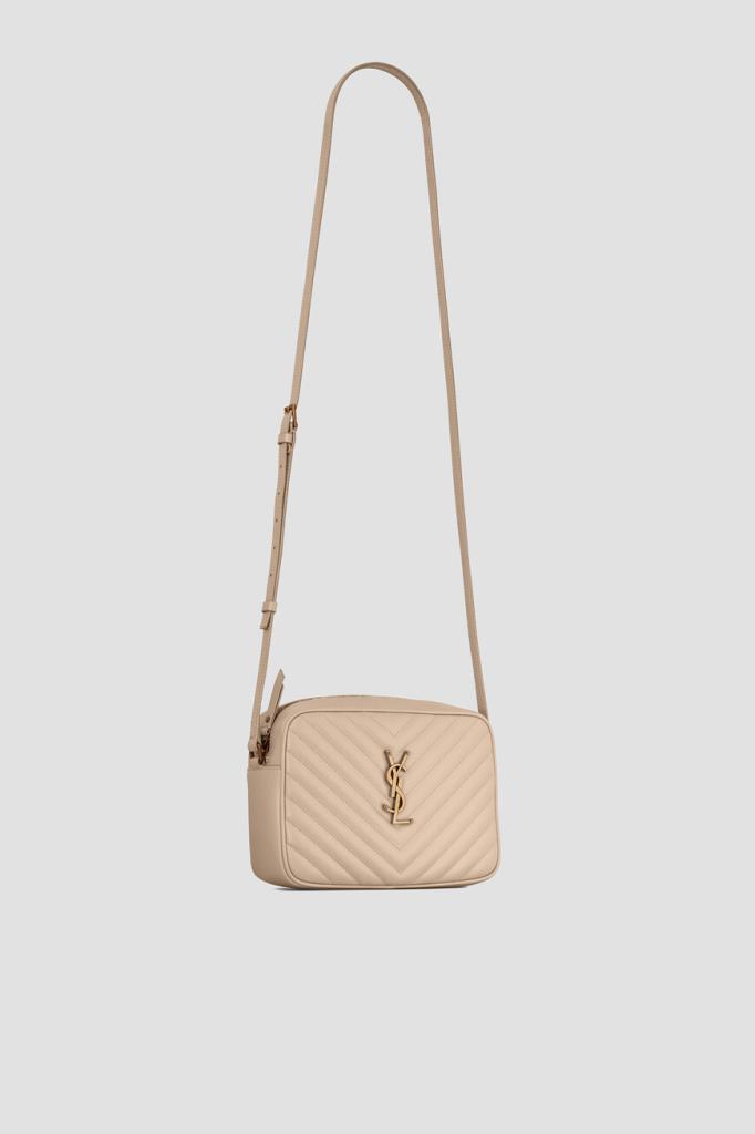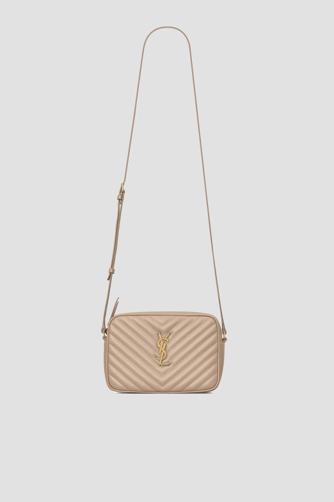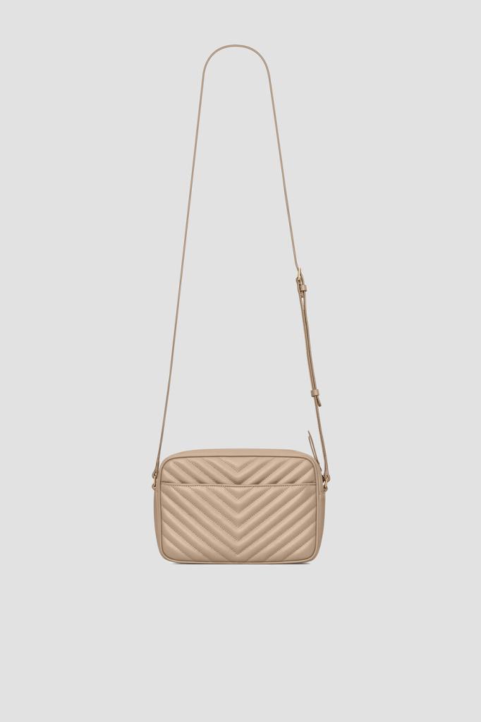 Сумка Lou от бренда Saint Laurent с геометрической стёжкой в «ёлочку». Кожаная модель окрашена в нейтральный светло-бежевый оттенок и оснащена застёжкой-молнией, одним внутренним отделением и плоским открытым карманом сзади. Принадлежность компактного аксессуара Дому обозначена рельефной знаковой символикой - лого-монограммой Cassandre, размещённой на лицевой стенке.