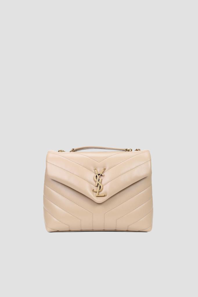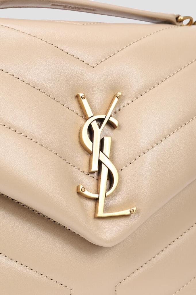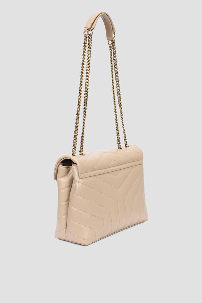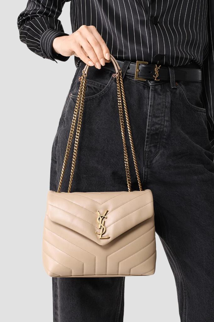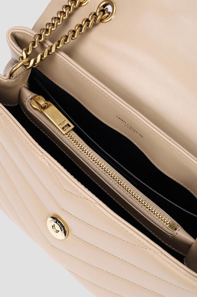 Светло-бежевая сумка LOULOU от бренда Saint Laurent. Модель изготовлена из мягкой кожи телёнка и украшена геометрической стёжкой. Скользящий плечевой ремень-цепочка золотого оттенка с двумя кожаными вставками, который можно сложить вдвое, обеспечивает удобство переноски. Отличительной деталью является треугольный откидной клапан с крупной монограммой Кассандра, составленной из инициалов Ива Сен-Лорана, спереди.