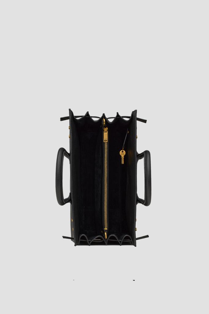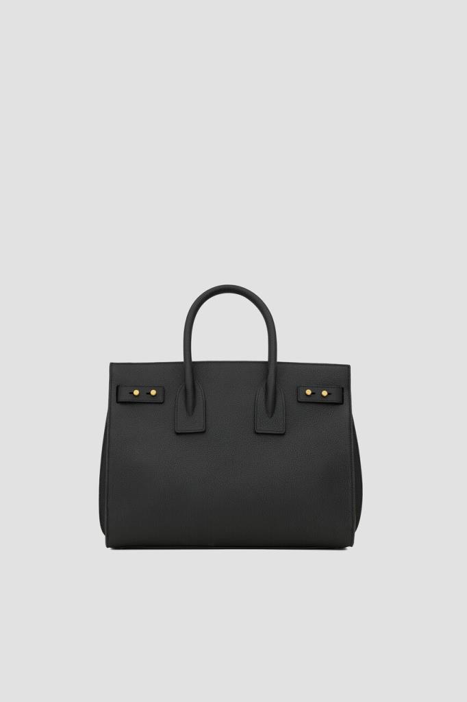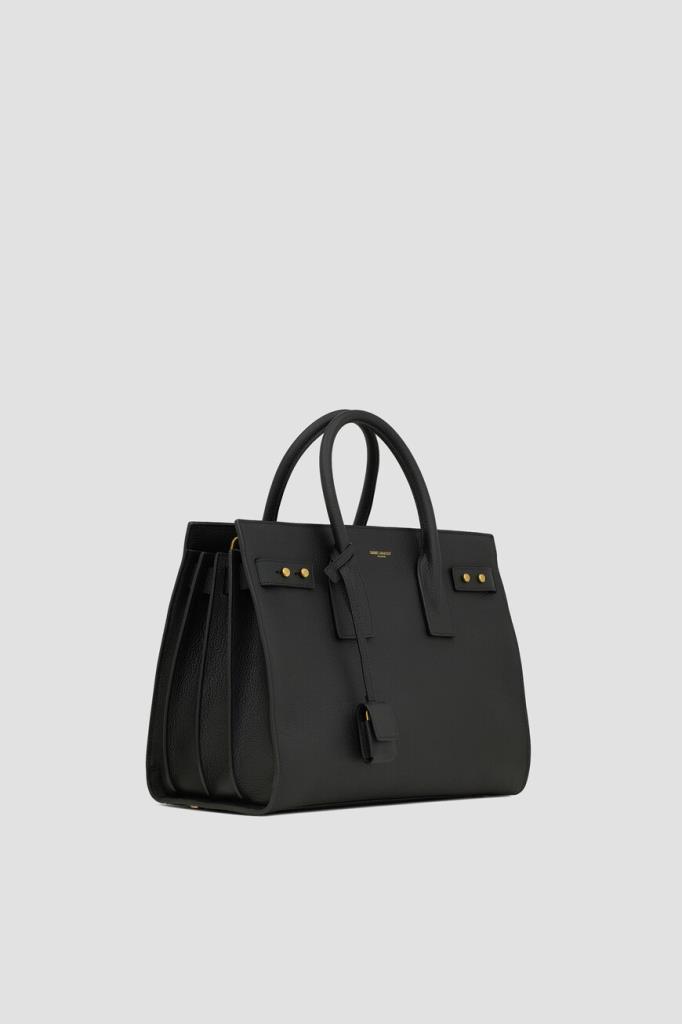 Маленькая сумка SAC DE JOUR от бренда Saint Laurent. Изделие чёрного цвета, выполненное из зернистой кожи телёнка, оснащено двумя просторными внутренними отделениями с карманом-перегородкой на молнии золотого оттенка. Модель отличается боковинами «гармошкой» и минималистичным декором: золотистой надписью-логотипом на лицевой стенке.