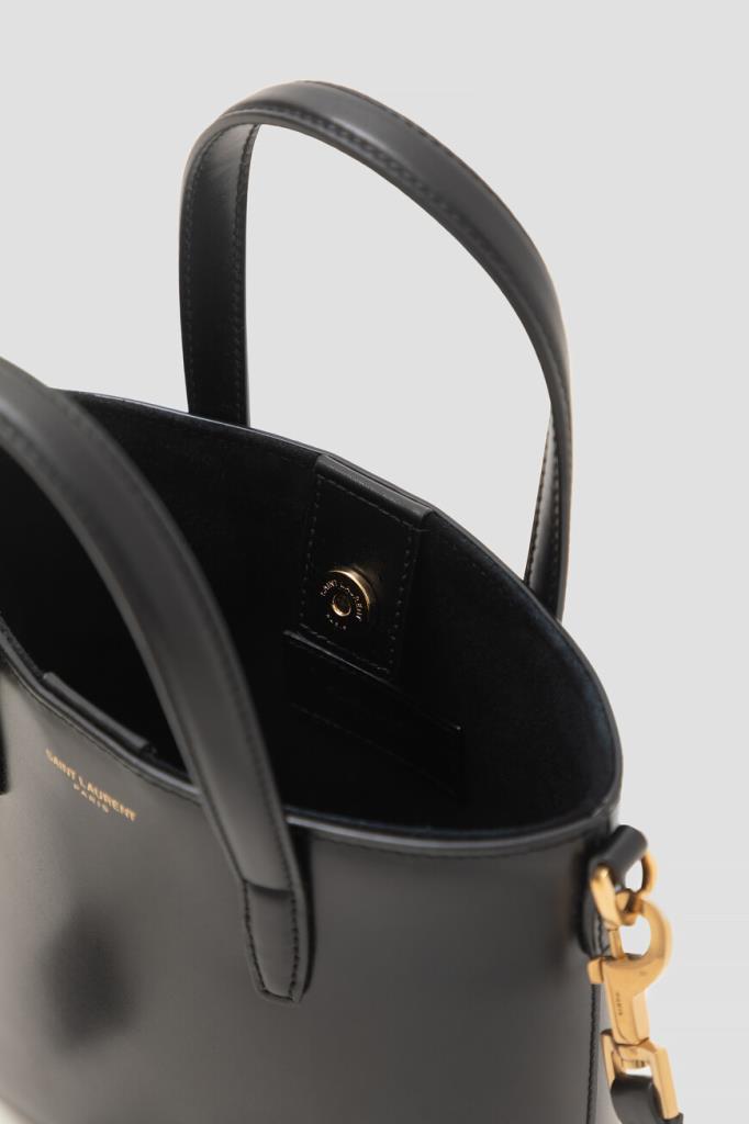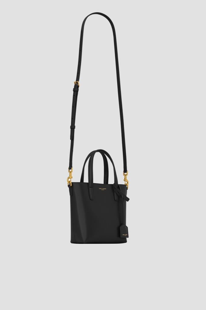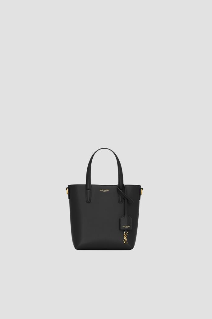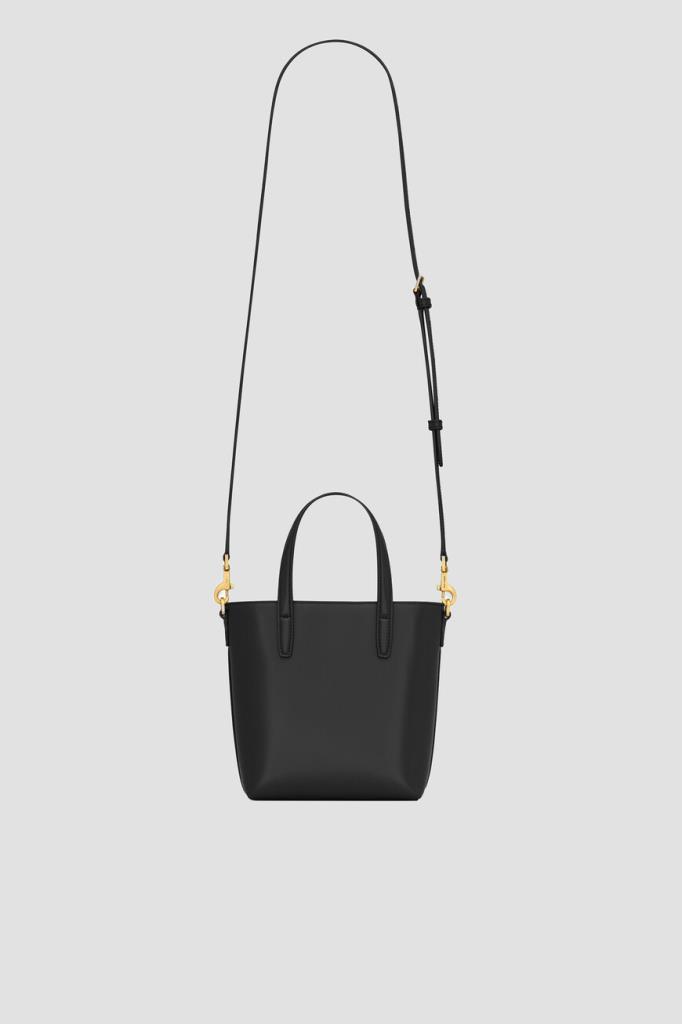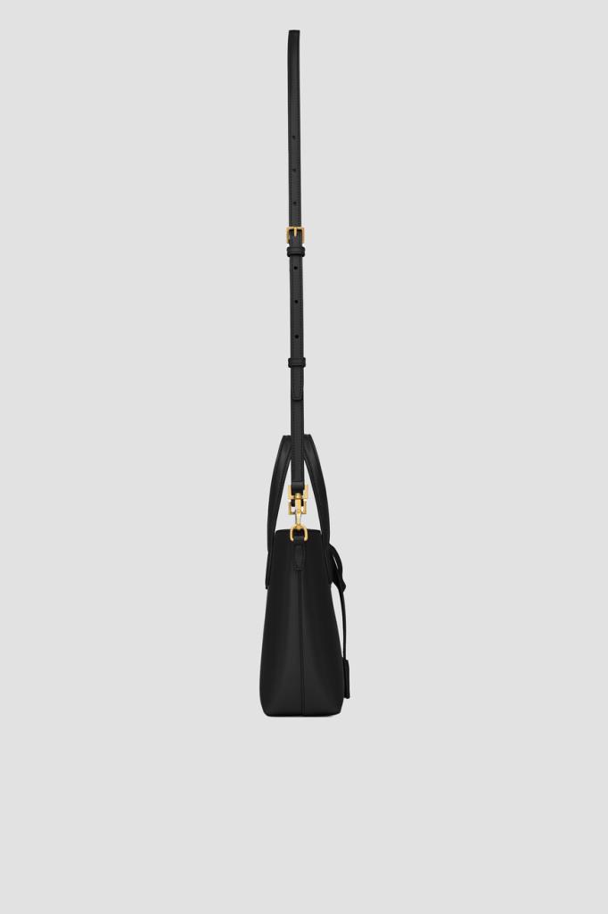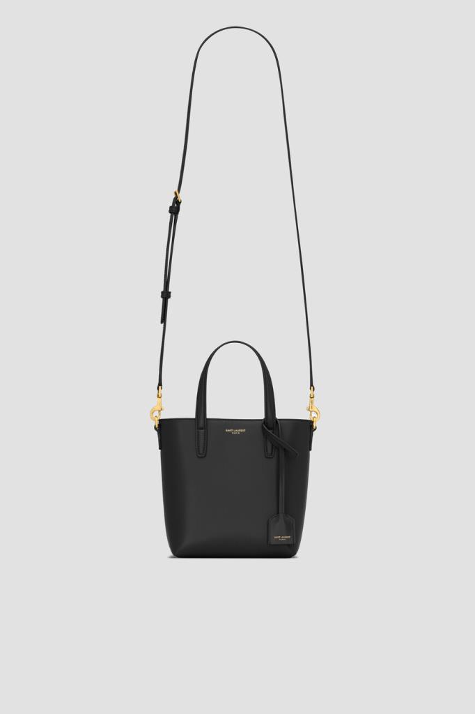 Сумка-мини Toy Shopping от бренда Saint Laurent. Для изготовления модели-тоут выбрана гладкая чёрная кожа телёнка. О принадлежности аксессуара с просторным внутренним отделением Дому деликатно напоминают золотистые надписи-лого на лицевой стенке и съёмной подвеске с лого-монограммой Cassandre. Изделие удобно носить в руке, на плече или через плечо благодаря двум округлым ручкам и тонкому регулируемому ремню с бронзовыми карабинами.