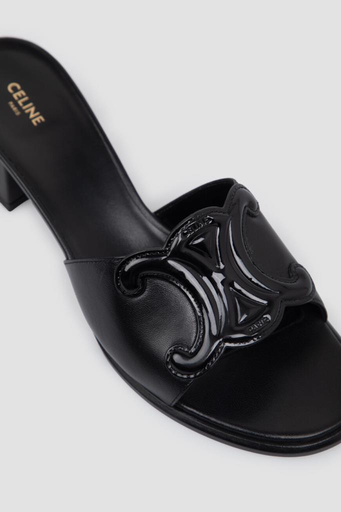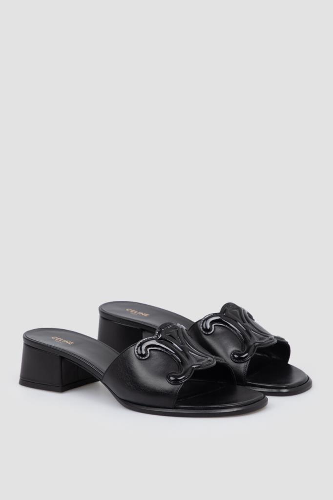 Комбинированные мюли Clemence от Celine. Модель изготовлена из мягкой кожи ягнёнка чёрного цвета и декорирована рельефной деталью Triomphe из лакированной телячьей кожи спереди в тон. Конструкция изделия предполагает наличие миндалевидного носка и широкого квадратного каблука. Обувь без застёжек станет идеальным дополнением Ваших сезонных комплектов.