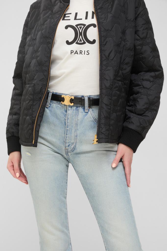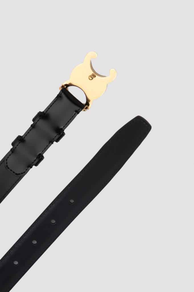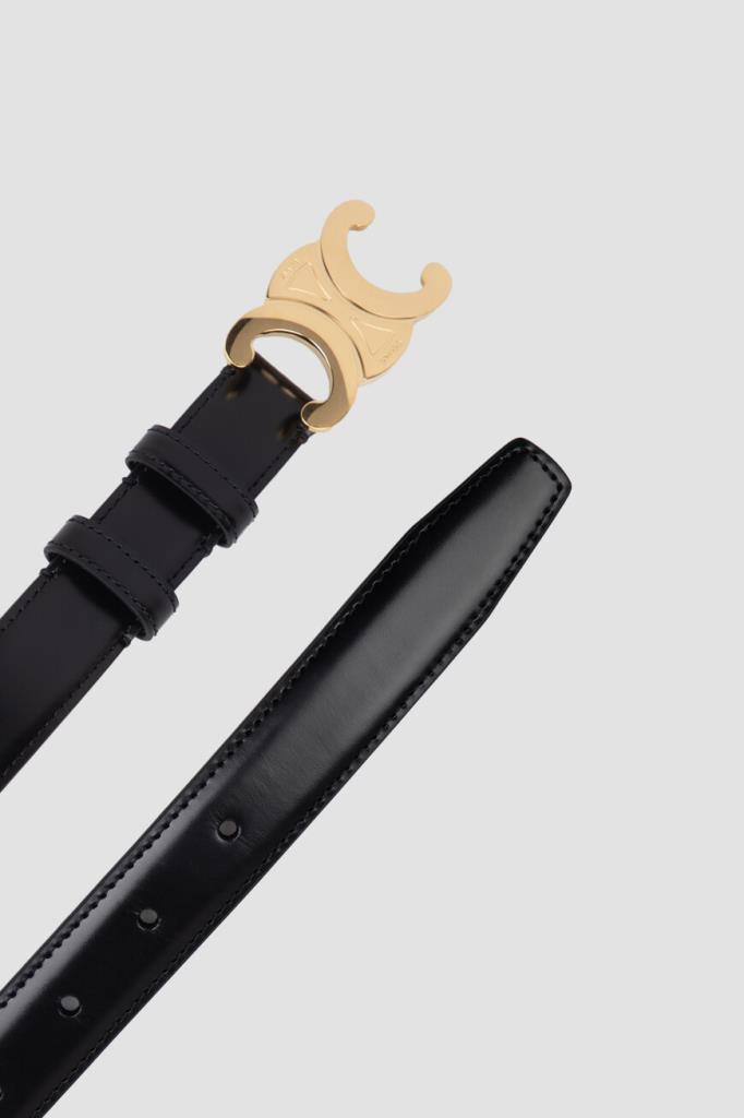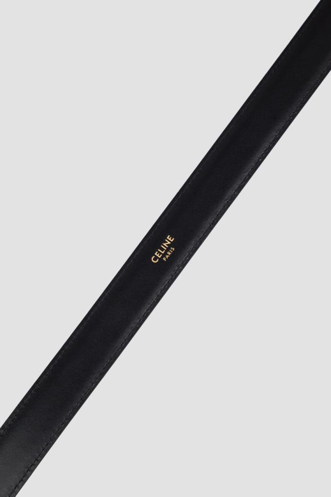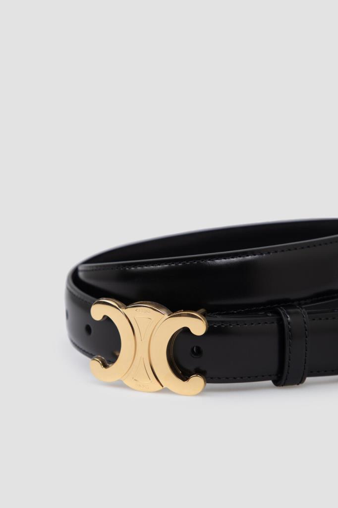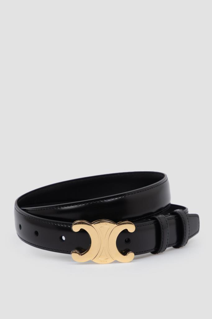 Чёрный ремень Celine станет идеальным дополнение Ваших casual-образов. Для создания тонкого аксессуара используется мягкая телячья кожа Taurillon премиального качества. Крупная дизайнерская пряжка выполнена в виде знакового символа Triomphe золотого оттенка. Изделие характеризуется наличием двух подвижных тренчиков и прошивкой по краям.