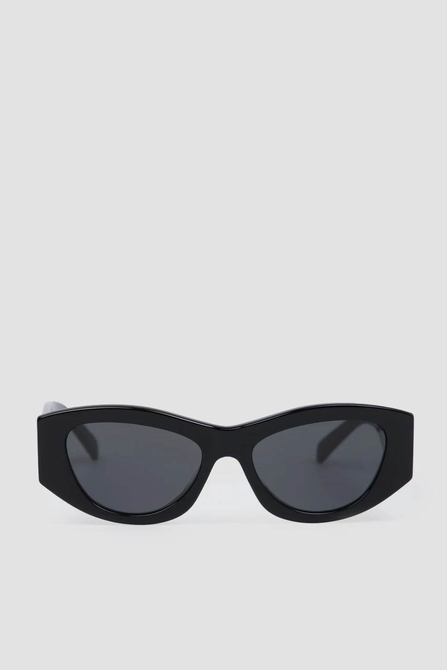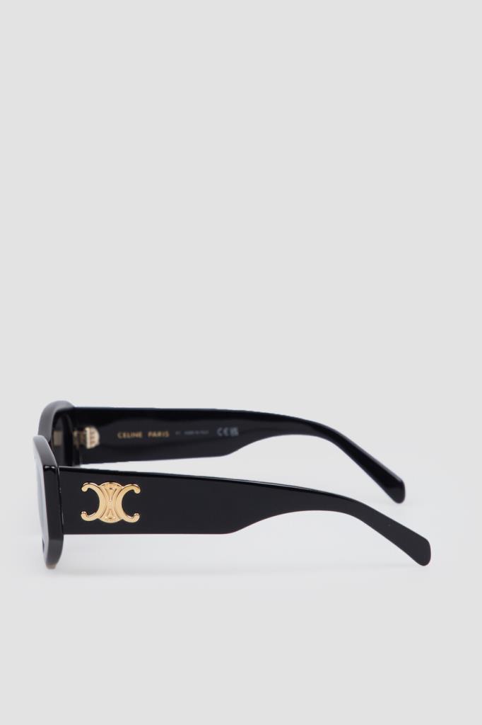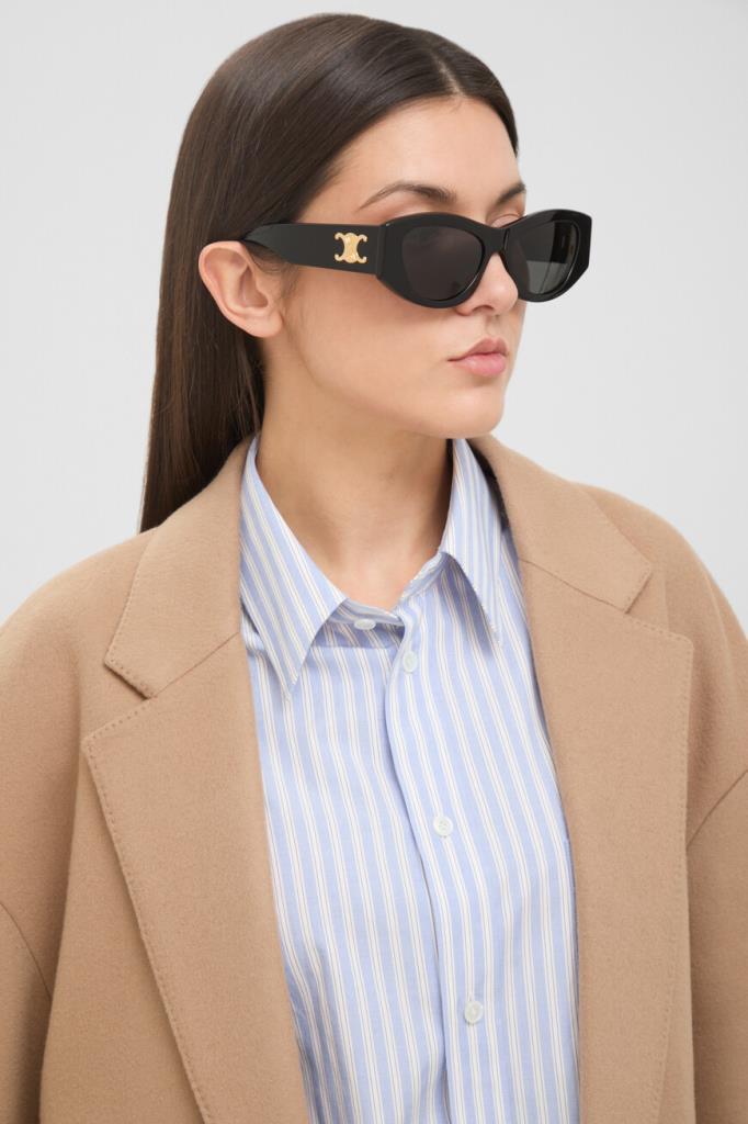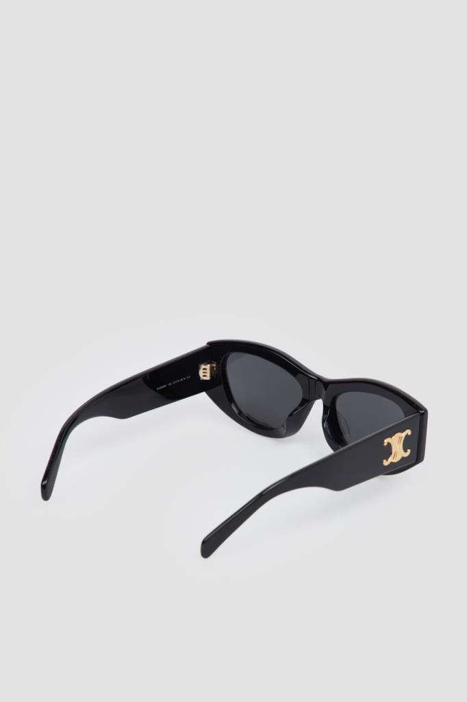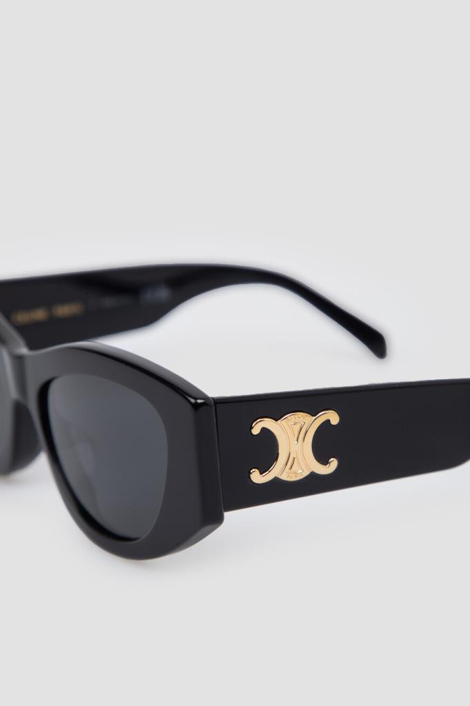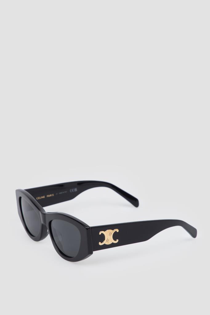 Солнцезащитные очки Celine формы cat eye автоматически делают взгляд выразительным. Рамка оправы модели Triomphe 15 выполнена из прочного чёрного ацетата. Изделие только кажется массивным — широкая оправа почти ничего не весит. С полимером, отполированным до глянцевого блеска, контрастирует золотистая рельефная эмблема с гравировкой лого, которая украшает дужки аксессуара.