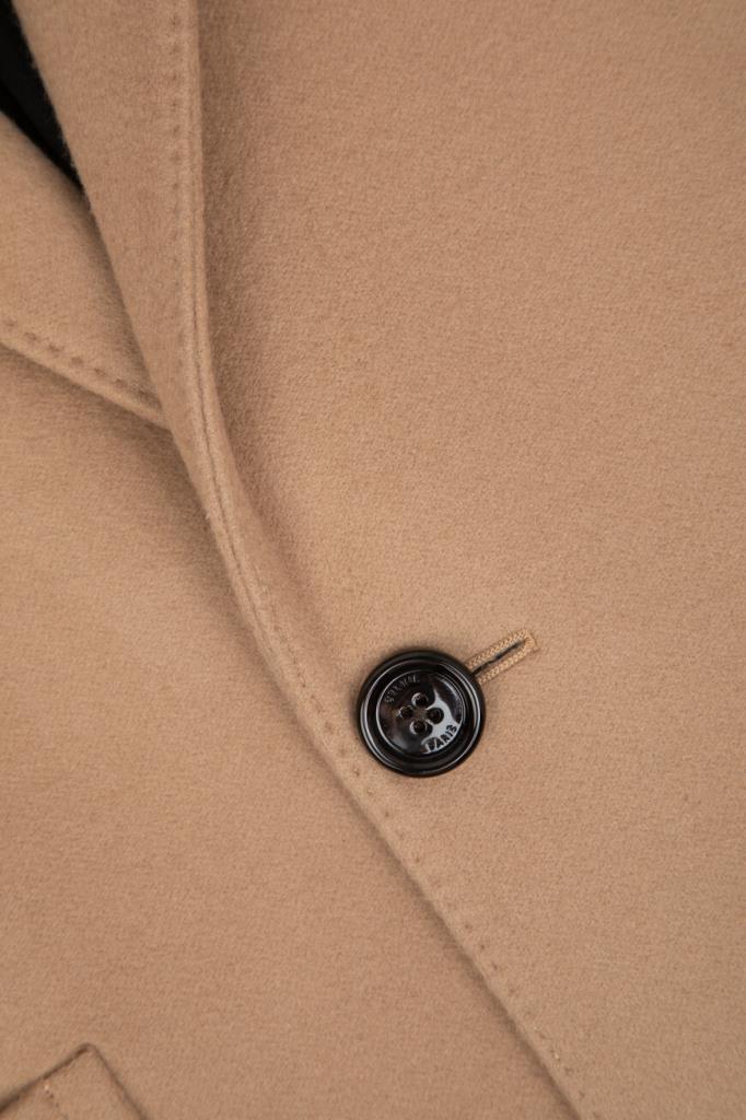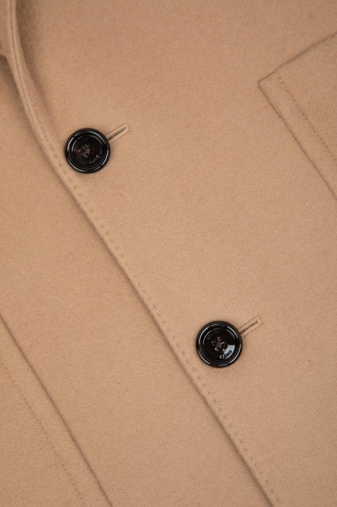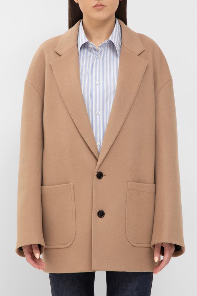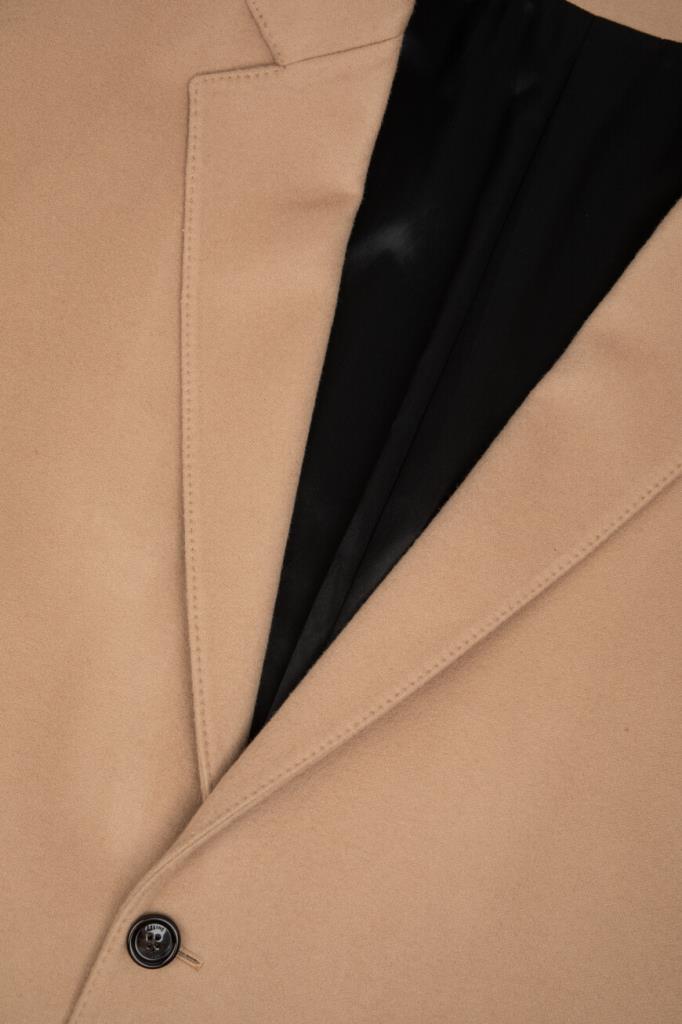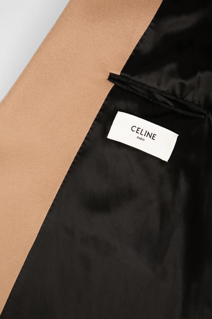 Однобортное полупальто Egg от Celine. Модель силуэта оверсайз изготовлена из мягкого кашемира бежевого цвета и оснащена застёжкой на две роговые пуговицы. Изделие интересно наличием двух крупных накладных карманов по бокам и чёрной подкладки из двух видов материалов: хлопка и ткани купро. Атрибутом Дома выступает гравировка «Celine Paris» на пуговицах.