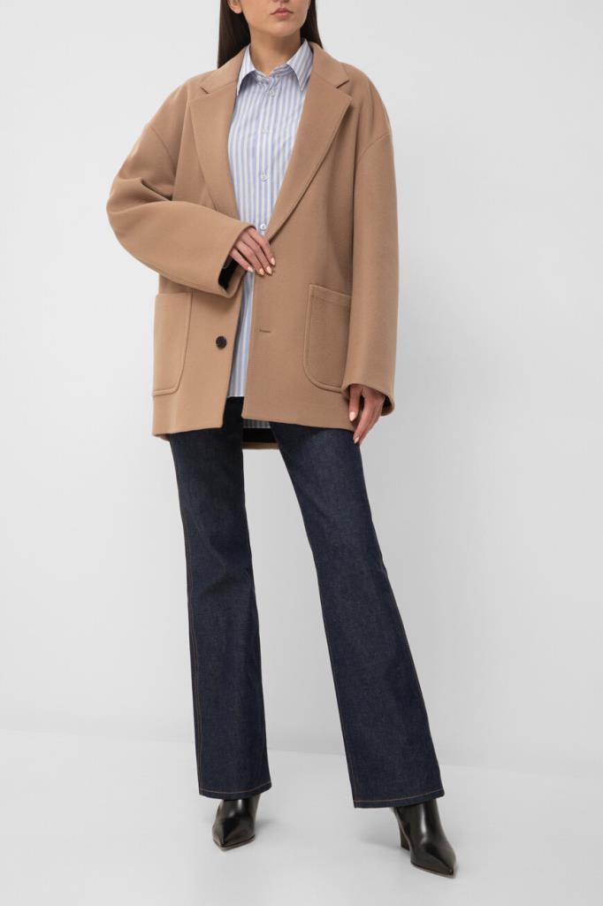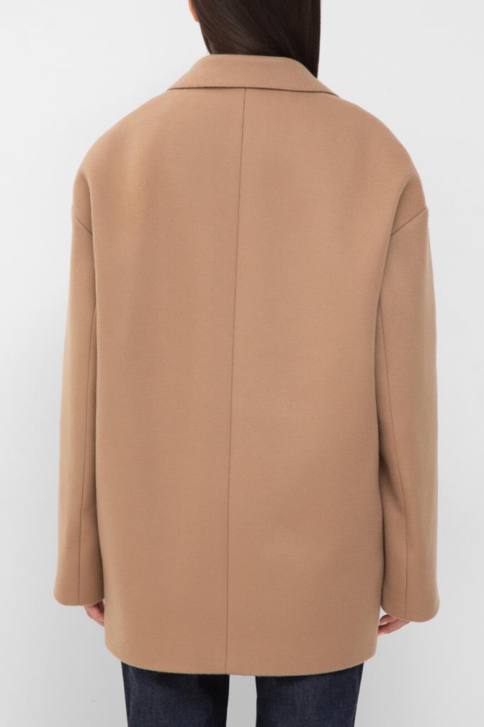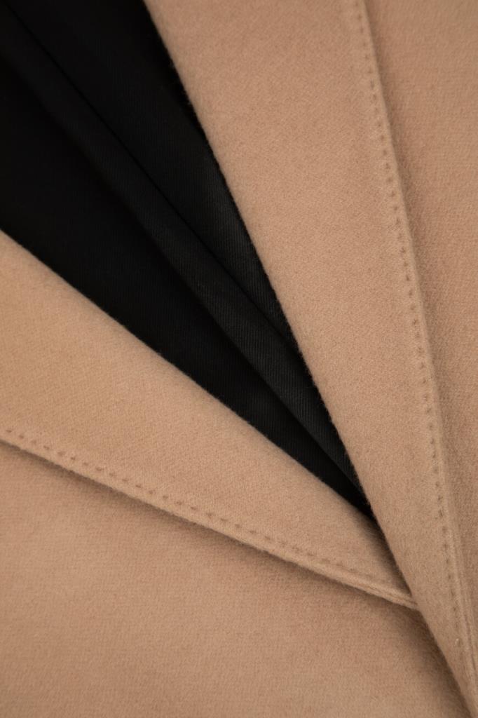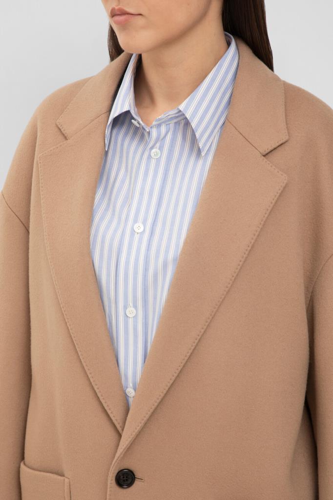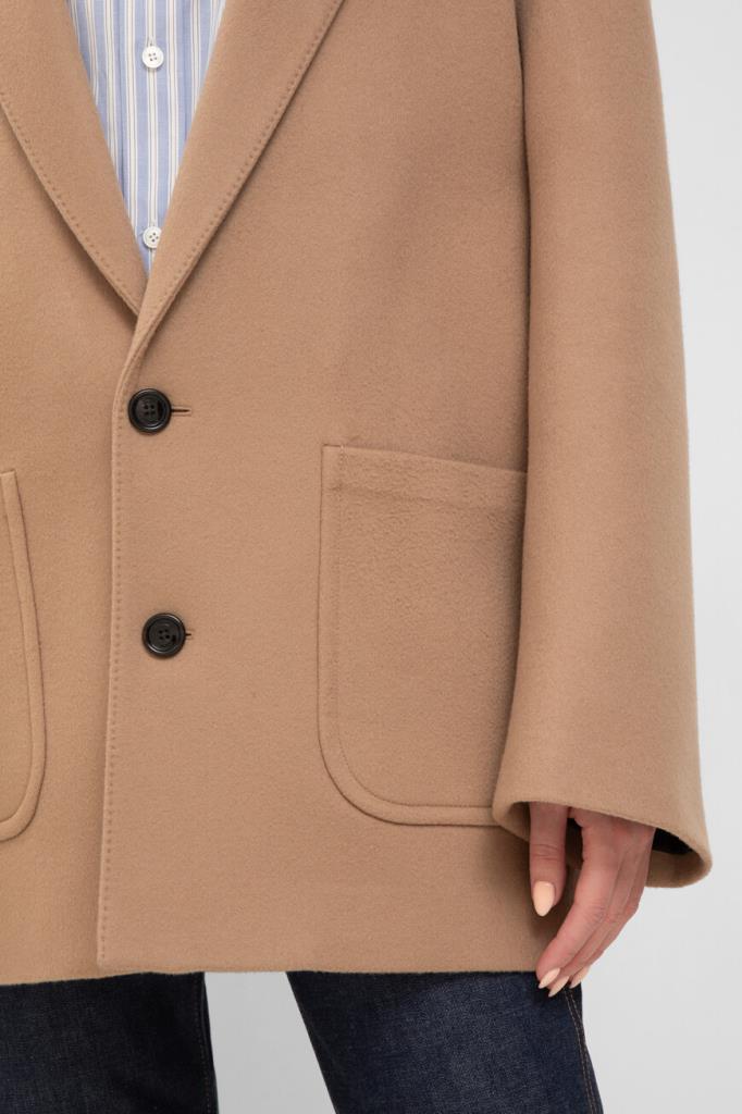 Однобортное полупальто Egg от Celine. Модель силуэта оверсайз изготовлена из мягкого кашемира бежевого цвета и оснащена застёжкой на две роговые пуговицы. Изделие интересно наличием двух крупных накладных карманов по бокам и чёрной подкладки из двух видов материалов: хлопка и ткани купро. Атрибутом Дома выступает гравировка «Celine Paris» на пуговицах.
