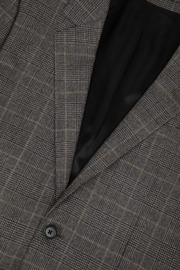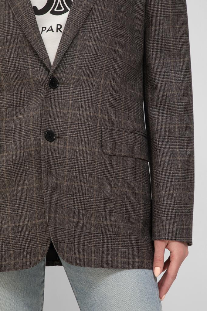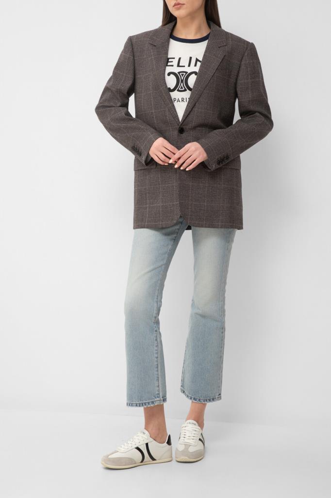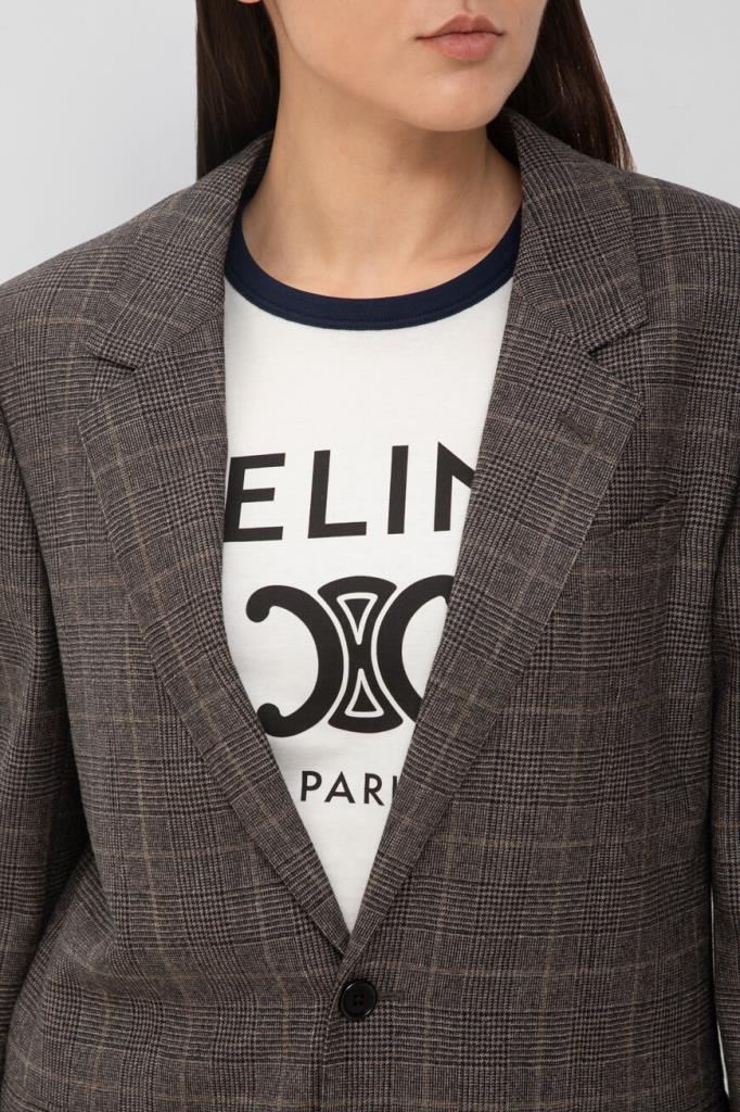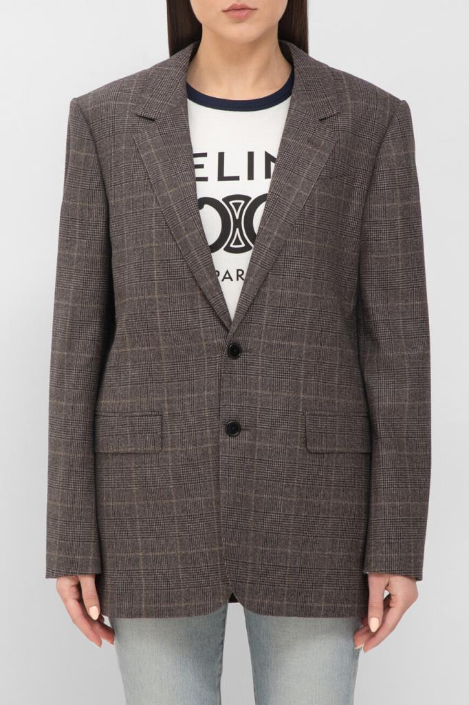 Клетчатый блейзер мужского кроя от Celine. Для изготовления однобортной модели Bibliothèque Nationale de France на чёрной подкладке выбрана мягкая шерсть. Поверхность изделия украшает крупный геометрический мотив «Принц Уэльский». Конструкция пиджака предполагает наличие прямоугольных лацканов и застёжку на две роговые пуговицы чёрного цвета.