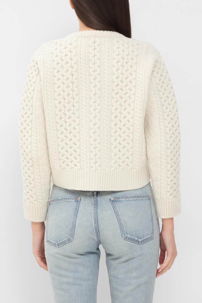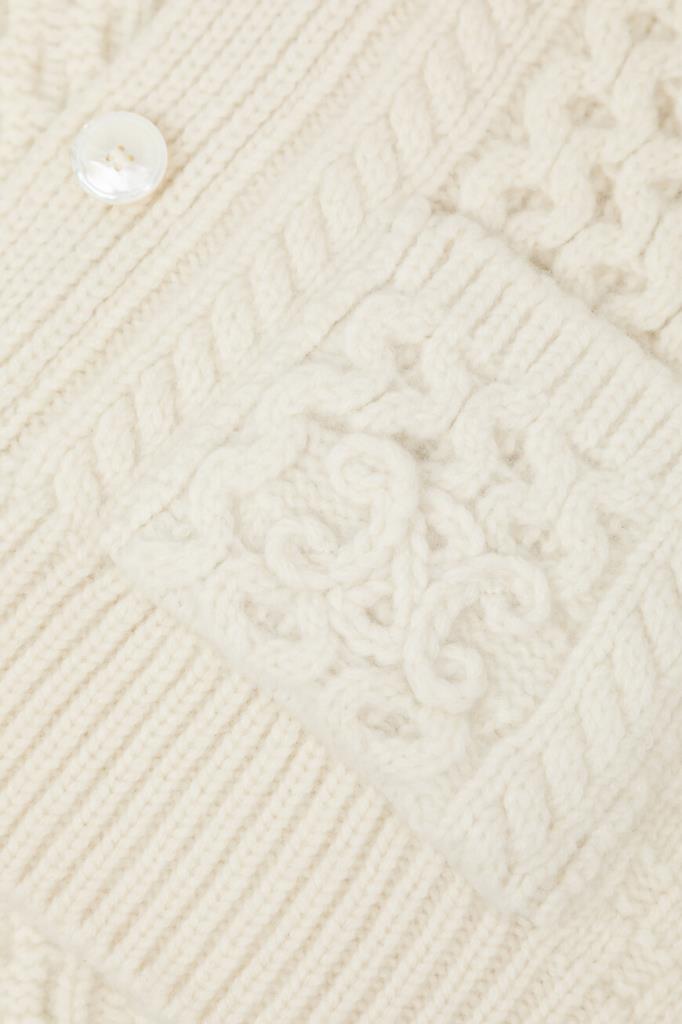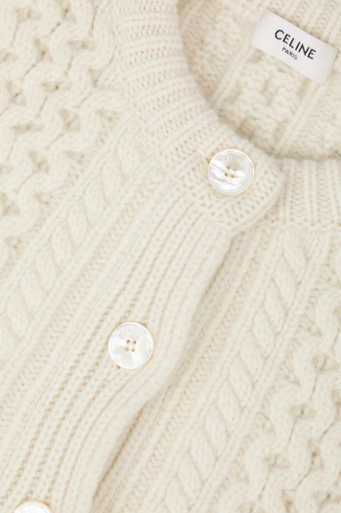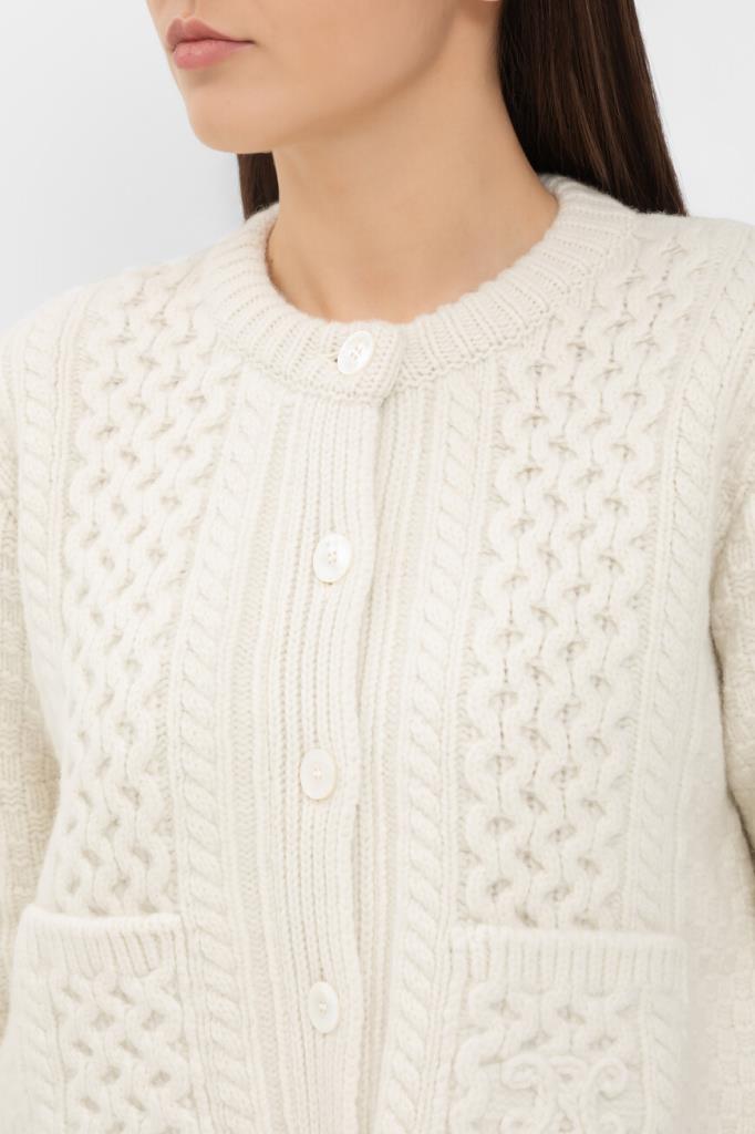 Шерстяной кардиган Celine на брендированных перламутровых пуговицах. Поверхность изделия прямого силуэта, выполненного в белом цвете, покрыта арановым узором в тон. Фасон повседневной модели предполагает наличие круглого выреза горловины и двух накладных карманов с отделкой в резинку по бокам. Атрибутом Дома является знаковый рельефный символ Triomphe на левом кармане.