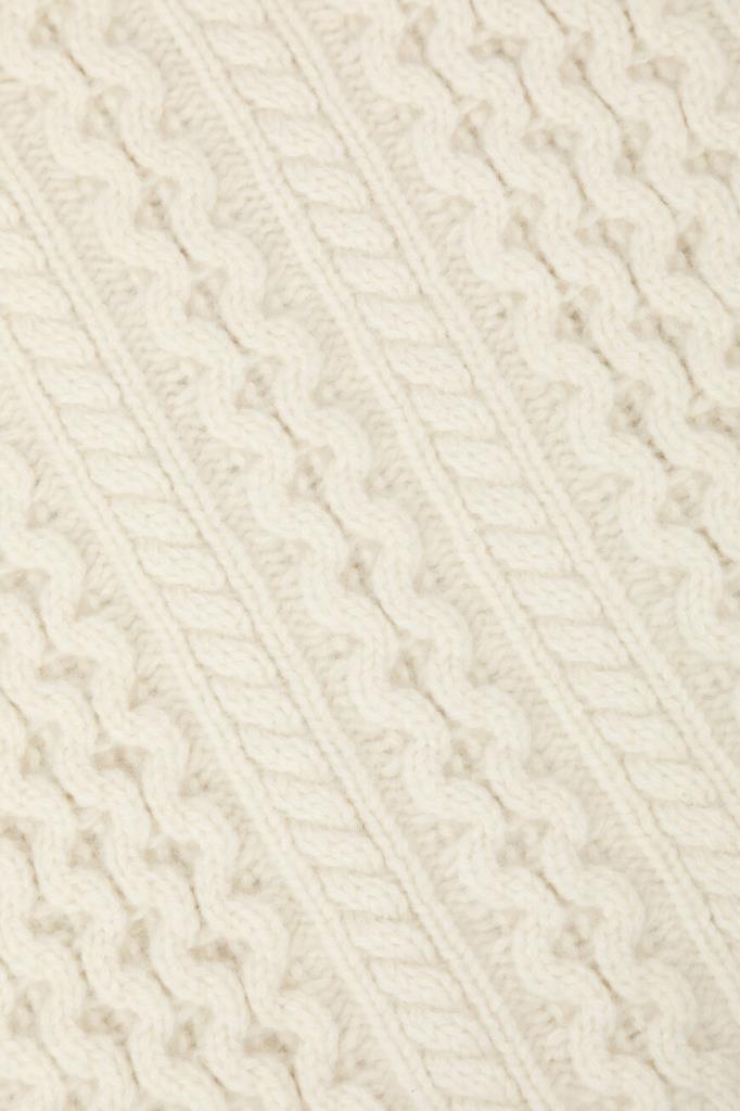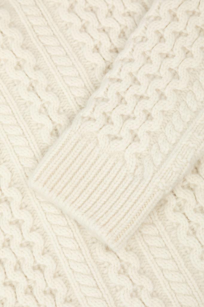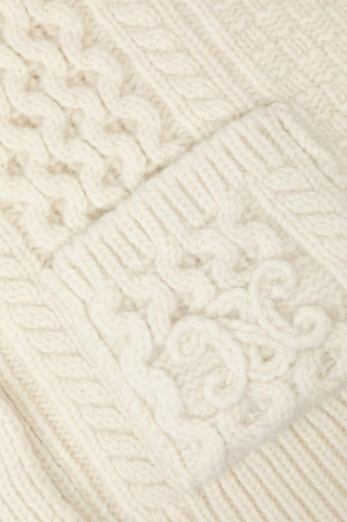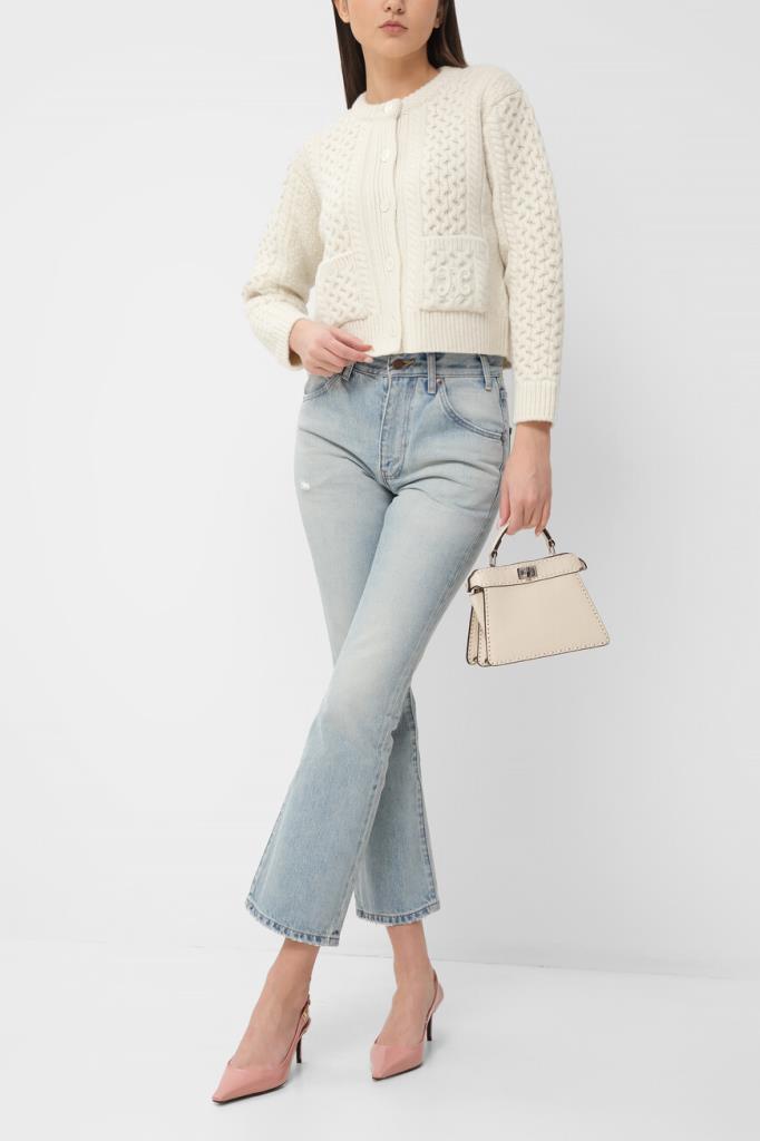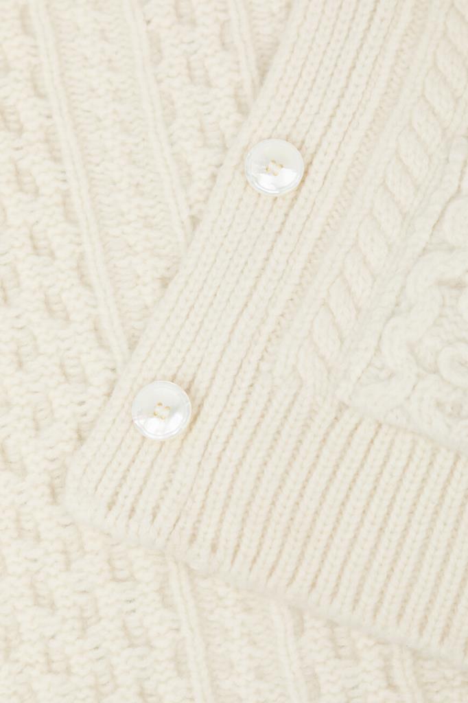 Шерстяной кардиган Celine на брендированных перламутровых пуговицах. Поверхность изделия прямого силуэта, выполненного в белом цвете, покрыта арановым узором в тон. Фасон повседневной модели предполагает наличие круглого выреза горловины и двух накладных карманов с отделкой в резинку по бокам. Атрибутом Дома является знаковый рельефный символ Triomphe на левом кармане.