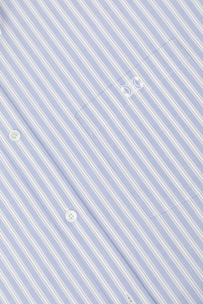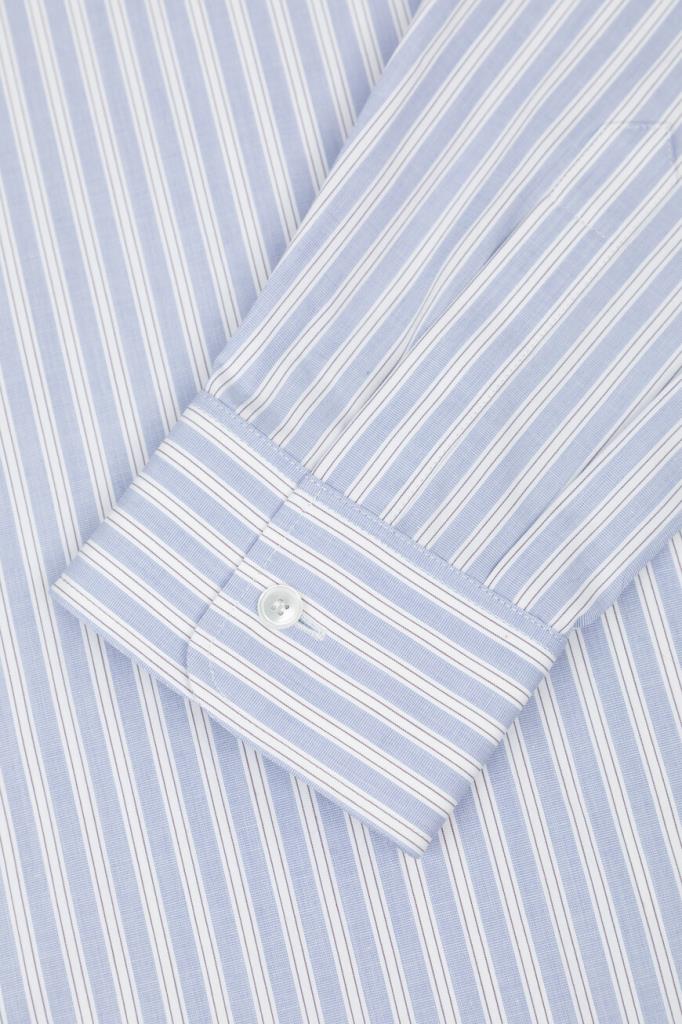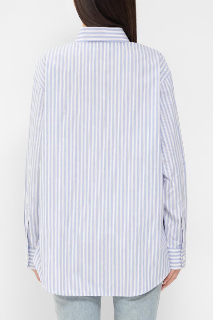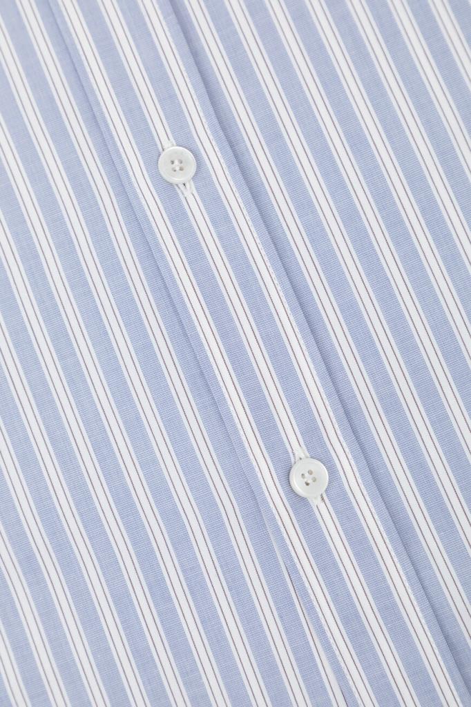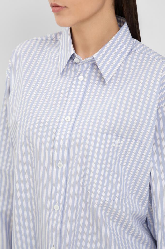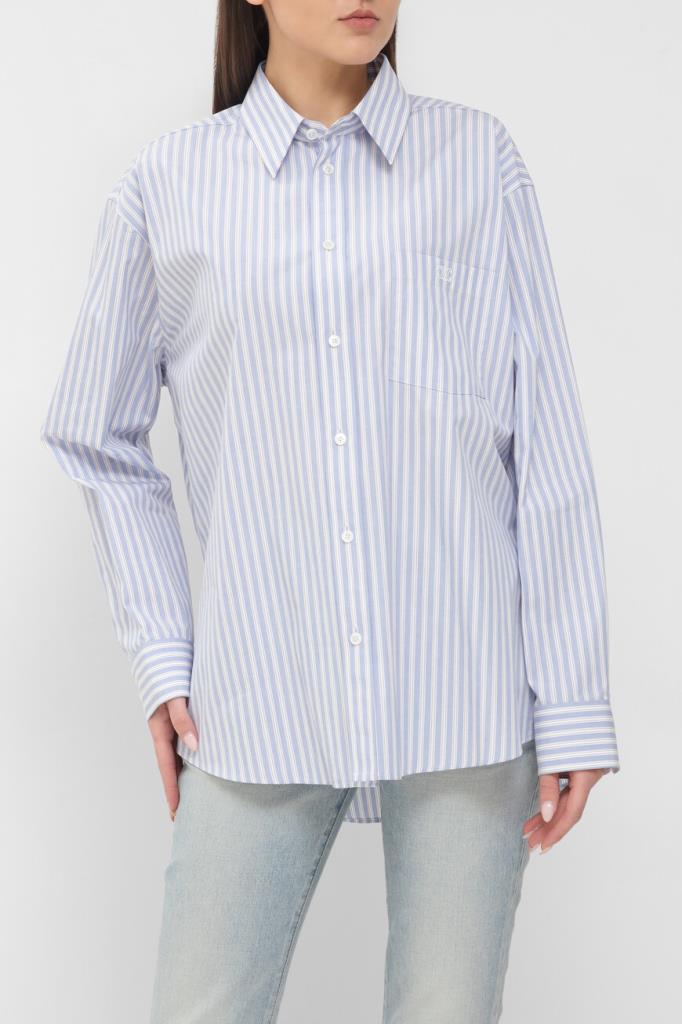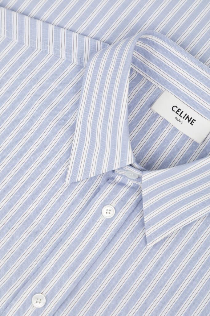 Полосатая рубашка оверсайз от Celine в бело-сине-коричневой гамме. Изделие, сшитое из мягкого хлопкового поплина, отличается наличием длинных рукавов и застёжкой на перламутровые пуговицы. Принадлежность повседневной модели Дому обозначена вышитым белым символом Triomphe на нагрудном накладном кармане слева.