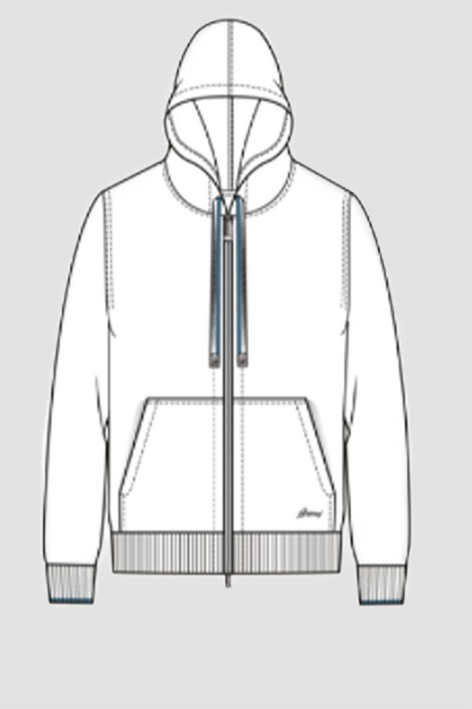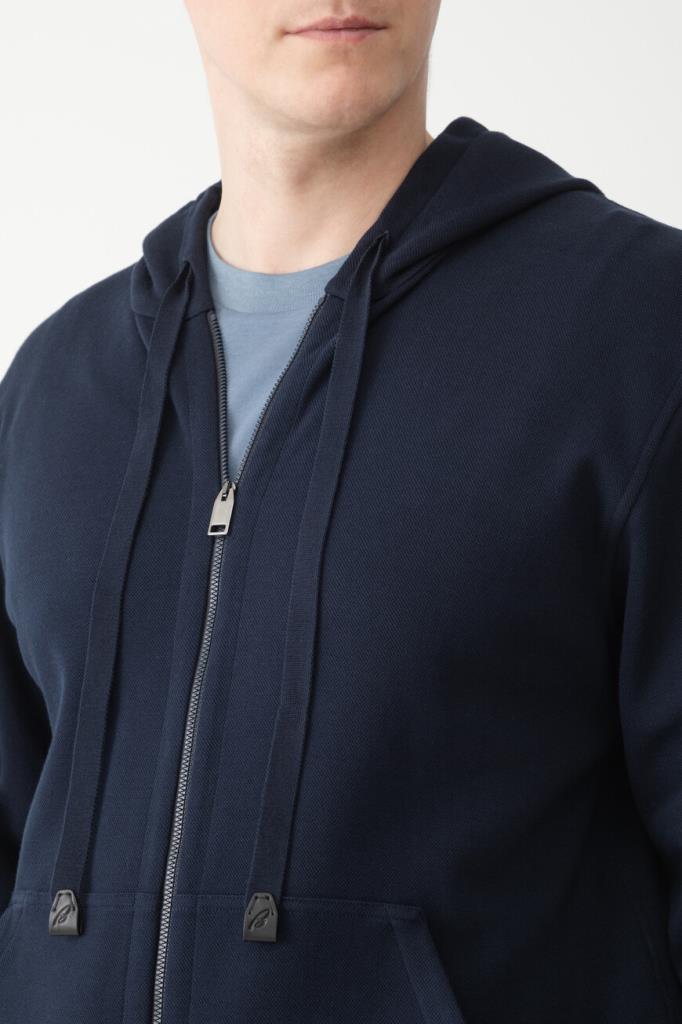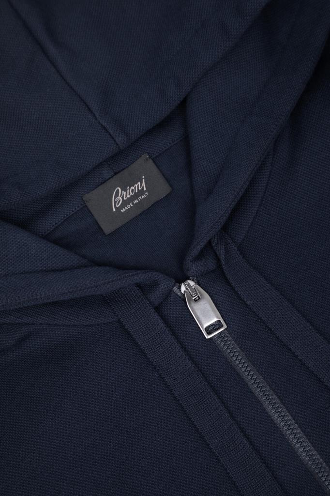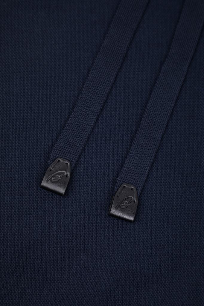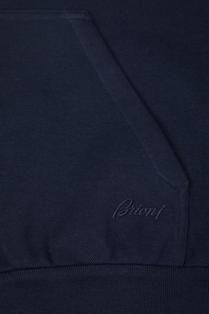 Трикотажная толстовка прямого силуэта от Brioni. Для создания изделия используются хлопок и прочный нейлон тёмно-синего цвета с фактурной поверхностью. Конструкция спортивной модели предполагает наличие глубокого капюшона на завязках с брендированными кожаными наконечниками чёрного цвета и двух крупных накладных карманов по бокам. Сочетайте толстовку с брюками из пике на кулиске из той же коллекции.