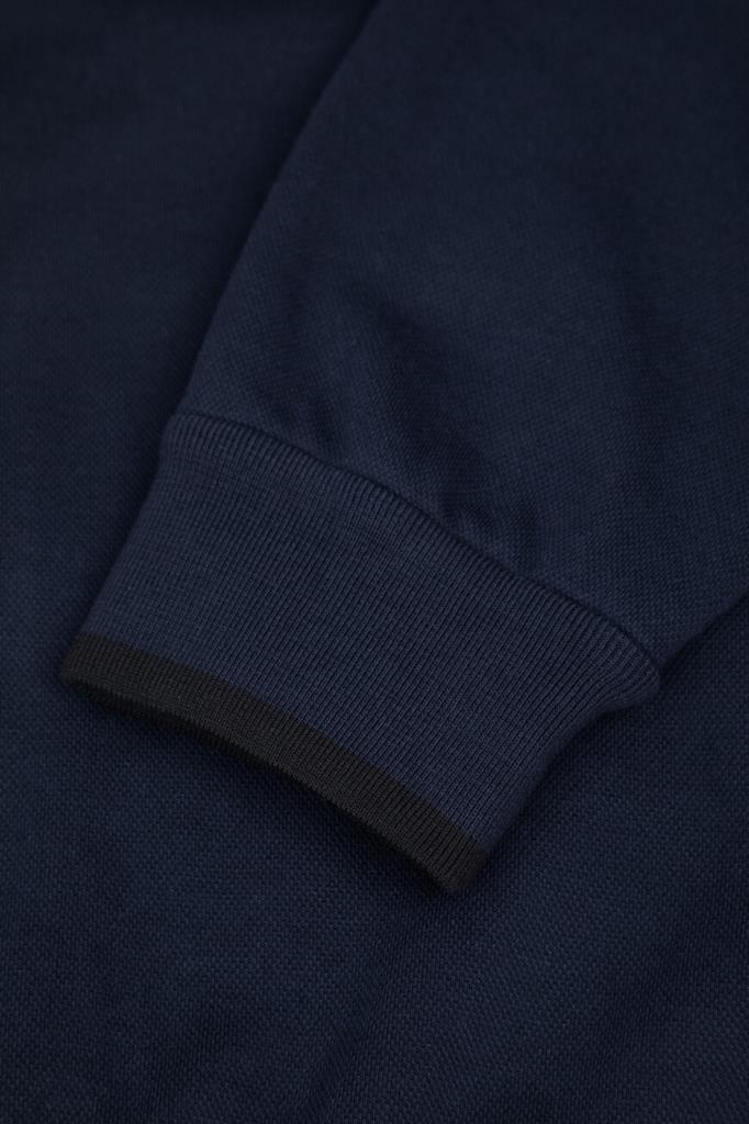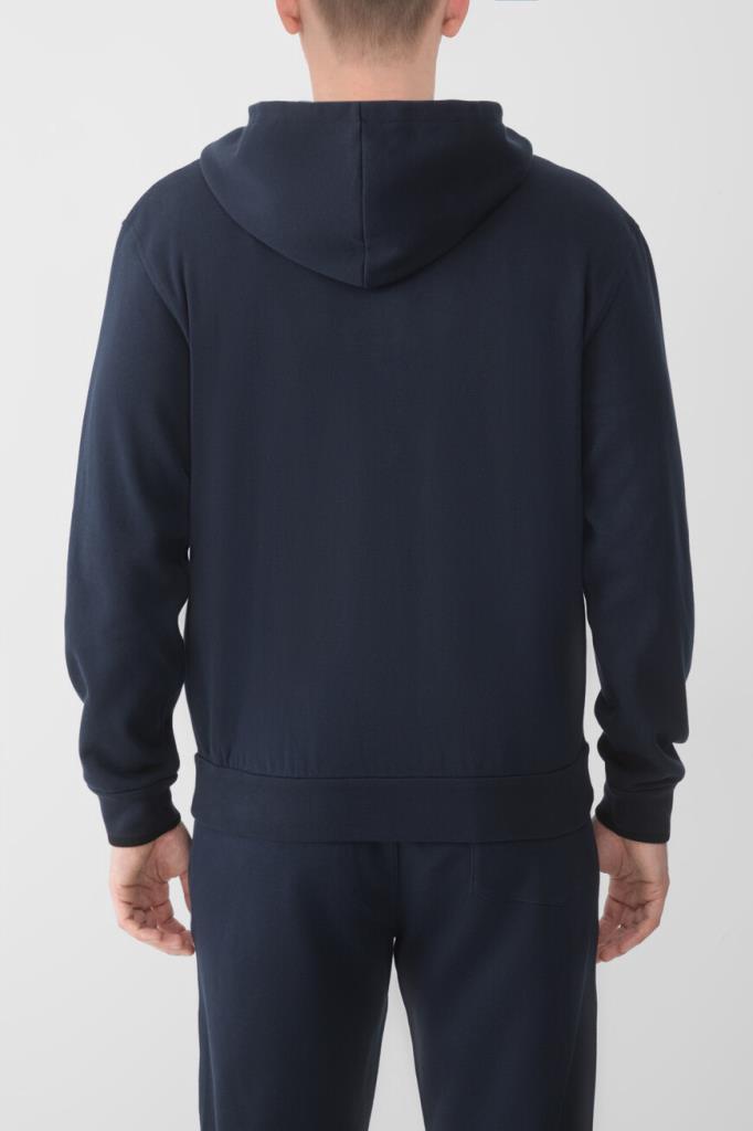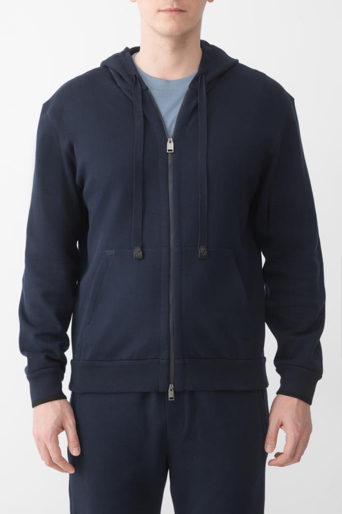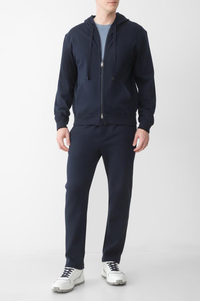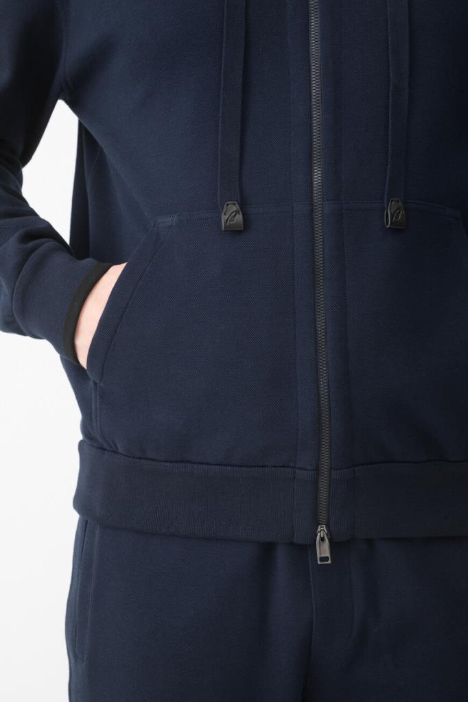 Трикотажная толстовка прямого силуэта от Brioni. Для создания изделия используются хлопок и прочный нейлон тёмно-синего цвета с фактурной поверхностью. Конструкция спортивной модели предполагает наличие глубокого капюшона на завязках с брендированными кожаными наконечниками чёрного цвета и двух крупных накладных карманов по бокам. Сочетайте толстовку с брюками из пике на кулиске из той же коллекции.