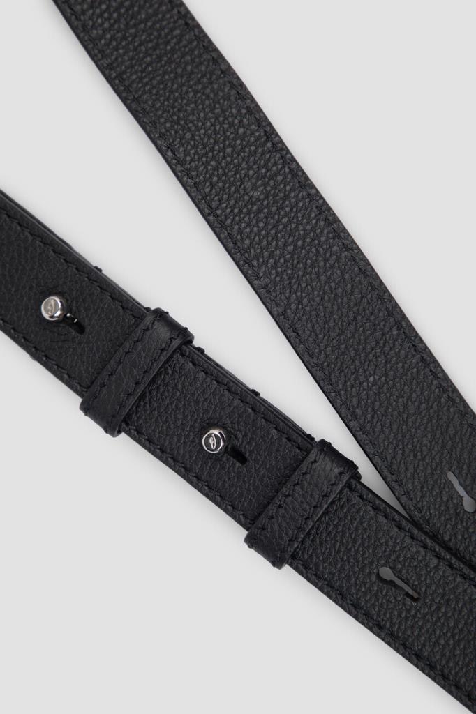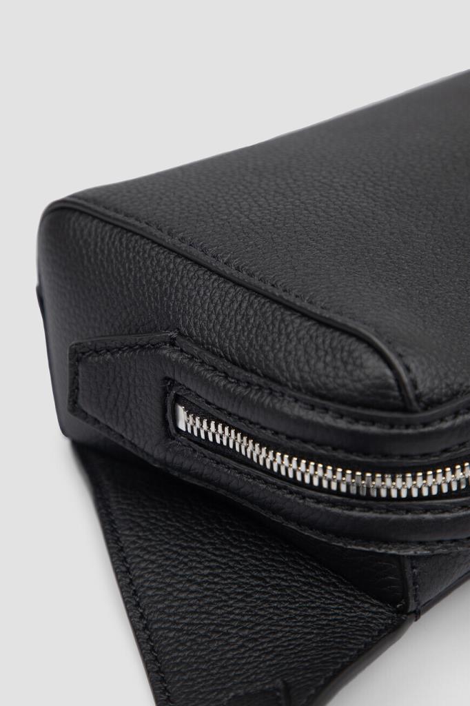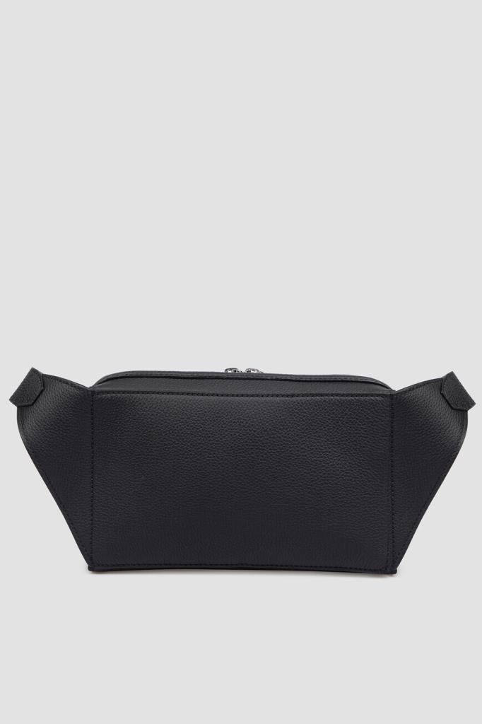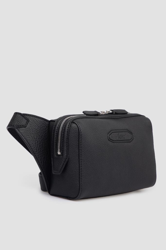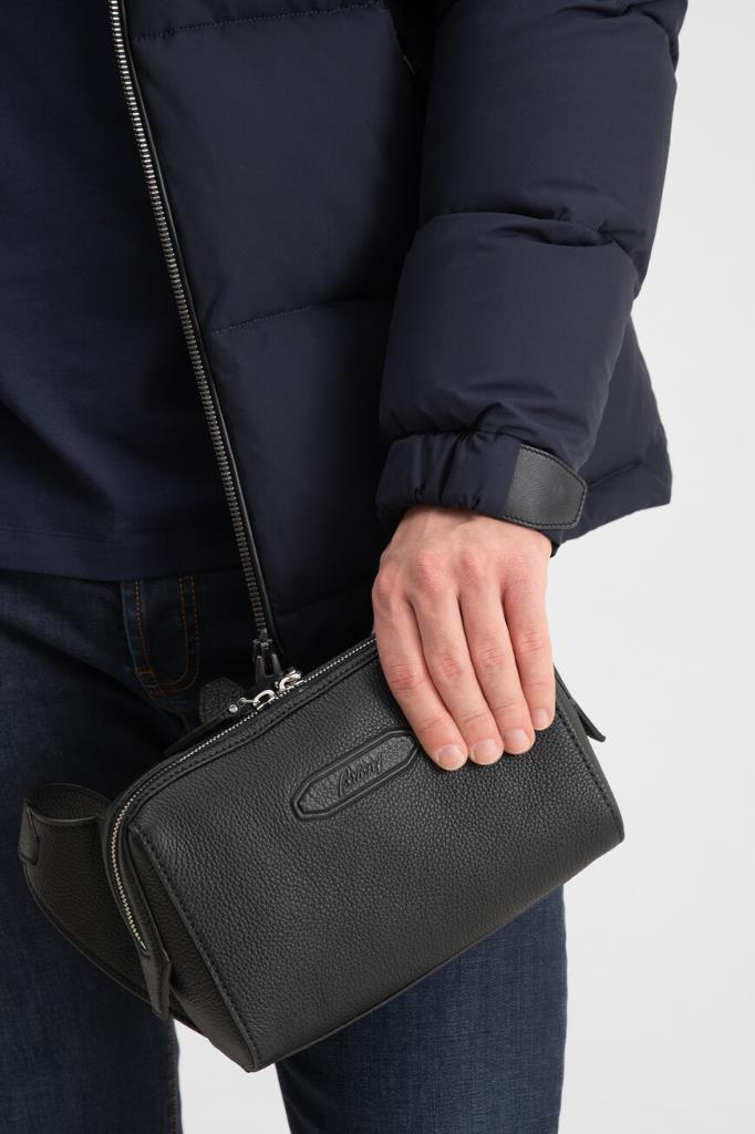 Поясная сумка чёрного цвета от Brioni. Модель изготовлена из мягкой кожи телёнка с зернистой текстурой. Изделие отличается наличием просторного внутреннего отделения на молнии с двумя пуллерами. Принадлежность аксессуара Дому обозначена фигурной вставкой с логотипом спереди.