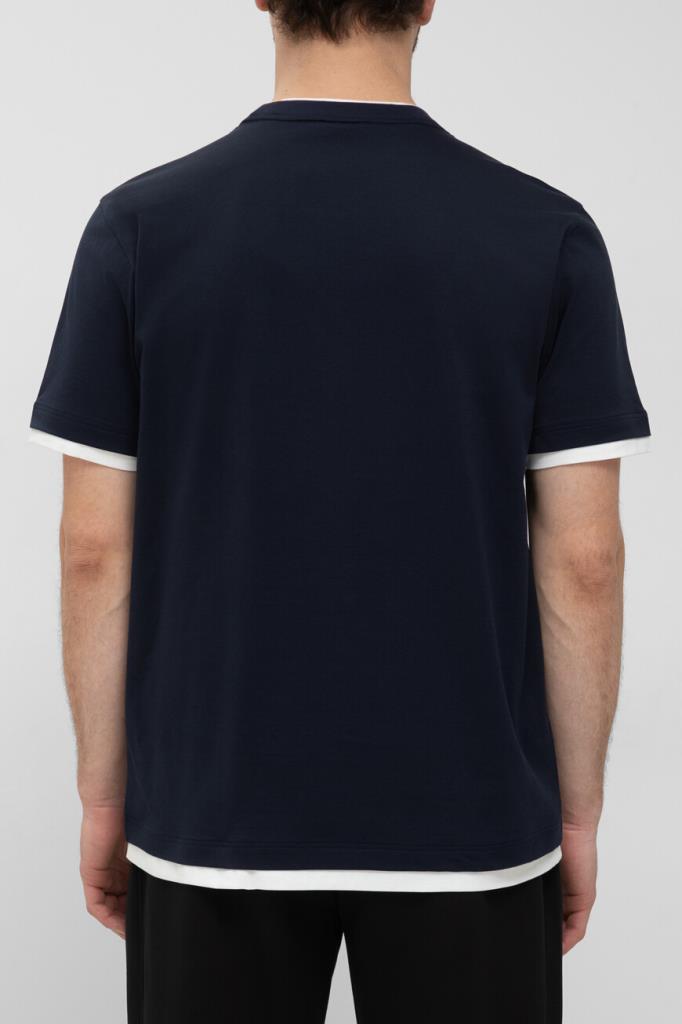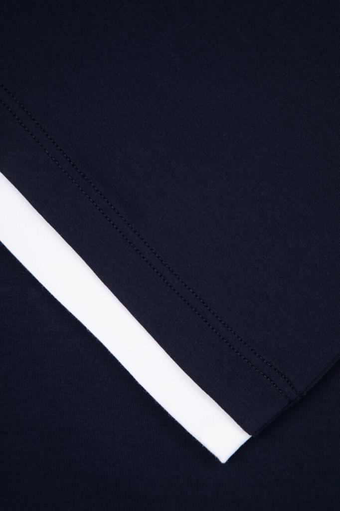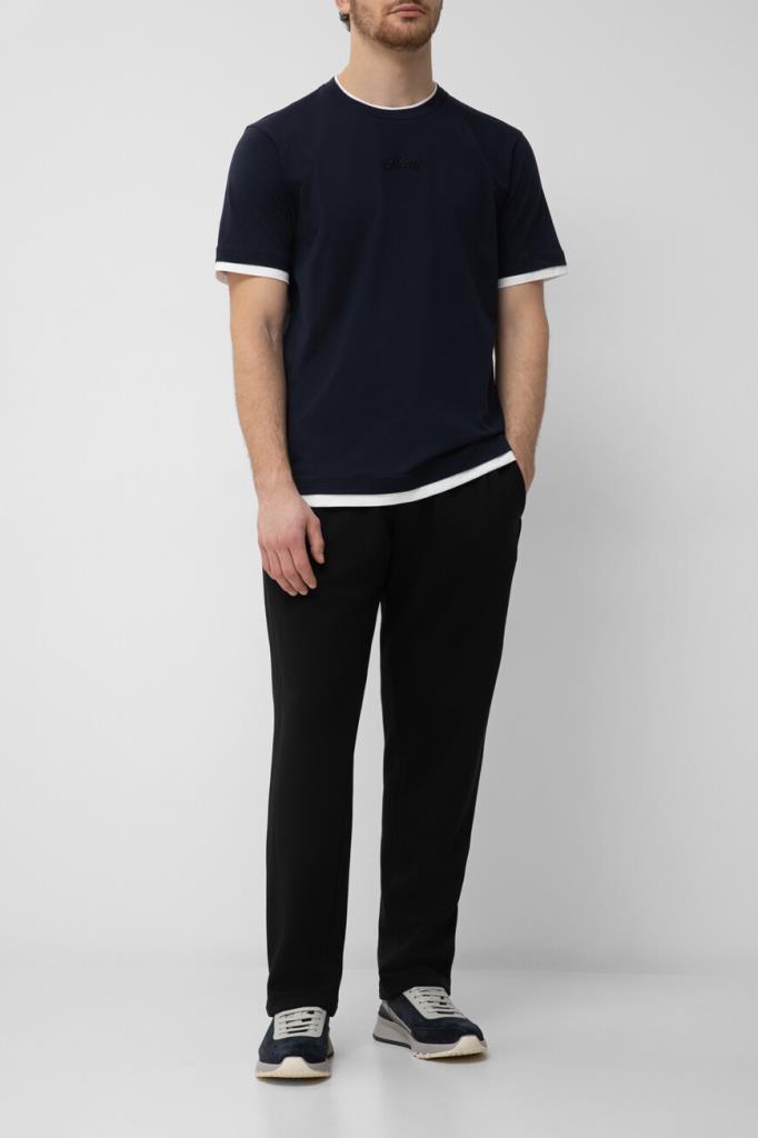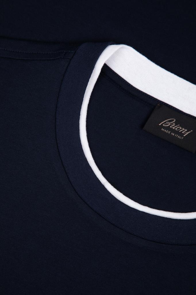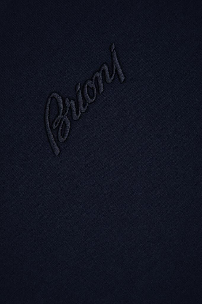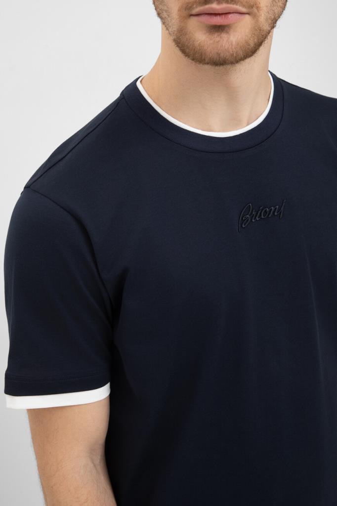 Футболка с вышитым логотипом Brioni спереди по центру. Модель изготовлена из мягкого хлопкового трикотажа тёмно-синего цвета. Акцентной деталью стал белый кант на воротнике, манжетах рукавов и поясе, создающий двухслойный эффект наложения. Образ можно дополнить синими джинсами с эффектом делаве и замшевыми сникерами New Tennis из той же коллекции.