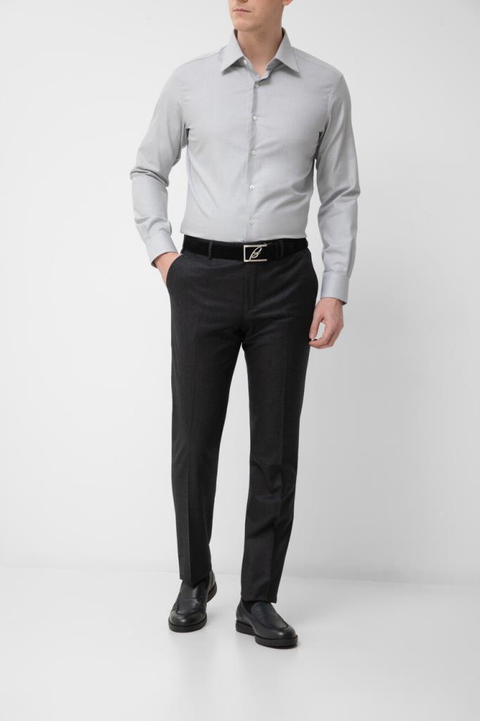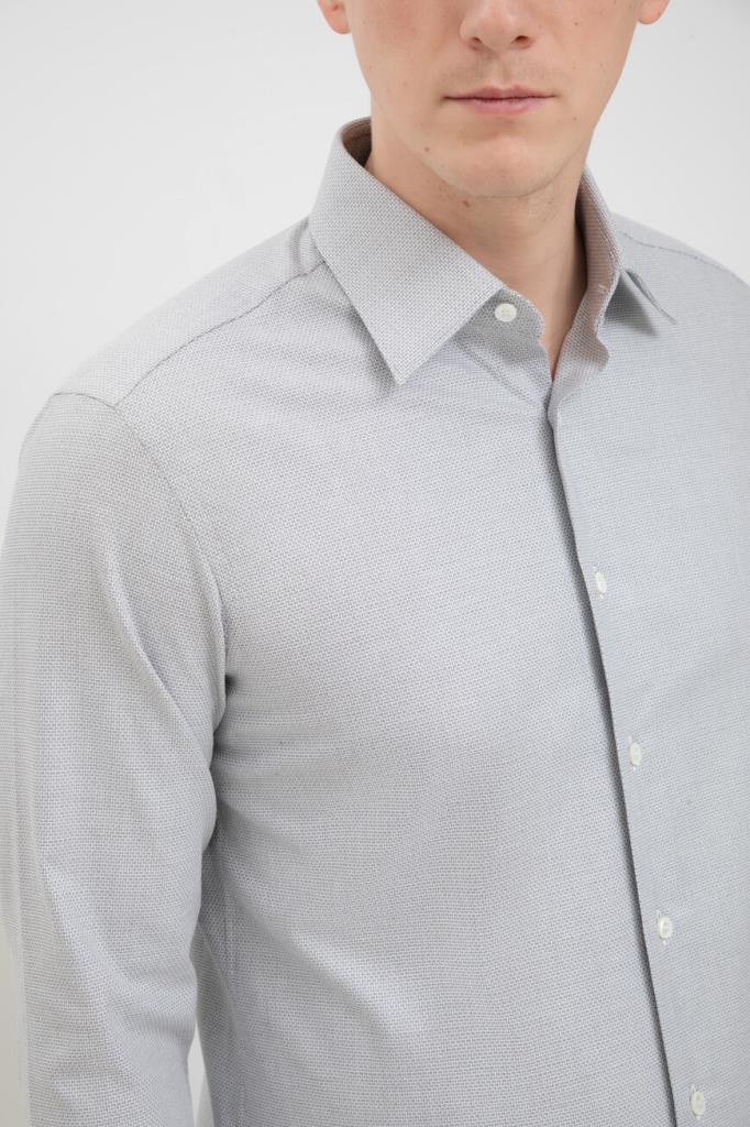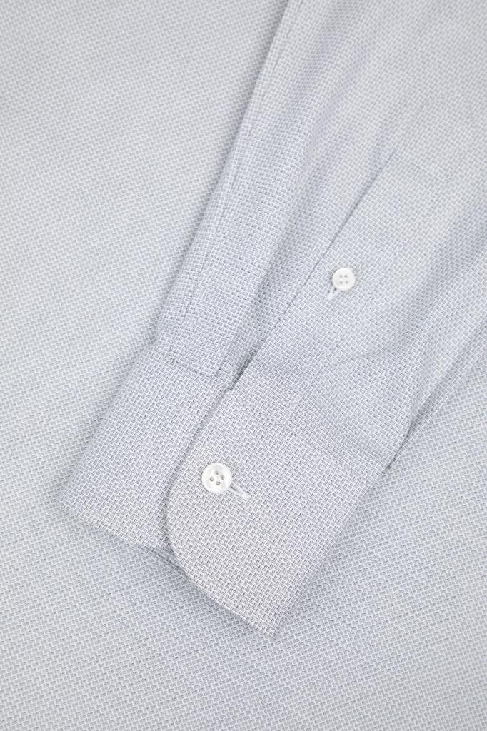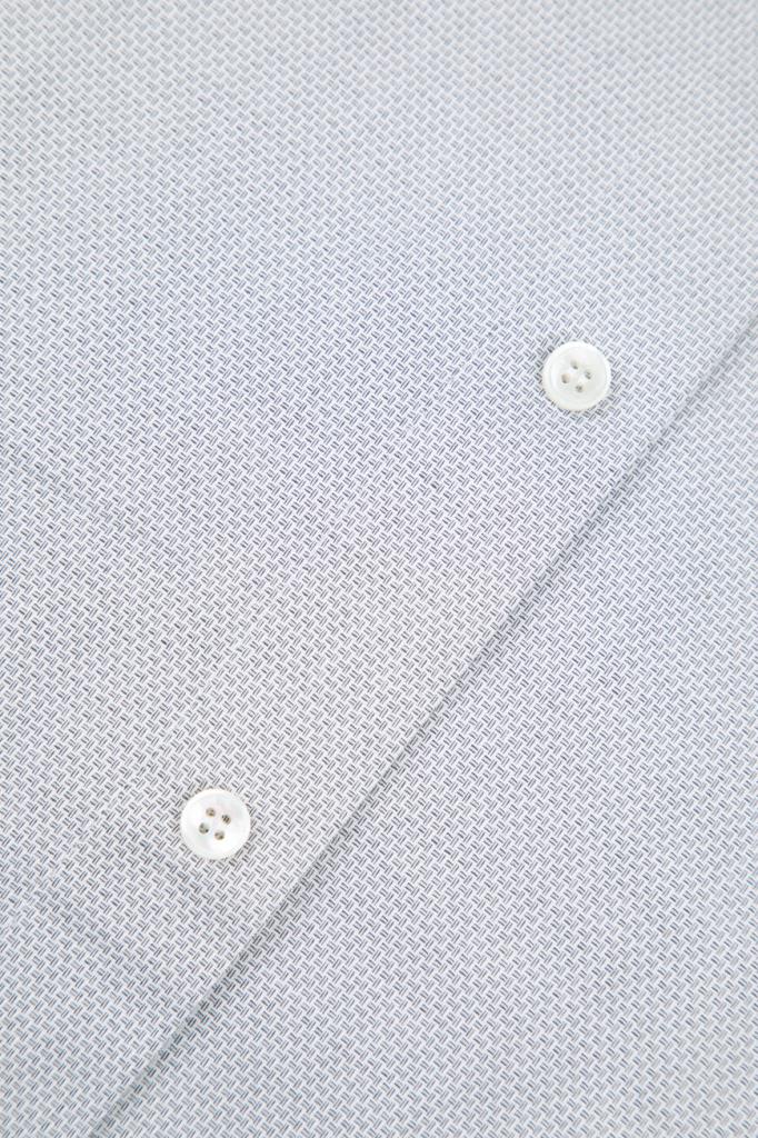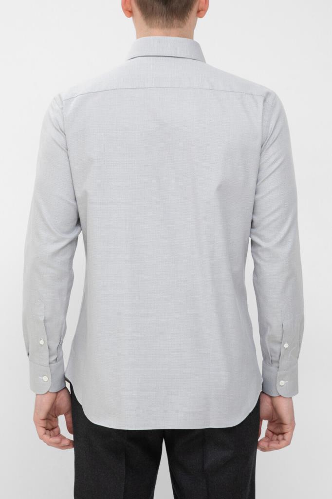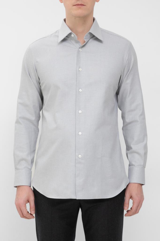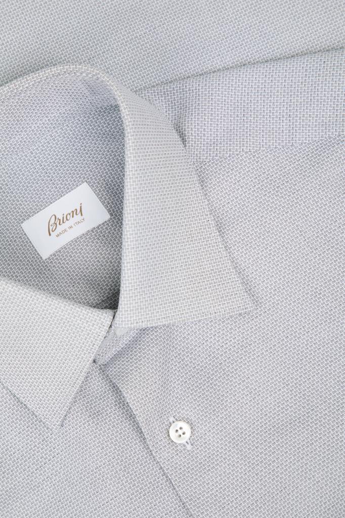 Хлопковая рубашка Brioni белого цвета с геометрическим мотивом в серой гамме. Классическая модель прилегающего силуэта отличается наличием длинных рукавов и застёжкой на перламутровые пуговицы. Дополнительный комфорт и удобство в носке обеспечивают неглубокие боковые разрезы.