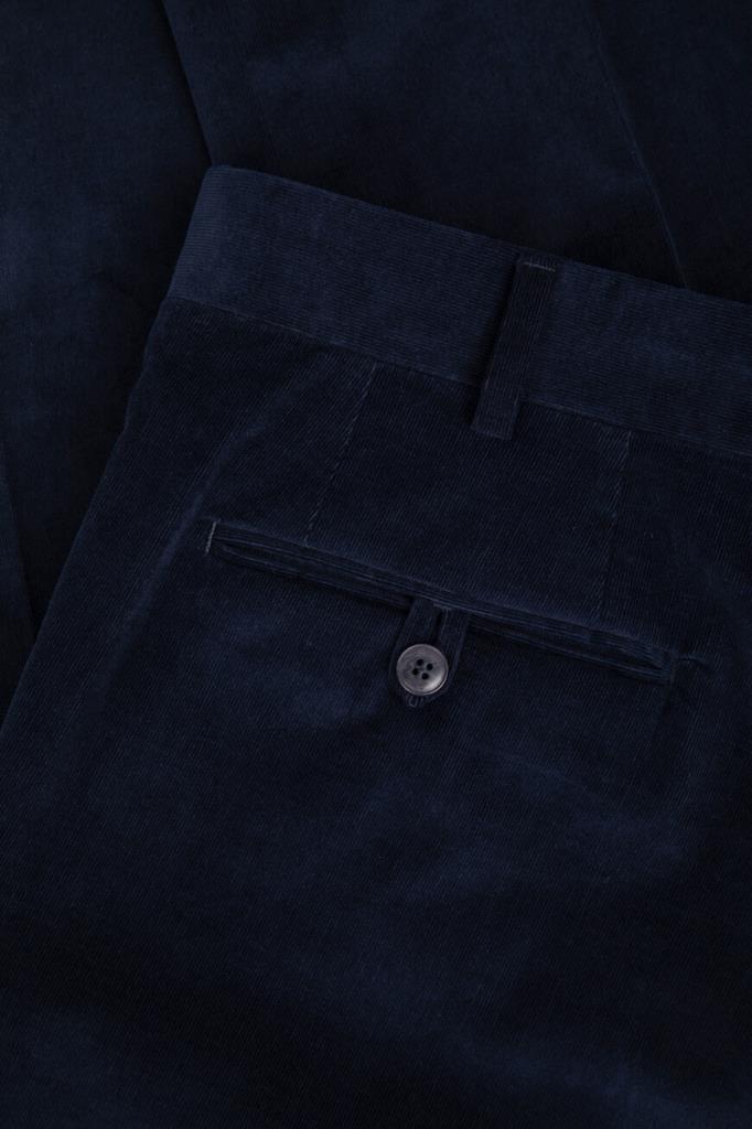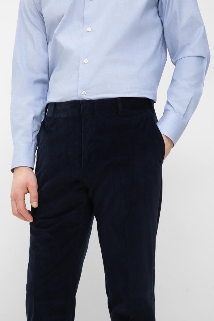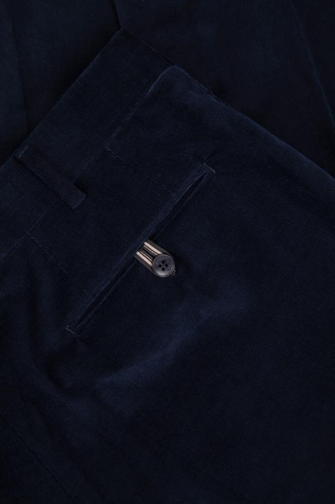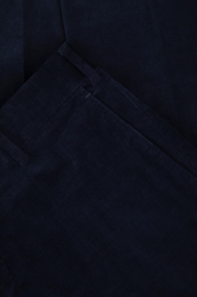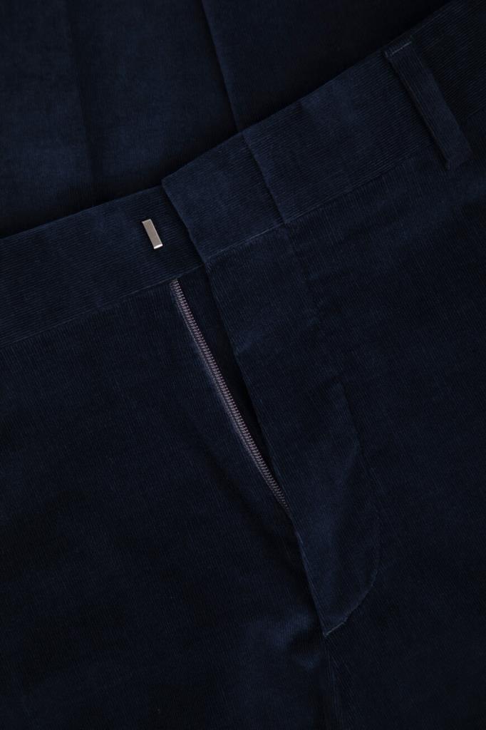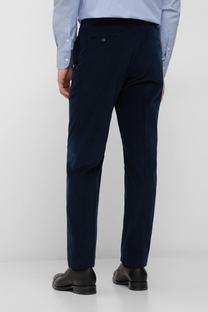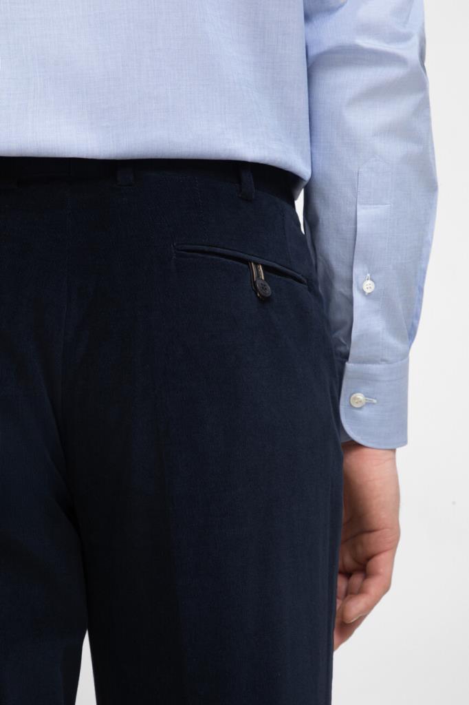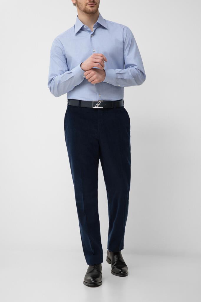 Тёмно-синие брюки прямого силуэта от Brioni. Изделие выполнено из эластичного хлопкового вельвета и дополнено четырьмя прорезными карманами: двумя с диагональным входом по бокам и двумя на роговой пуговице с полосатой петелькой в задней части. Модель комфортно садится по фигуре благодаря застёжке на потайную молнию и крючок с планкой. Брюки сочетаются с классической сорочкой с длинными рукавами из той же коллекции Дома.