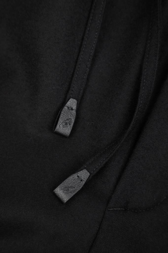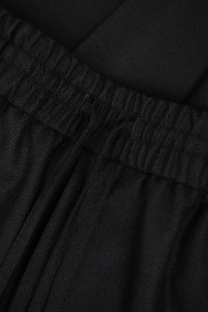 Фланелевые брюки прямого силуэта от Brioni. Широкая модель средней посадки изготовлена на основе мягкой шерсти чёрного цвета и оснащена широким эластичным поясом на завязках. Изделие, выполненное в спортивном стиле, отличается наличием классических стрелок и четырёх прорезных карманов. Декором выступают тиснёные дизайнерские литеры «B» на кожаных наконечниках завязок.