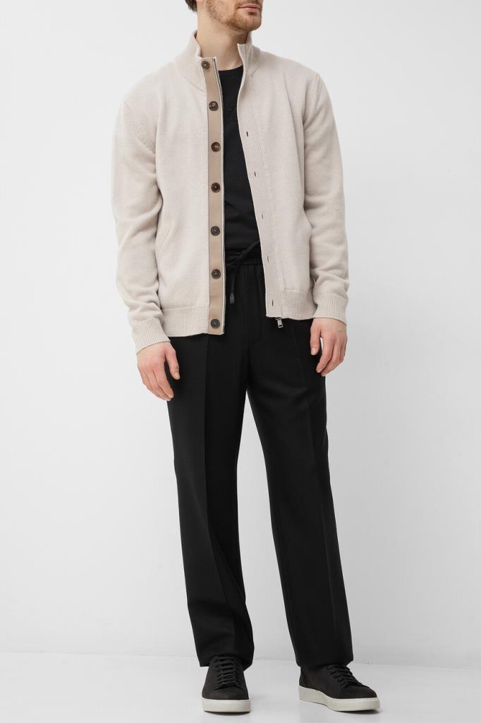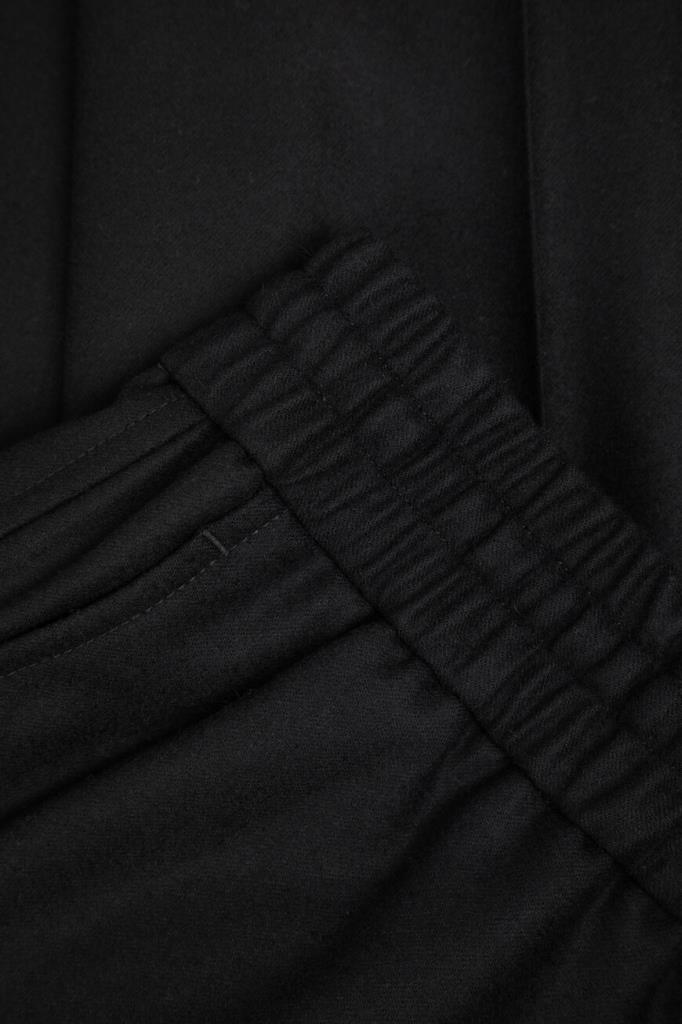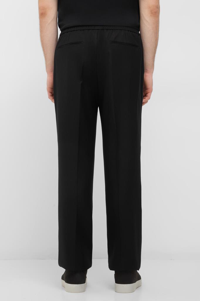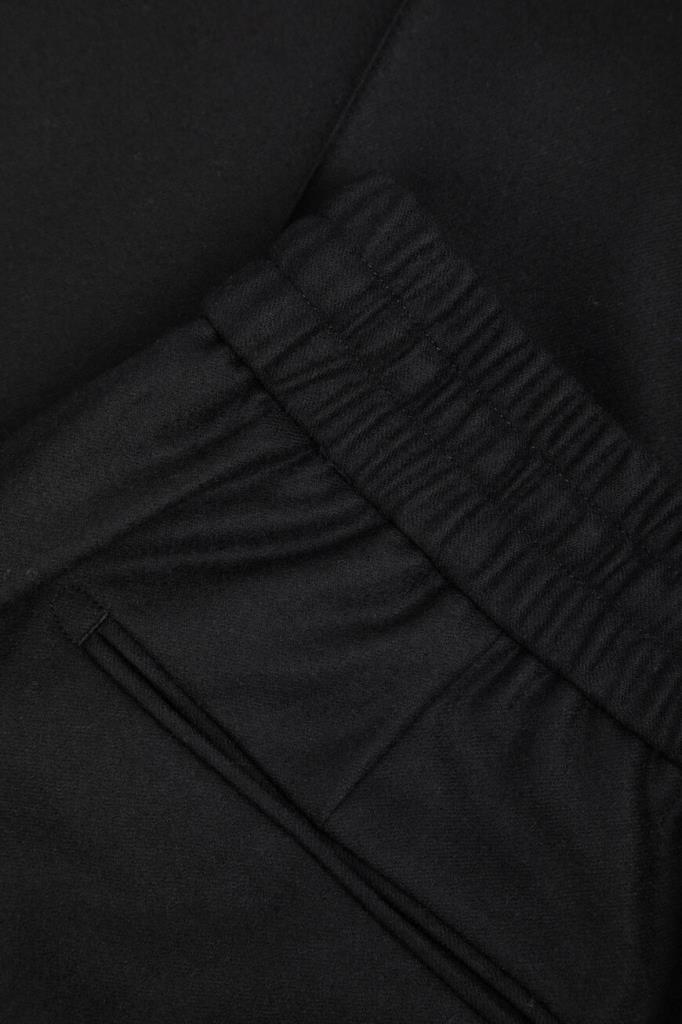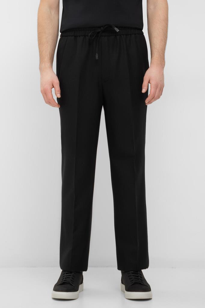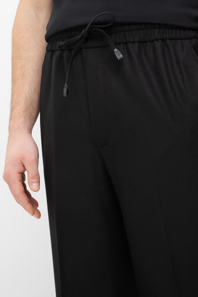 Фланелевые брюки прямого силуэта от Brioni. Широкая модель средней посадки изготовлена на основе мягкой шерсти чёрного цвета и оснащена широким эластичным поясом на завязках. Изделие, выполненное в спортивном стиле, отличается наличием классических стрелок и четырёх прорезных карманов. Декором выступают тиснёные дизайнерские литеры «B» на кожаных наконечниках завязок.