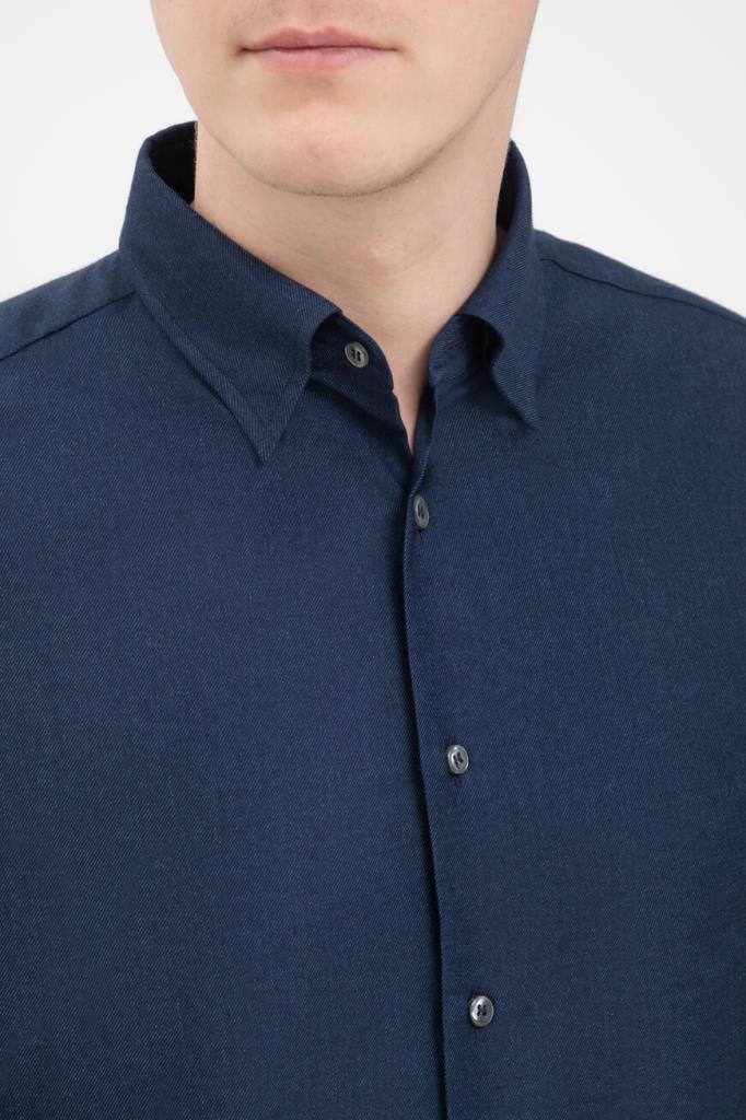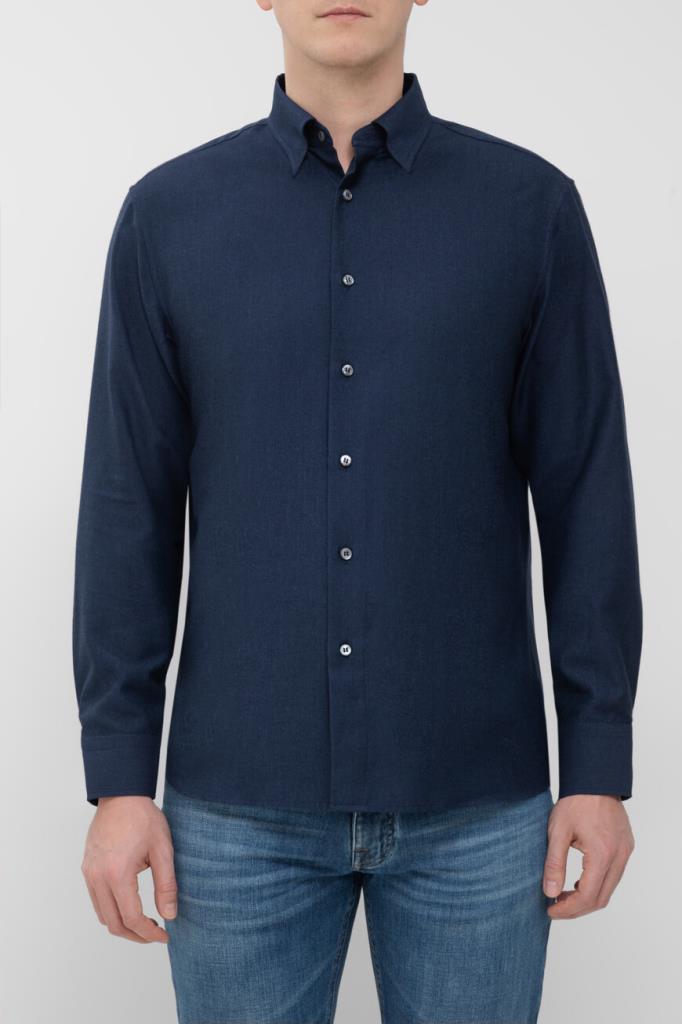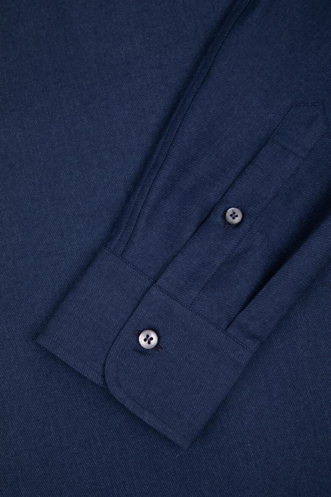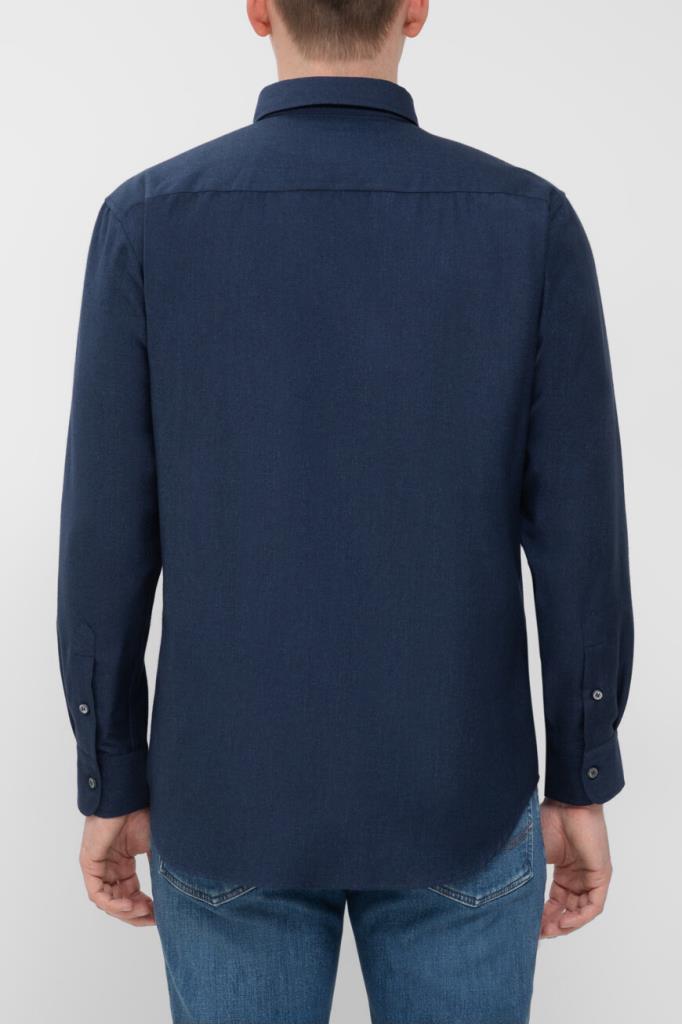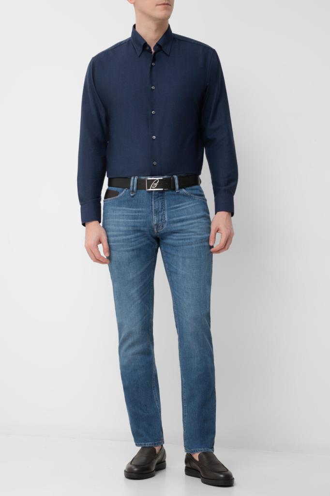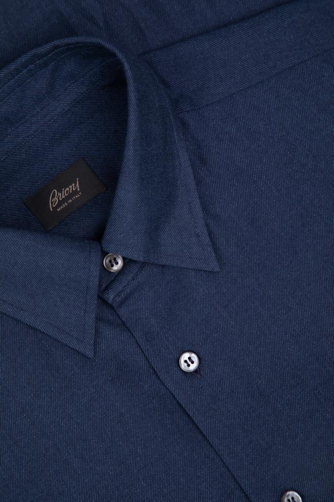 Рубашка Brioni тёмно-синего цвета с синей изнаночной стороной. Модель изготовлена из мягкого трикотажа на основе хлопка и кашемира с диагональным геометрическим мотивом в полоску. Изделие интересно наличием длинных рукавов с манжетами на роговых пуговицах и закруглённым низом. Дополните образ в стиле smart casual джинсами с эффектом делаве из той же коллекции Дома.