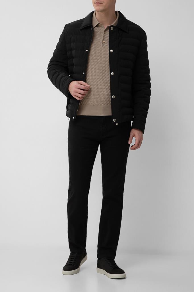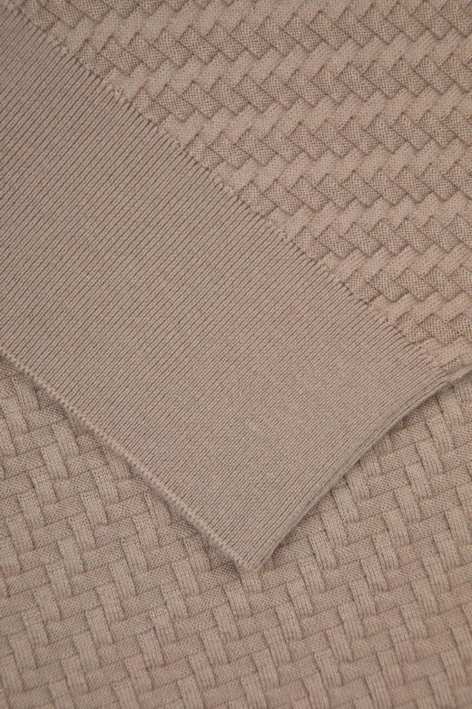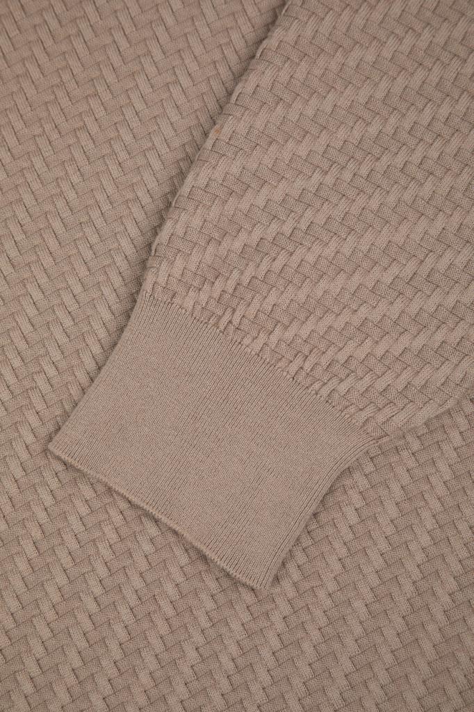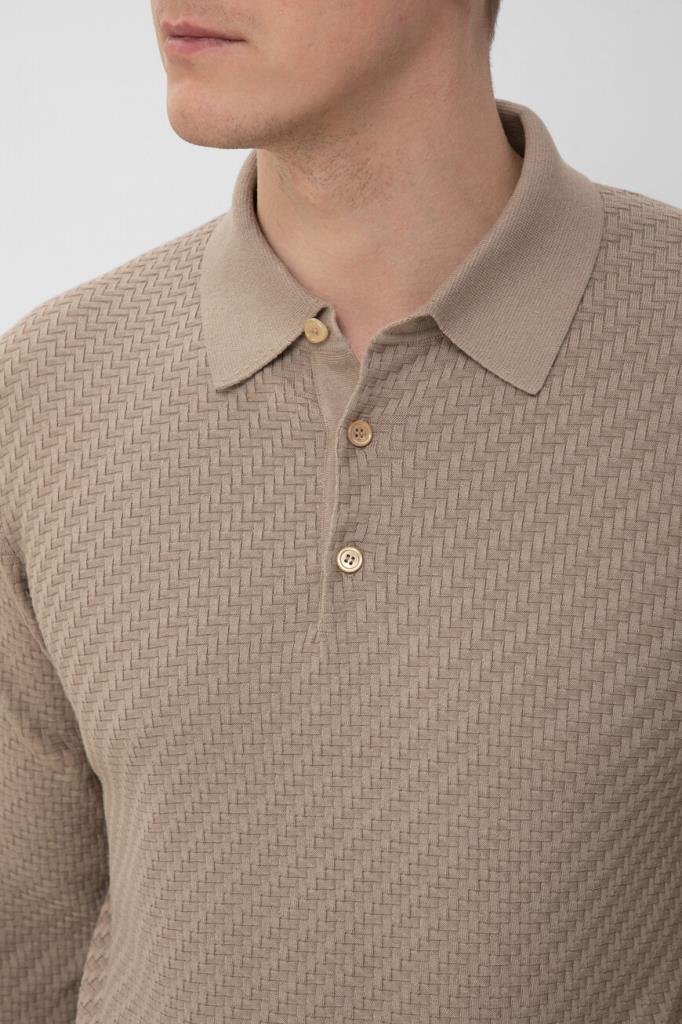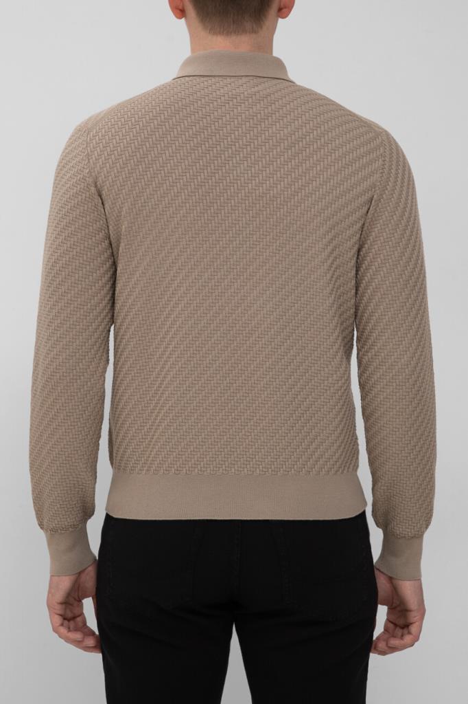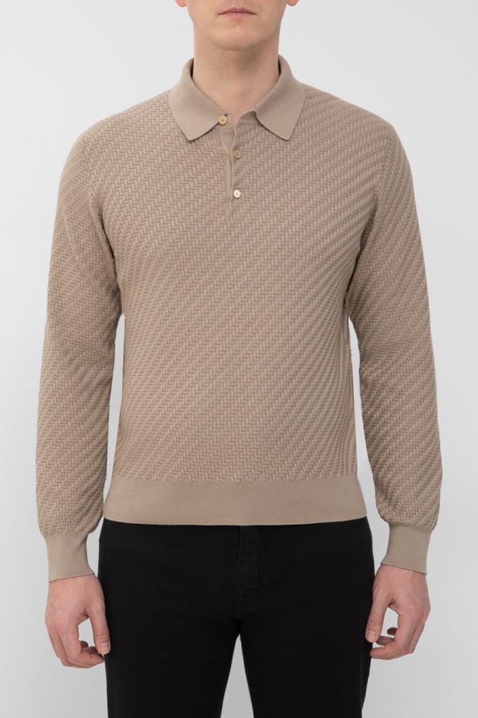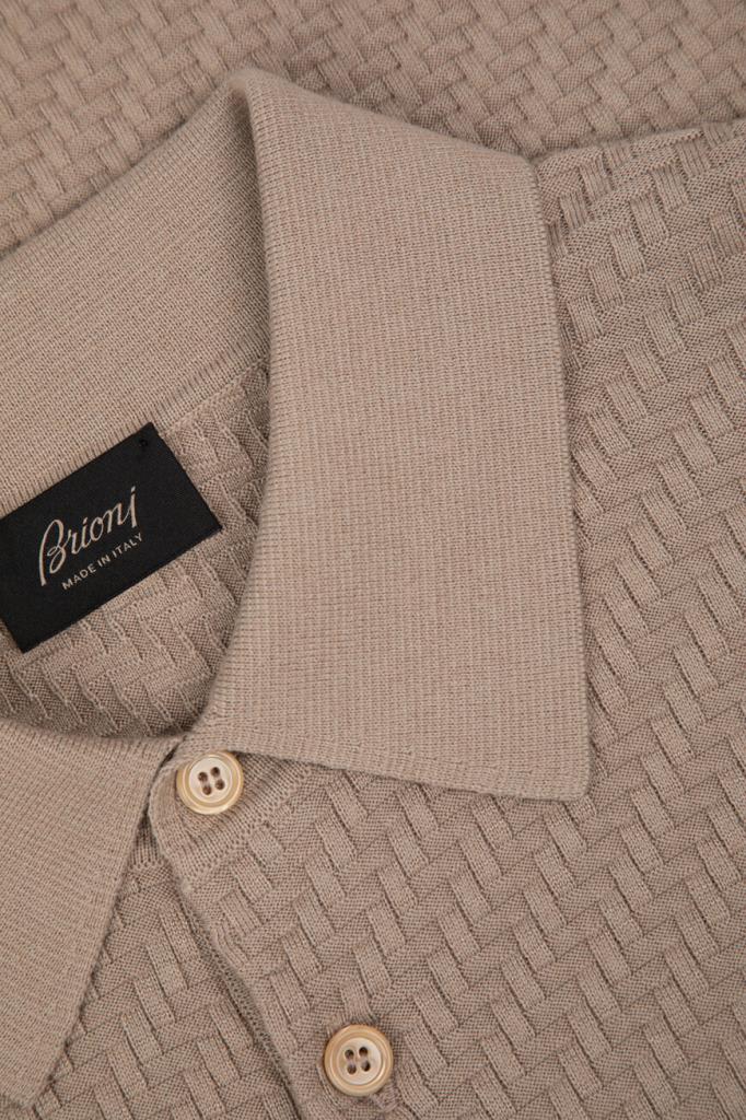 Трикотажное поло Brioni с длинными рукавами. Для создания изделия полуприлегающего силуэта выбраны мягкий хлопок, кашемир и гладкий шёлк бежевого оттенка. Поверхность повседневной модели покрыта геометрическим мотивом с эффектом плетения в тон. Объёмное переплетение Trama характеризуется однотонным рубчиком, который обеспечивает уникальные тактильные ощущения. Этот узор имитирует сампьетрино — камни, которыми вымощены улицы Рима. Легендарный рисунок, позаимствованный у Вечного города. Однородные отложной воротник, манжеты рукавов и широкий пояс оформлены резинкой для оптимальной посадки.