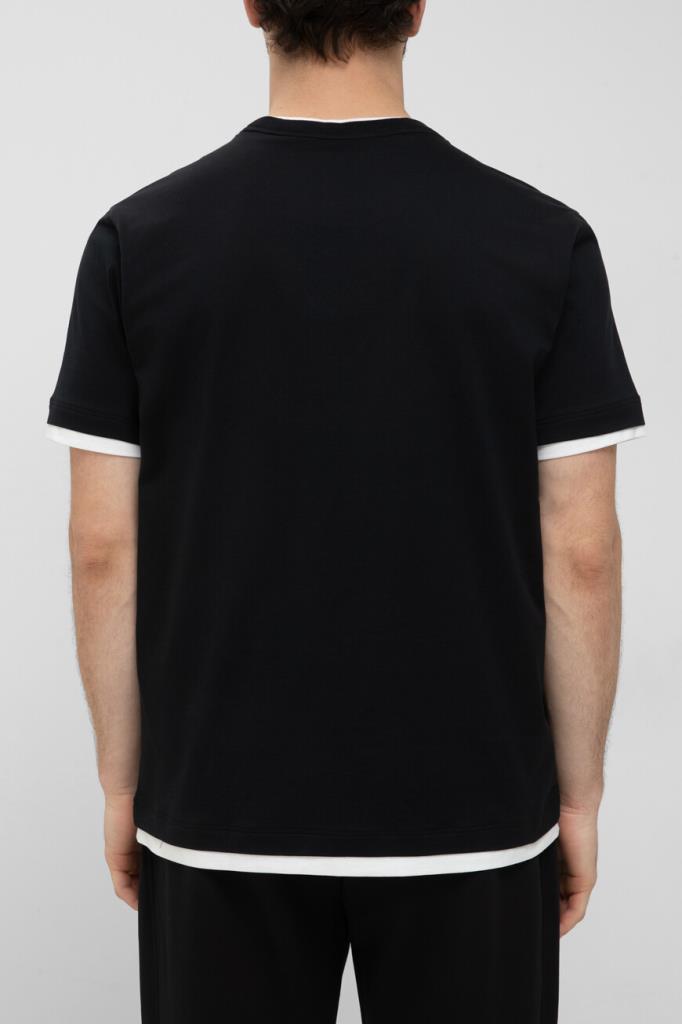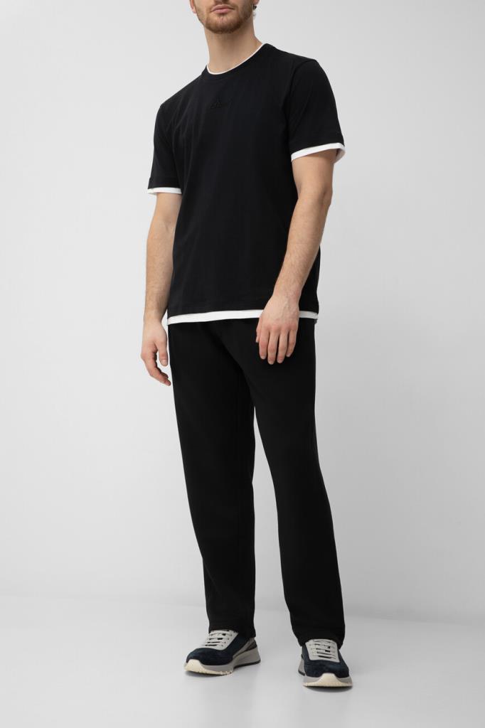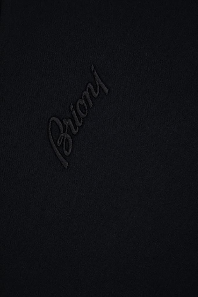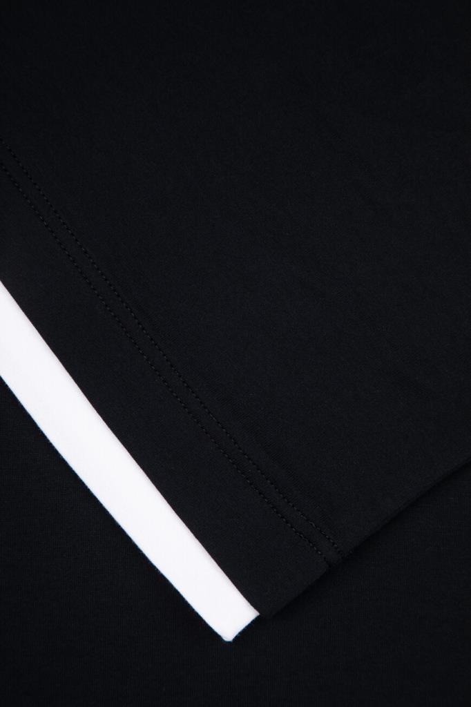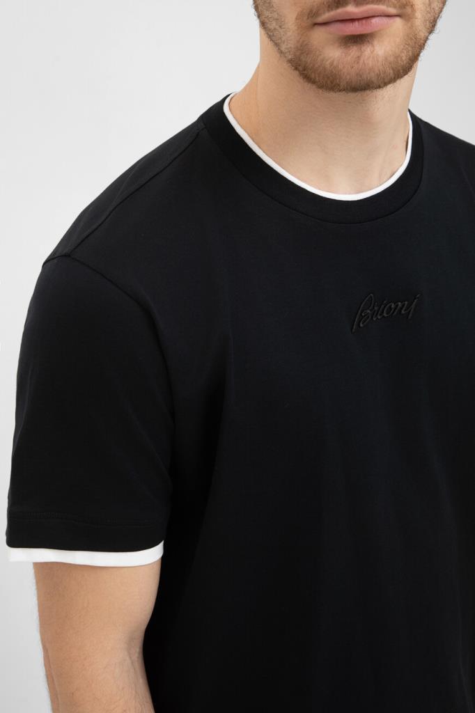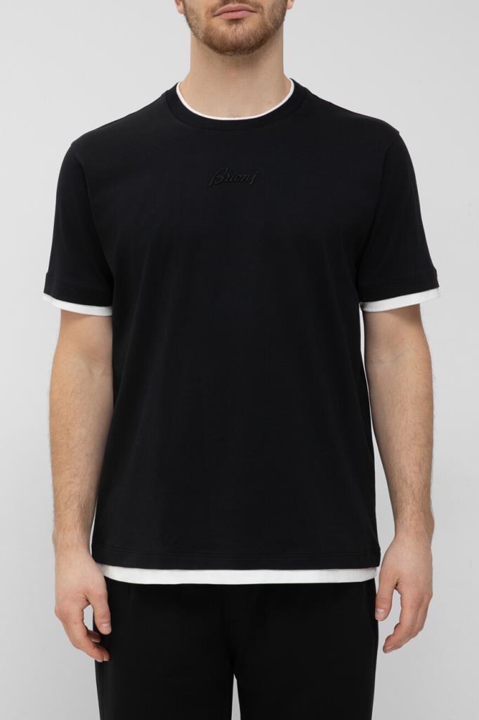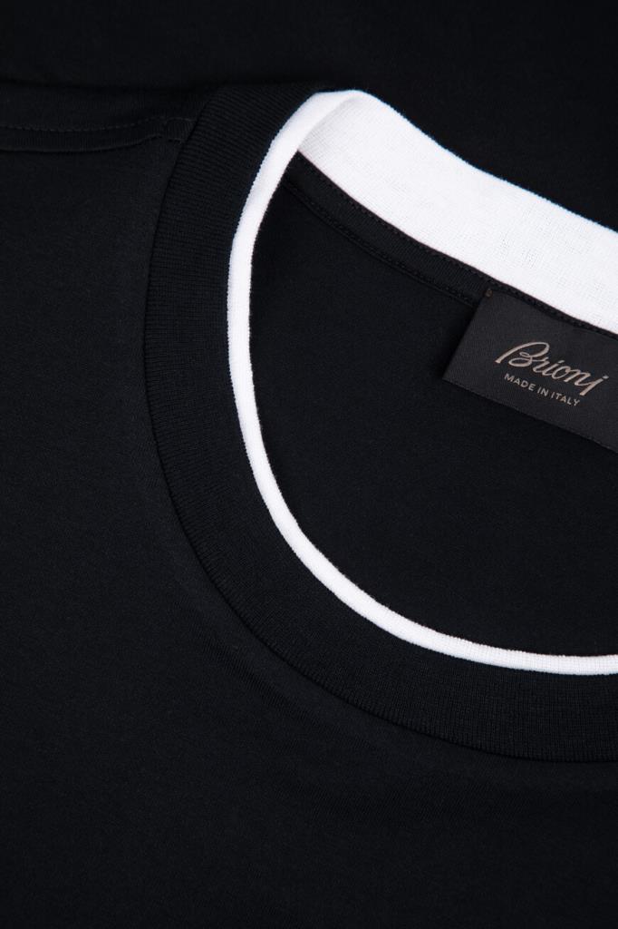Хлопковая футболка Brioni чёрного цвета с контрастными полосами-кантом. Модель содержит органический хлопок с сертификатом GOTS - добровольным стандартом, соответствие которому подтверждается независимой сторонней проверкой. Детали белого цвета на воротнике, манжетах рукавов и поясе создают двухслойный эффект наложения. Принадлежность изделия Дому деликатно обозначена вышитым логотипом в тон спереди по центру.