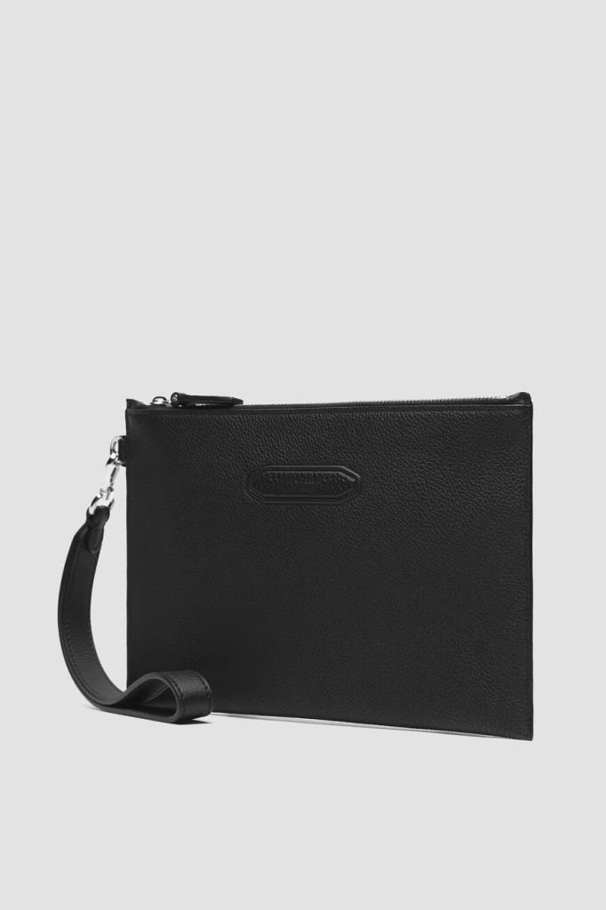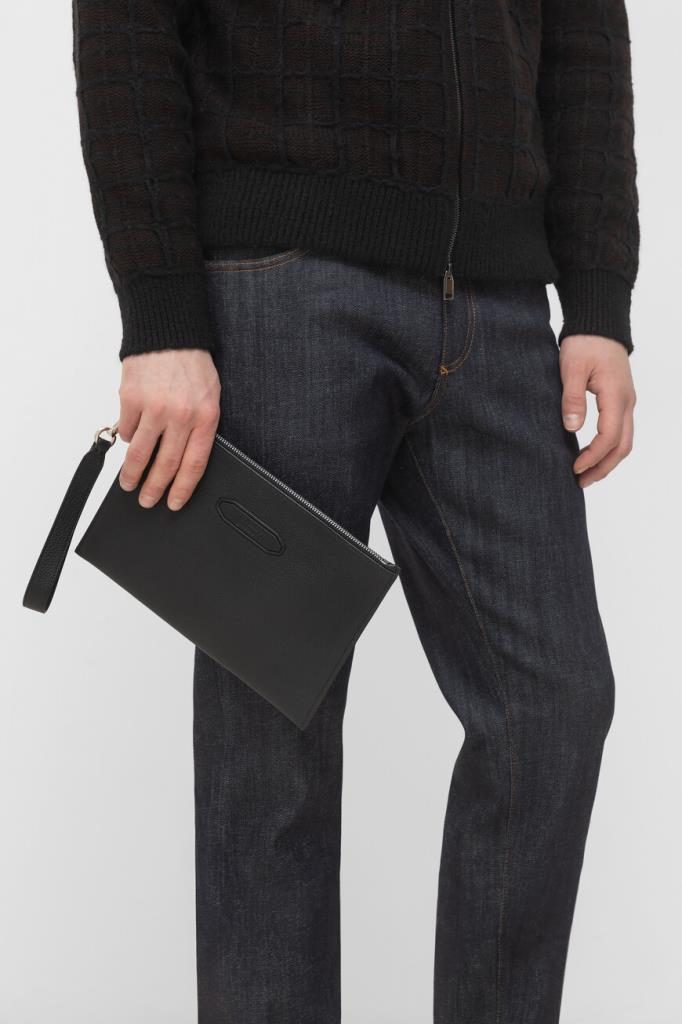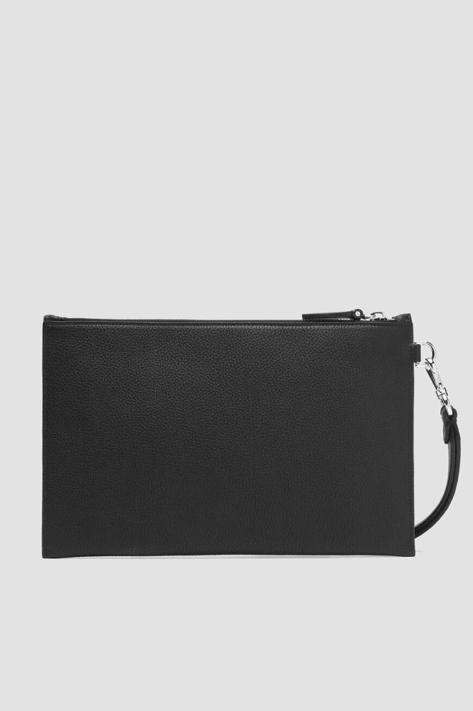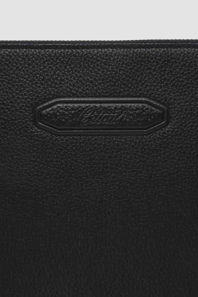 Борсетка Brioni на молнии с кожаным пуллером. Прямоугольный аксессуар небольшого формата изготовлен из мягкой зернистой кожи телёнка чёрного цвета, устойчивой к появлению царапин. Принадлежность изделия Дому обозначена вставкой с логотипом на лицевой стенке. Для удобства переноски в лёгкой модели предусмотрена длинная ручка-петля с серебристым карабином.