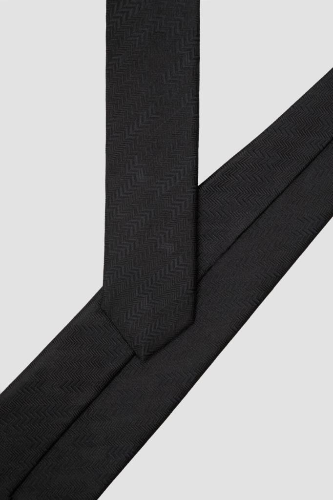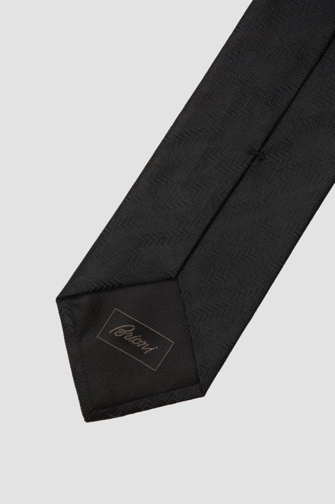 Чёрный галстук Brioni будет выглядеть органично и с тёмным, и со светлым костюмом. Модель с диагональным геометрическим мотивом в полоску-«ёлочку» с эффектом 3D выполнена из гладкого шёлка. Изделие прошито эластичным ручным стежком, поэтому оно хорошо держит вертикаль и не перекручивается. Конструкция уплотнена однотонной подкладкой с логотипом Дома.