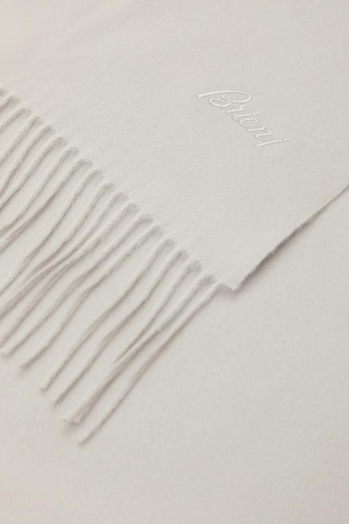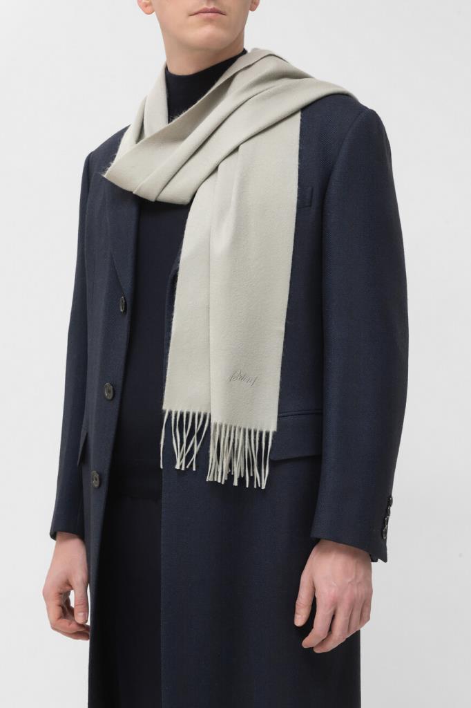 Однотонный шарф Brioni станет завершением Ваших повседневных комплектов. Для изготовления классической модели выбран мягкий кашемир светло-серого оттенка. О принадлежности аксессуара Дому деликатно напоминает вышитый нитью в тон дизайнерский логотип. Длины изделия достаточно, чтобы несколько раз обернуть вокруг шеи.