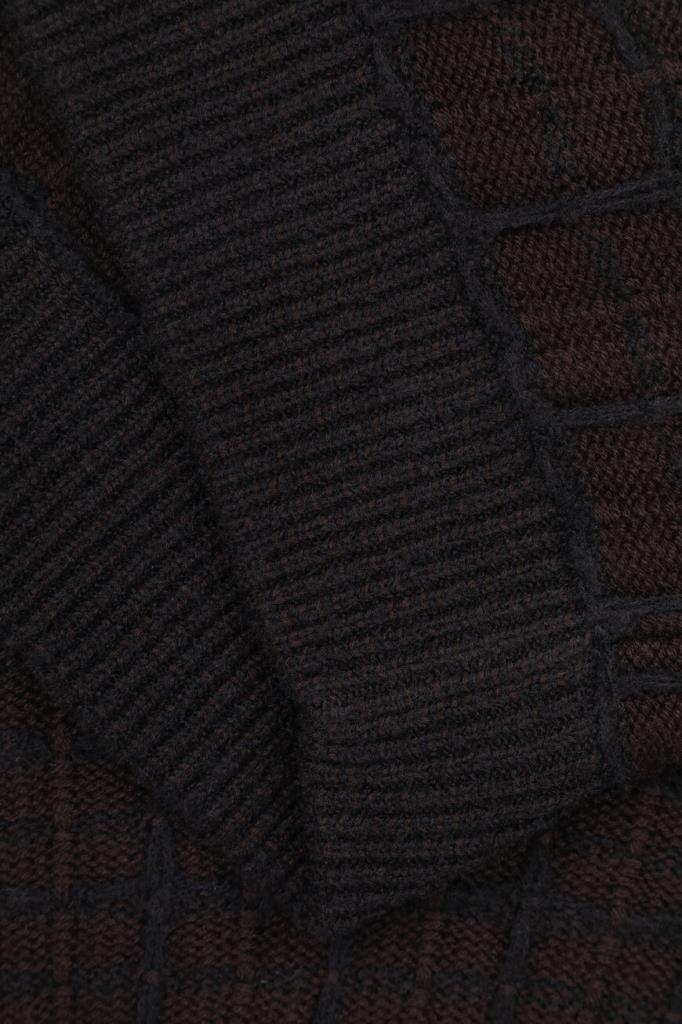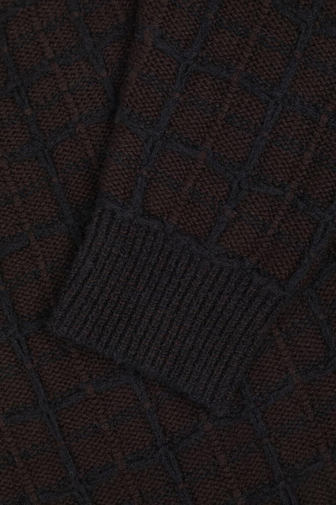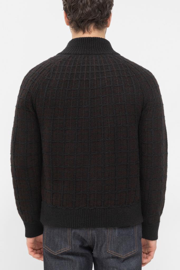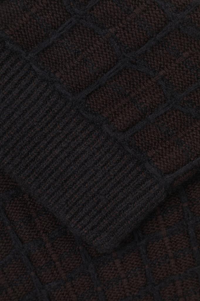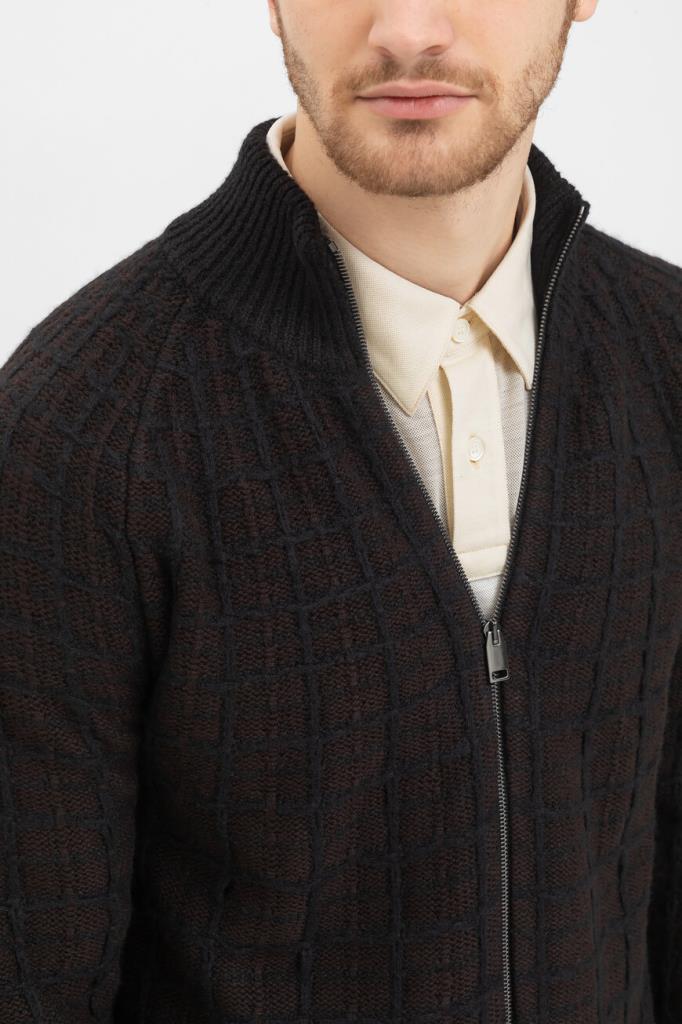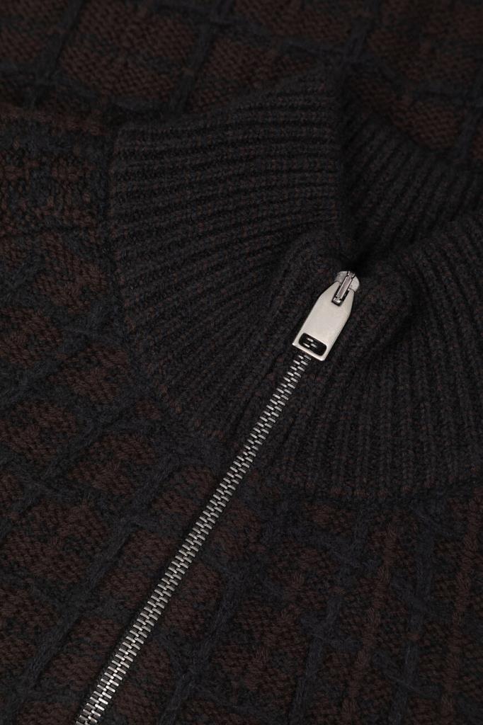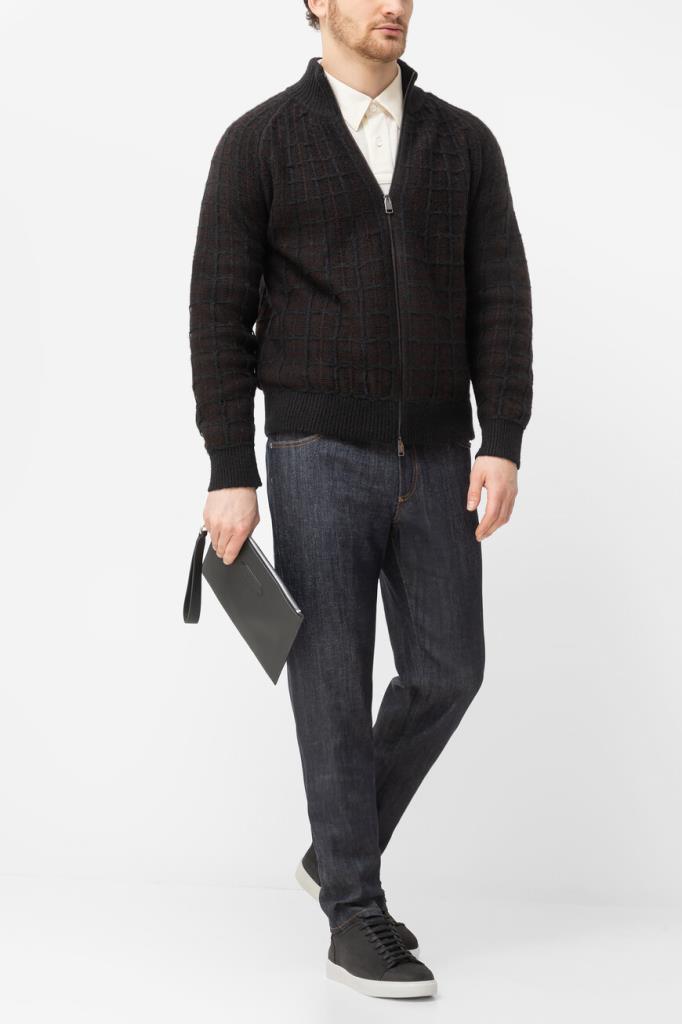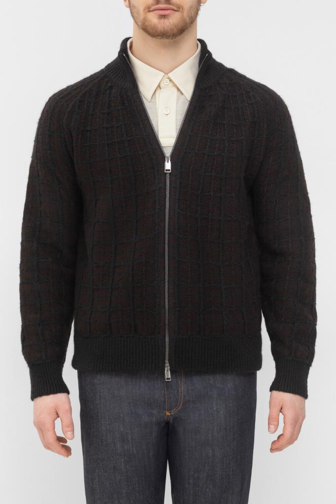 Трикотажный блузон Brioni с длинными рукавами реглан. Изделие, выполненное на основе шерсти, кашемира и гладкого шёлка тёмно-коричневого цвета, декорировано фактурным геометрическим мотивом в крупную клетку. Фасон повседневной модели характеризуется прямым силуэтом и застёжкой на встречную молнию с двумя бегунками.