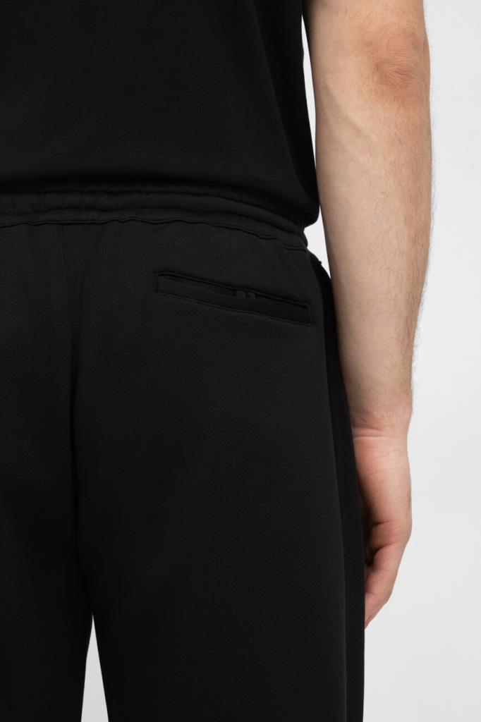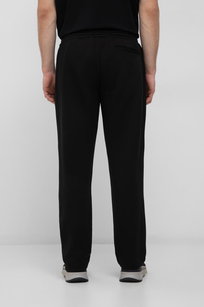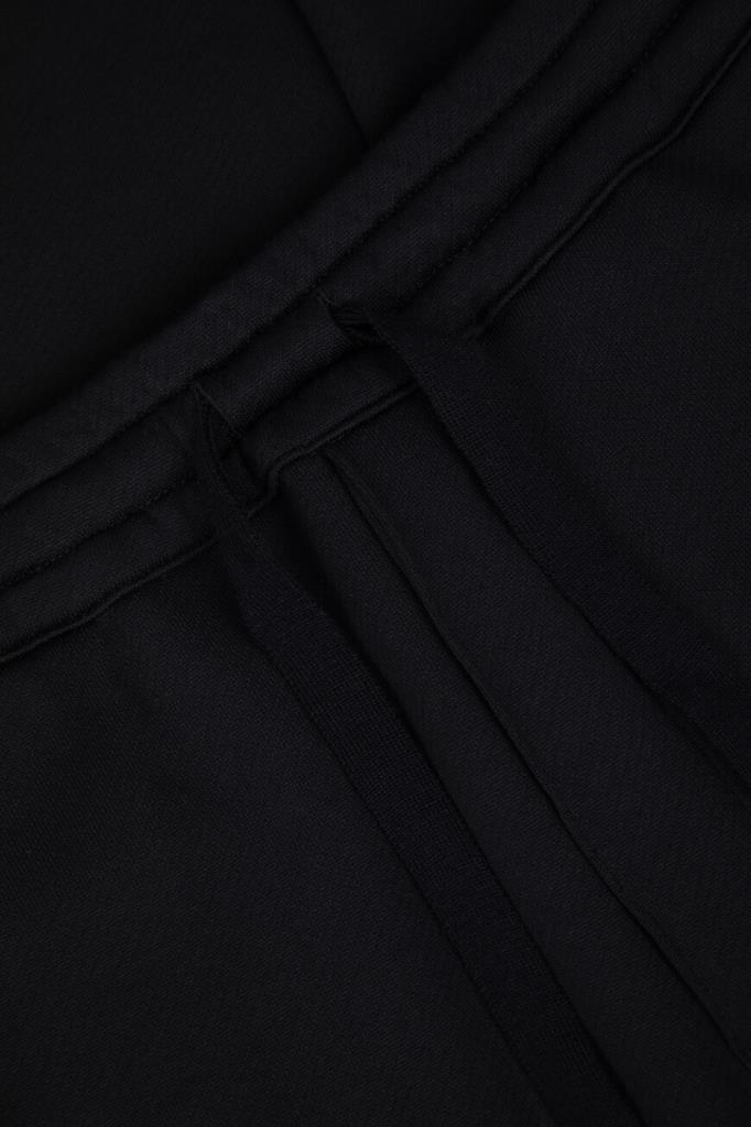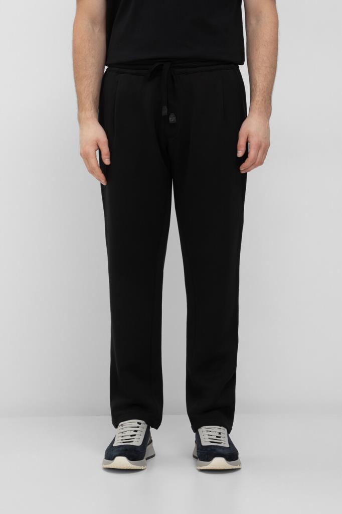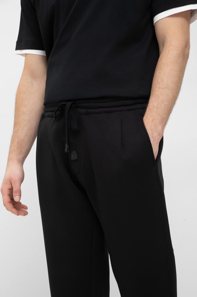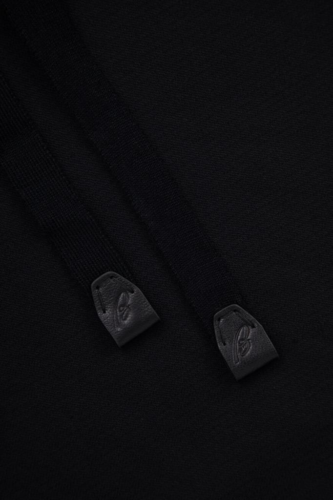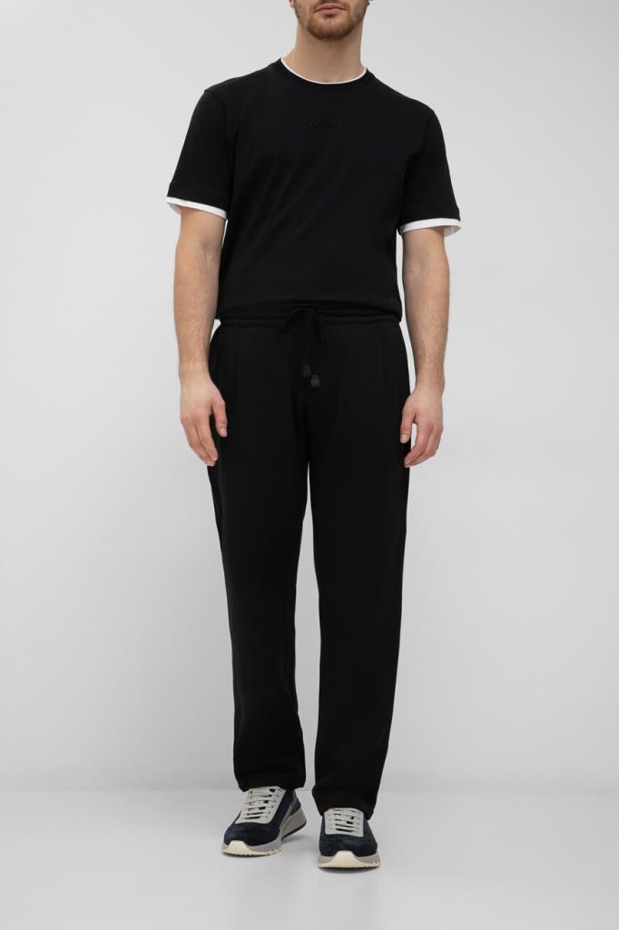 Спортивные брюки чёрного цвета от Brioni. Для изготовления модели средней посадки используется приятный на ощупь трикотаж на основе шерсти, кашемира и прочного нейлона. Изделие интересно защипами сверху и широким эластичным поясом на завязках с брендированными кожаными наконечниками.