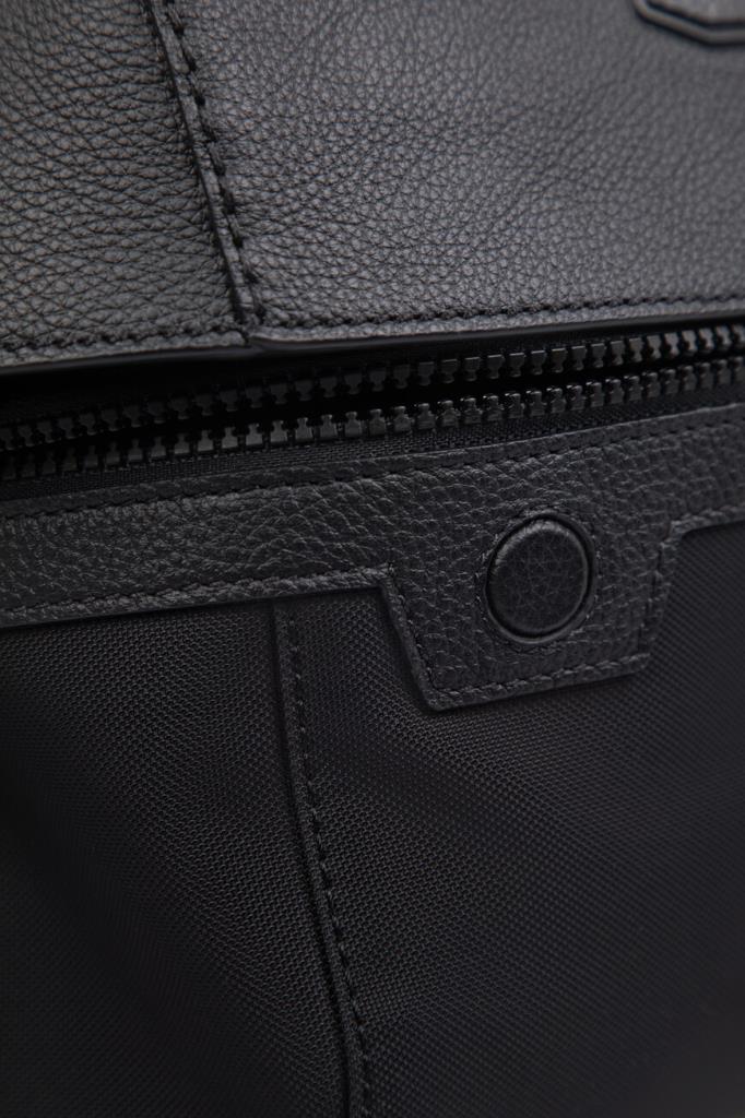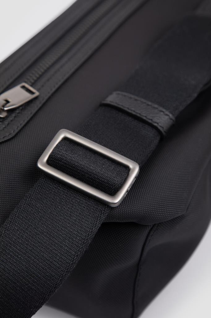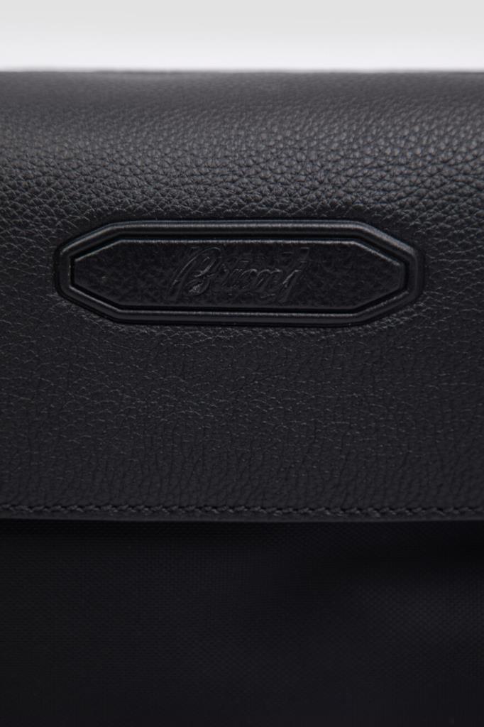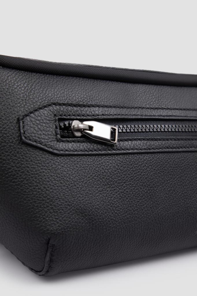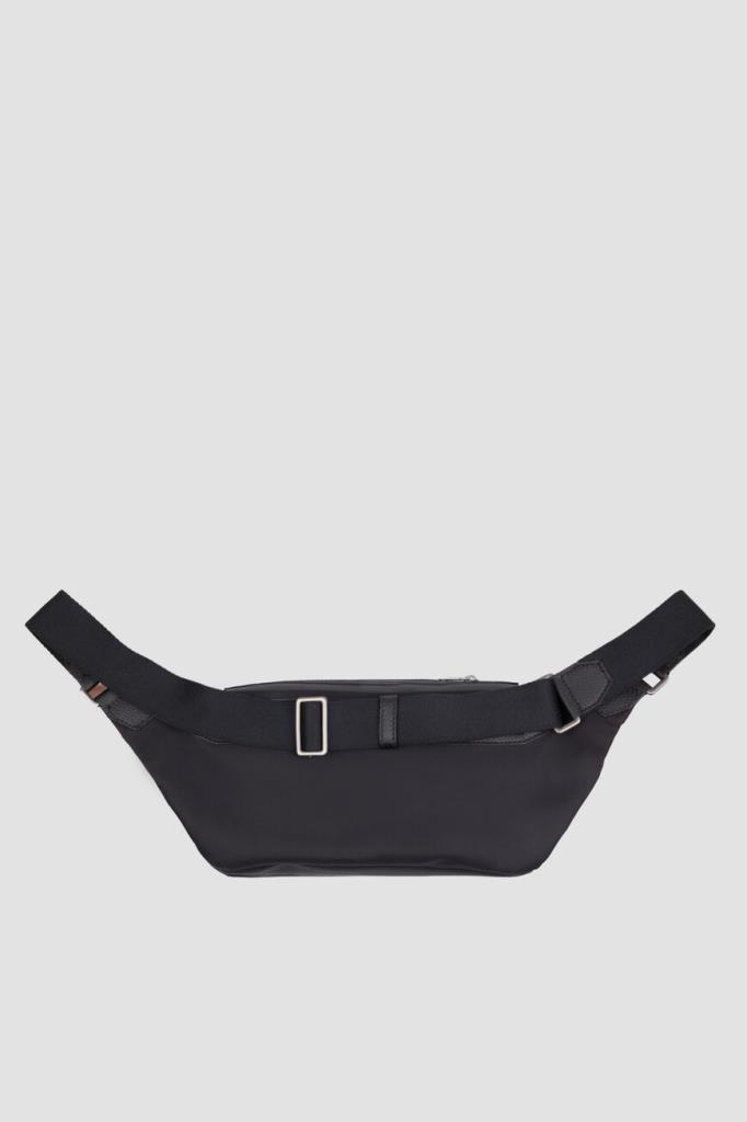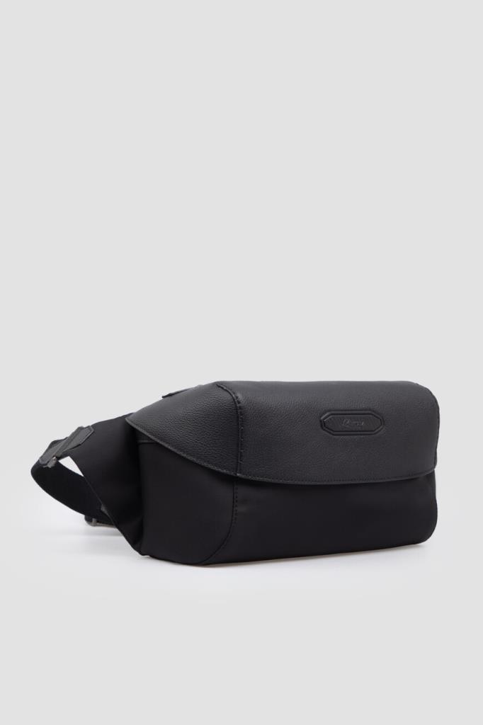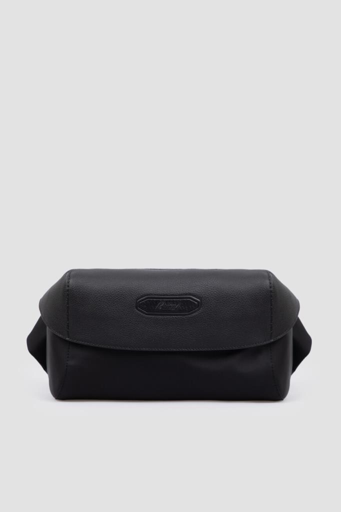 Комбинированная поясная сумка Brioni с откидным клапаном спереди. Для создания прямоугольной модели чёрного цвета выбраны прочный фактурный нейлон и зернистая телячья кожа. Внутри расположено одно просторное отделение, а удобство переноски обеспечивает текстильный регулируемый ремень с кожаными деталями. Декором выступает рельефная восьмиугольная деталь с дизайнерским логотипом Дома, размещённая на клапане.