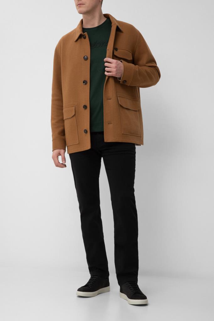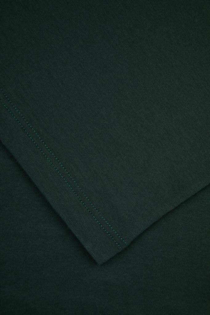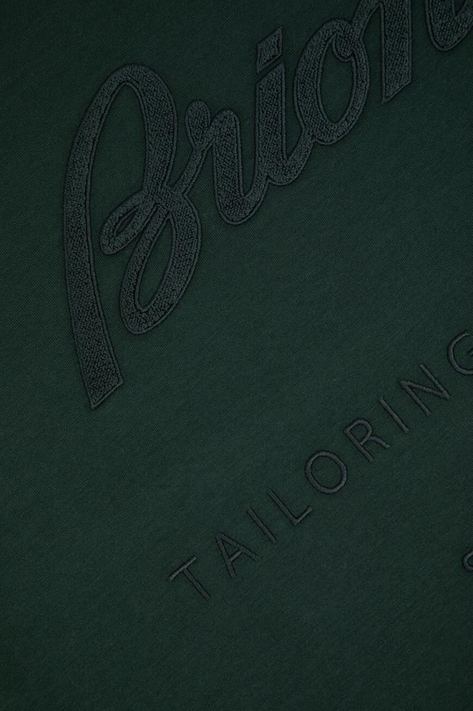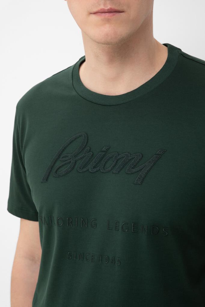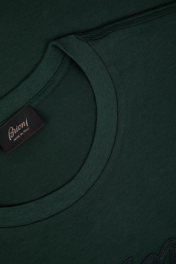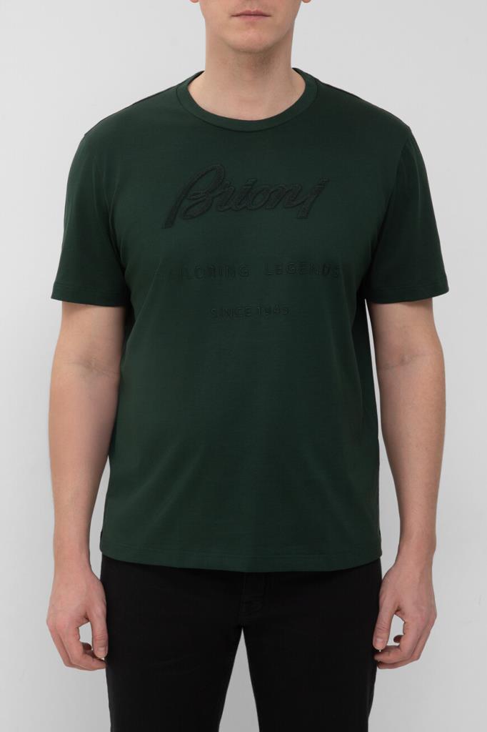 Футболка тёмно-зелёного цвета от Brioni. Для изготовления изделия прямого силуэта используется мягкий органический хлопок с сертификатом GOTS. Атрибутами Дома являются крупный ворсистый логотип и вышитые рельефные надпись «Tailoring legends» заглавными буквами и год основания Дома спереди. Модель удобно носить под курткой или другой верхней одеждой в период межсезонья.