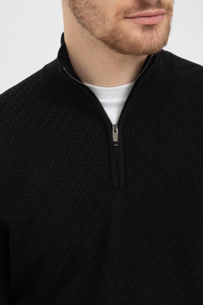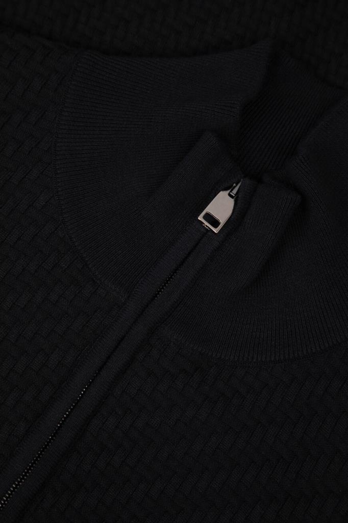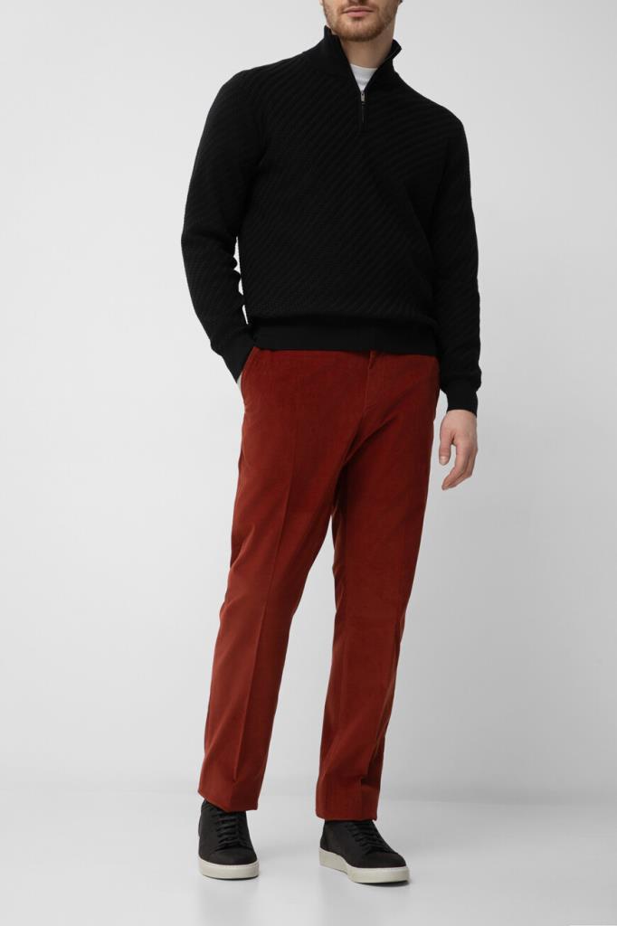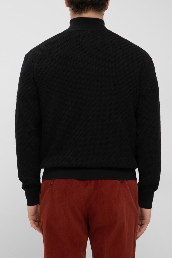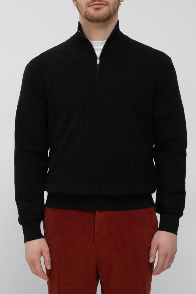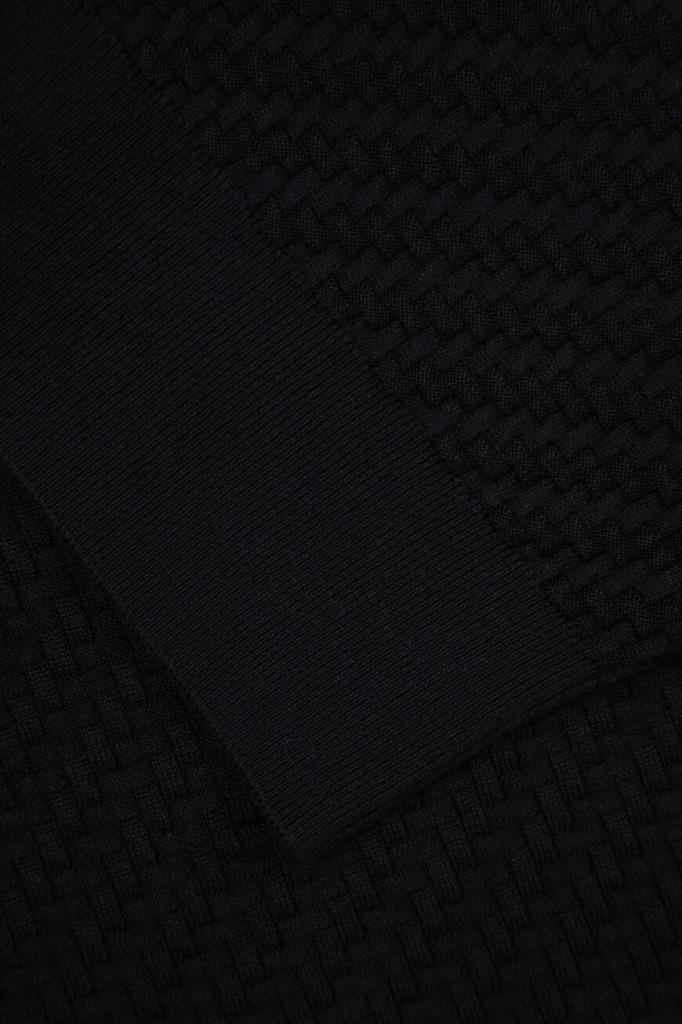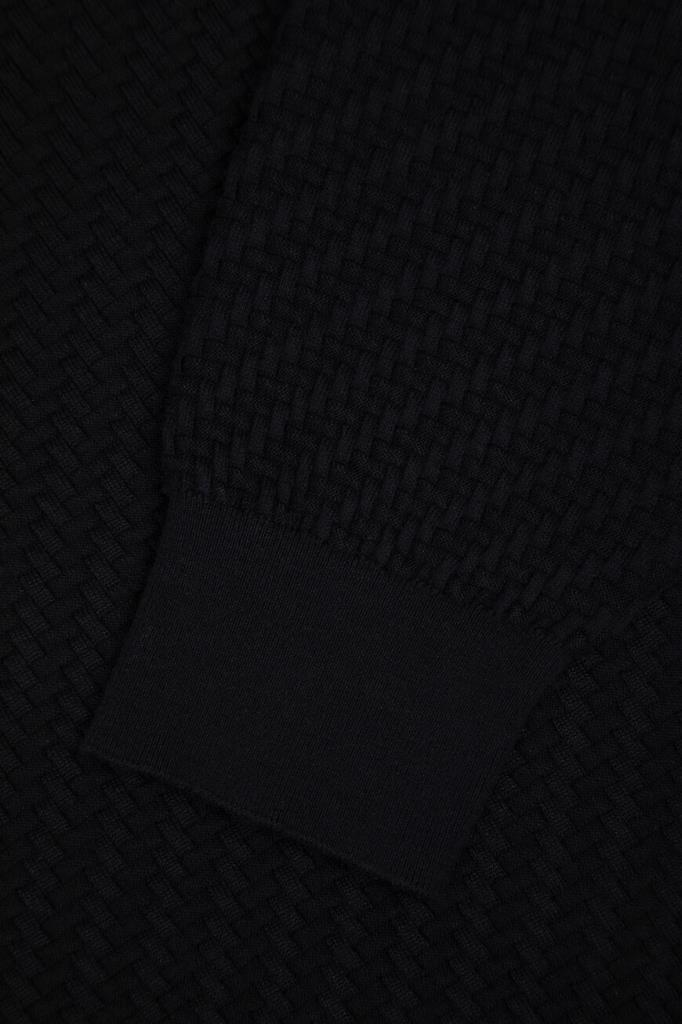 Свитер прямого силуэта от Brioni. Изделие выполнено из мягкого трикотажа на основе хлопка, кашемира и гладкого шёлка чёрного цвета. Отличительной особенностью модели стал геометрический мотив с эффектом плетения в тон. Объёмное переплетение Trama характеризуется однотонным рубчиком, который обеспечивает уникальные тактильные ощущения. Этот узор имитирует сампьетрино — камни, которыми вымощены улицы Рима. Легендарный рисунок, позаимствованный у Вечного города. Образ можно дополнить вельветовыми брюками с классическими стрелками из той же коллекции.