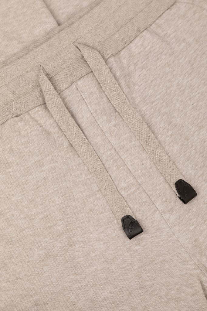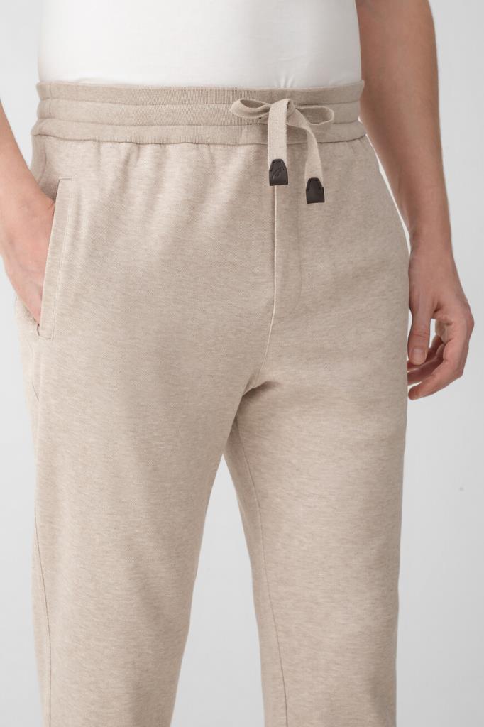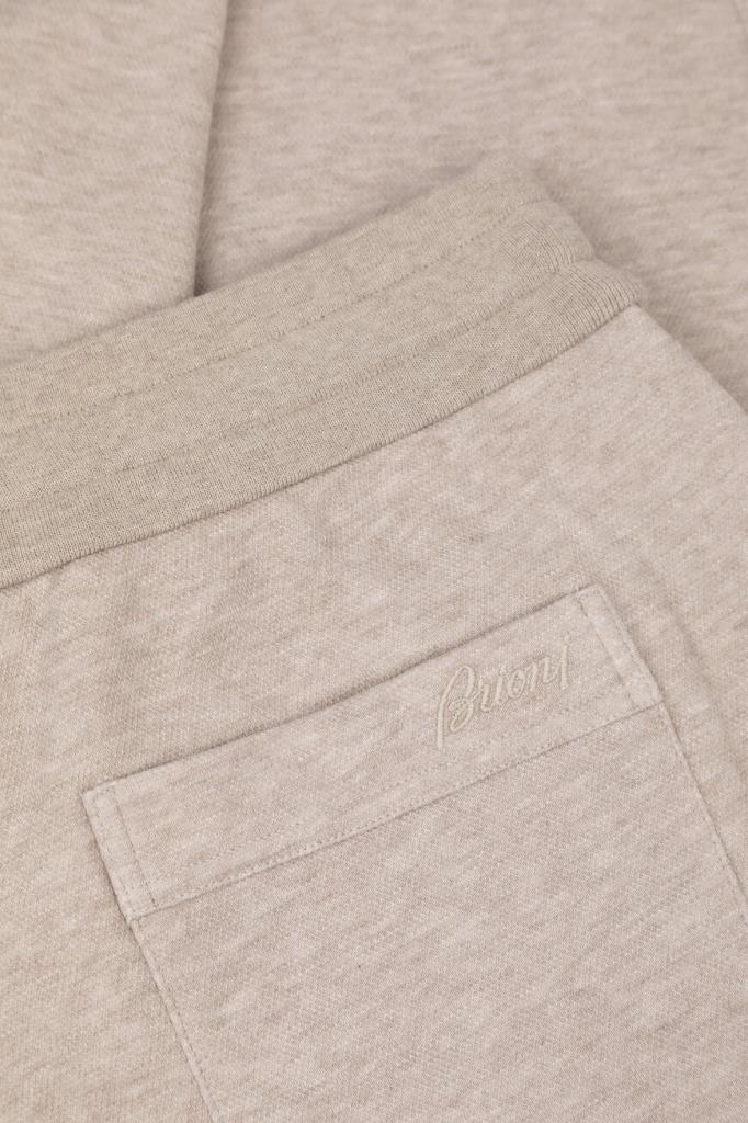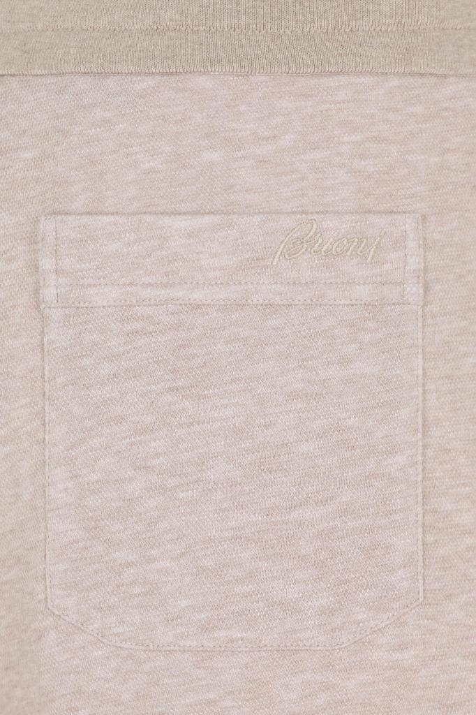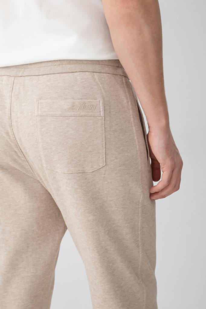 Песочные брюки с широким эластичным поясом-кулиской от Brioni. Спортивная модель изготовлена из мягкого трикотажа-пике на основе хлопка и прочного нейлона. Изделие отличается классическими кроем и посадкой и наличием трёх карманов: двух прорезных с диагональным входом по бокам и накладного сзади справа. О принадлежности брюк Дому деликатно напоминают кожаные наконечники завязок с тиснёной литерой «B» и вышитый логотип на кармане.