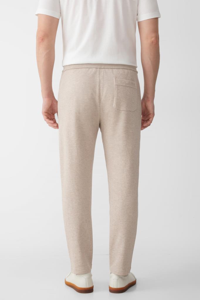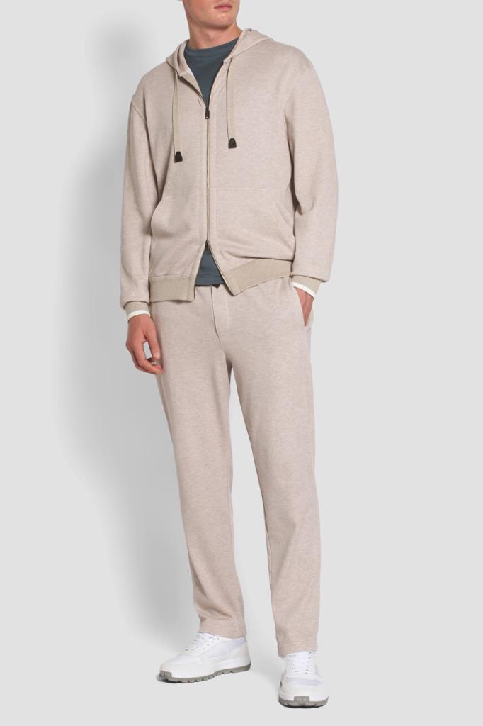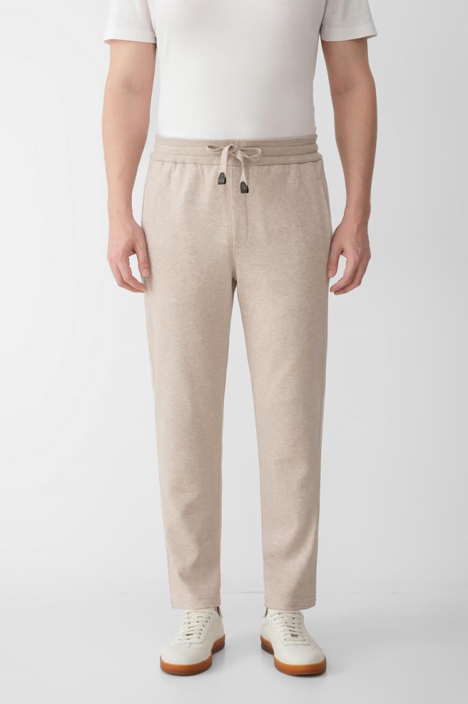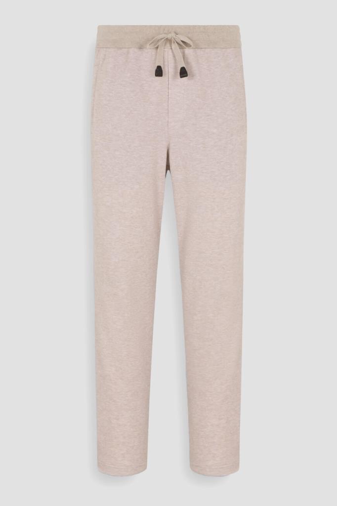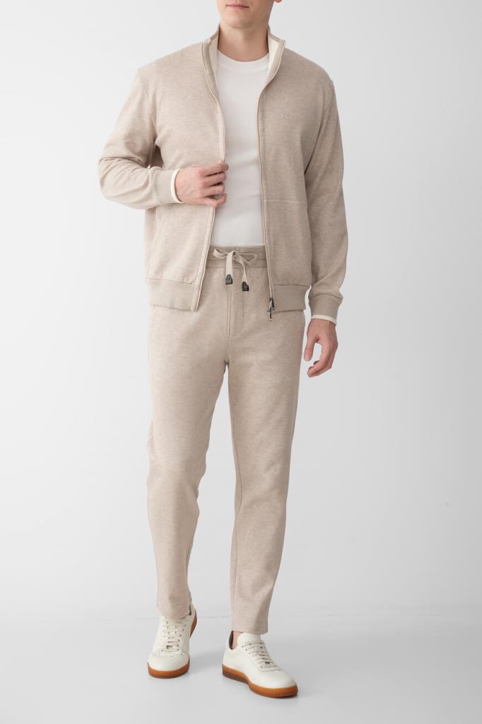 Песочные брюки с широким эластичным поясом-кулиской от Brioni. Спортивная модель изготовлена из мягкого трикотажа-пике на основе хлопка и прочного нейлона. Изделие отличается классическими кроем и посадкой и наличием трёх карманов: двух прорезных с диагональным входом по бокам и накладного сзади справа. О принадлежности брюк Дому деликатно напоминают кожаные наконечники завязок с тиснёной литерой «B» и вышитый логотип на кармане.