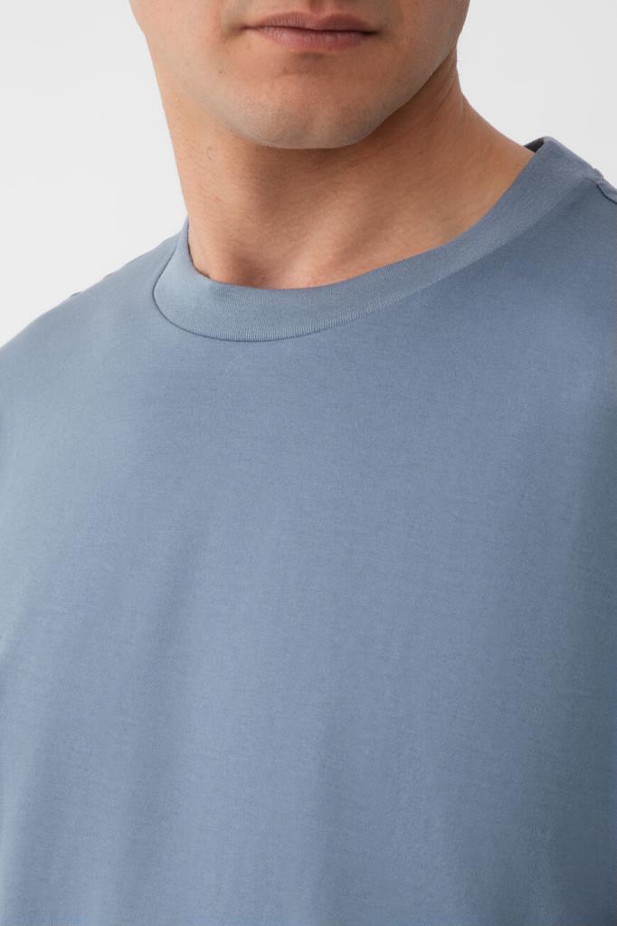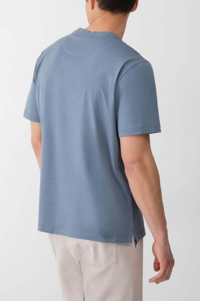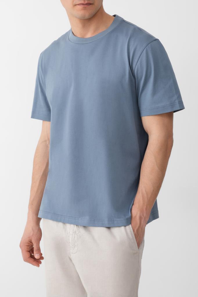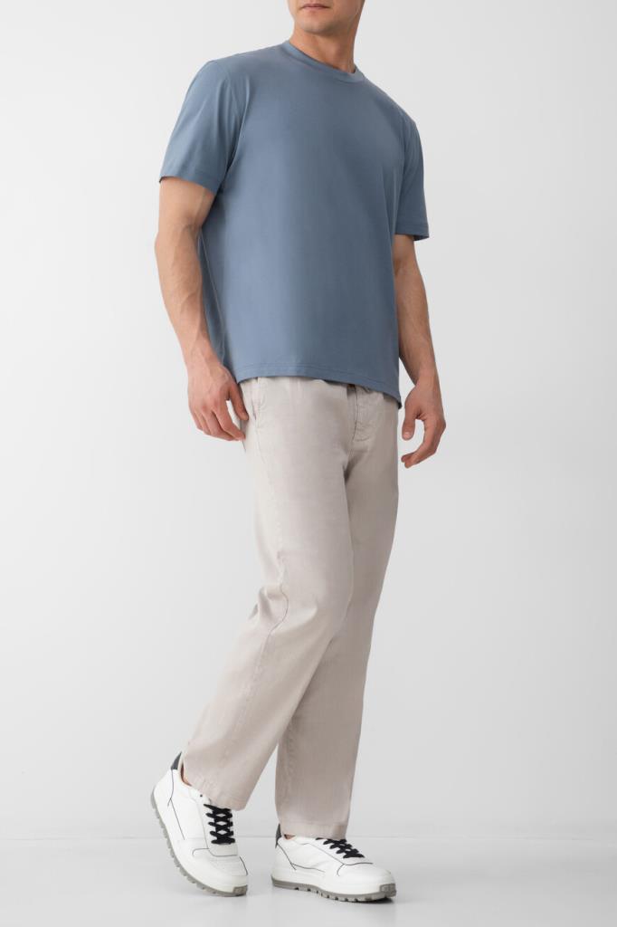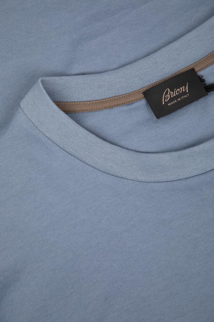 Футболка Brioni обеспечивает непревзойдённый комфорт и воздухопроницаемость. Всё дело в материале: модель сшита из органического хлопка светло-синего цвета с сертификатом GOTS, обработанного над газовыми горелками, чтобы сделать нити гладкими и более прочными. Изделие интересно классическим кроем, чёрной кожаной вставкой с тиснёным логотипом Дома спереди у основания и кантом во внутренней части воротника. Непринуждённая вневременная футболка с высококачественной отделкой прекрасно дополнит образ для отдыха.