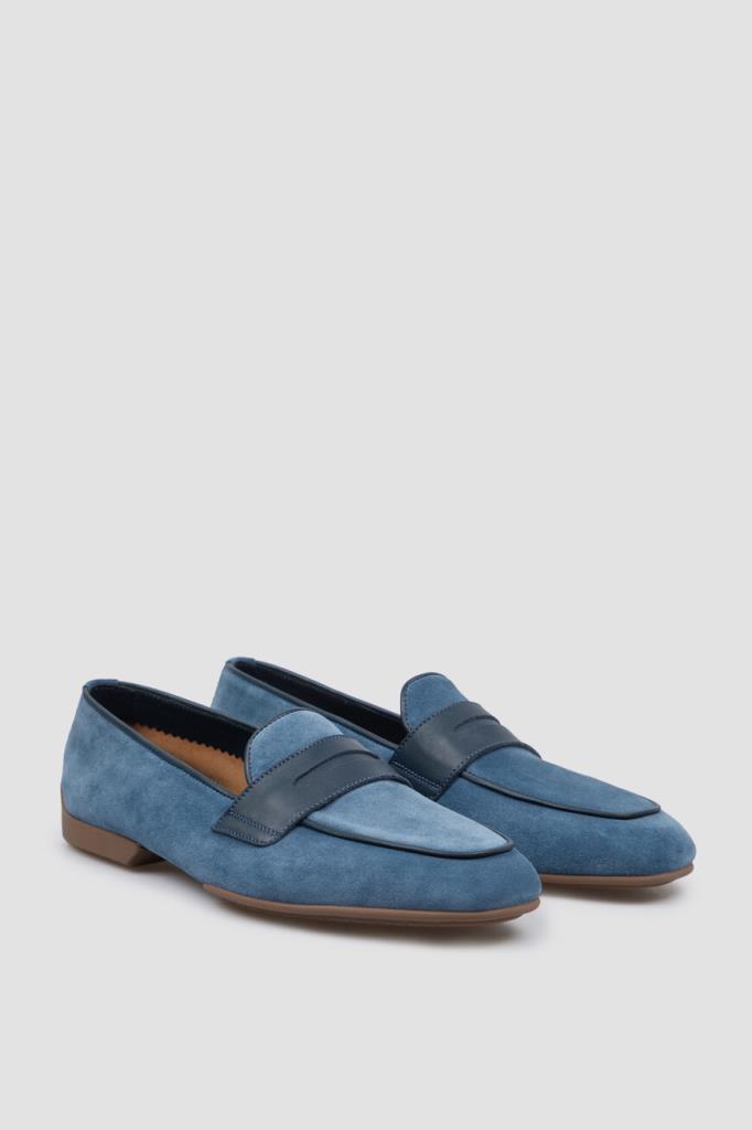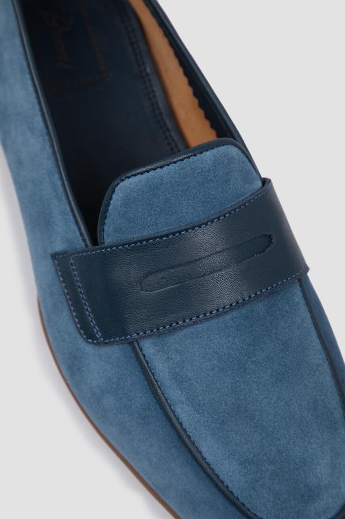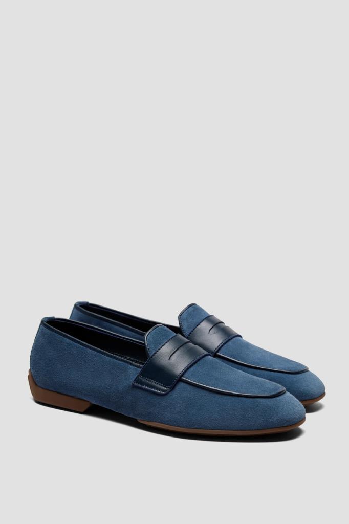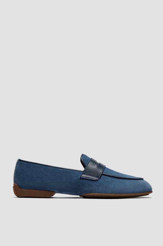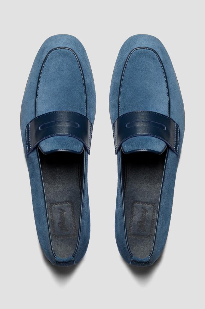 Замшевые пенни-лоферы Monza от Brioni с зауженной колодкой. Изделие с бархатистой поверхностью окрашено в светло-синий оттенок и дополнено синими кожаными кантом и поперечным ремешком с прорезью на союзке. Модель отличается гибкой конструкцией Blake и двухслойной резиновой подошвой с коричневыми вставками со специальным шевронным узором-рифлением снизу, заходящими на пятку. Это идеальный выбор для джентльмена, который ценит функциональность и стиль.