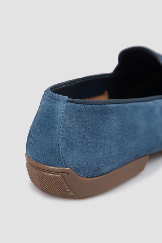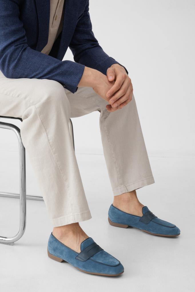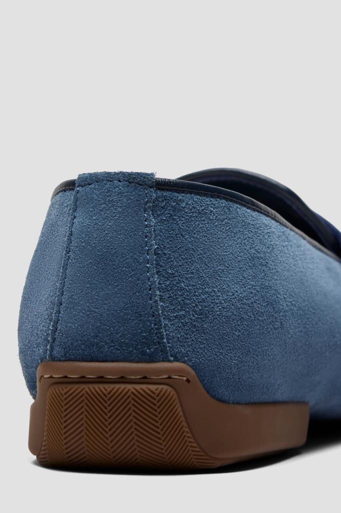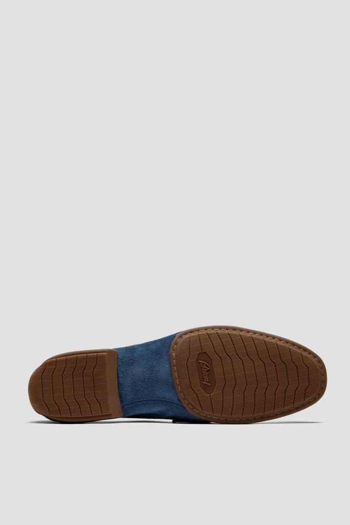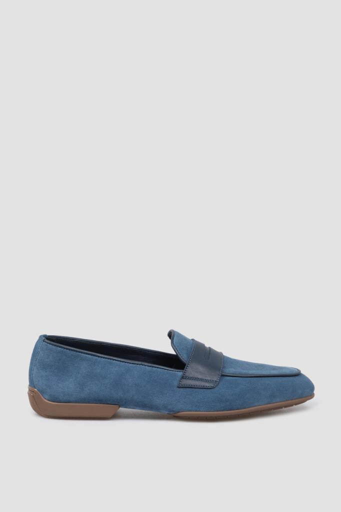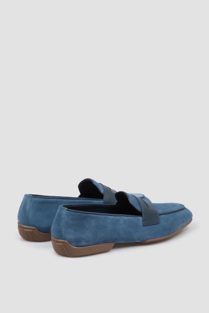 Замшевые пенни-лоферы Monza от Brioni с зауженной колодкой. Изделие с бархатистой поверхностью окрашено в светло-синий оттенок и дополнено синими кожаными кантом и поперечным ремешком с прорезью на союзке. Модель отличается гибкой конструкцией Blake и двухслойной резиновой подошвой с коричневыми вставками со специальным шевронным узором-рифлением снизу, заходящими на пятку. Это идеальный выбор для джентльмена, который ценит функциональность и стиль.