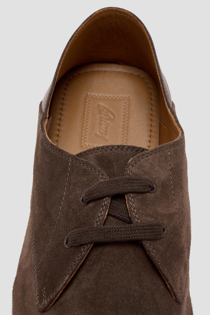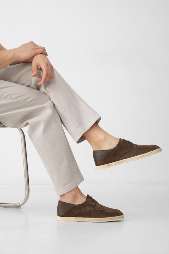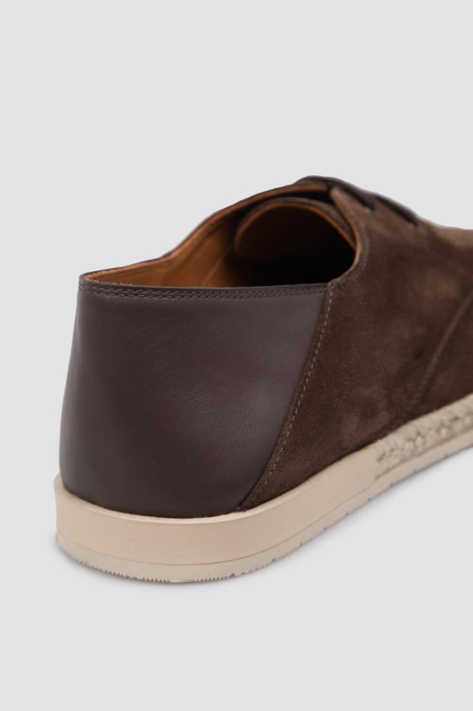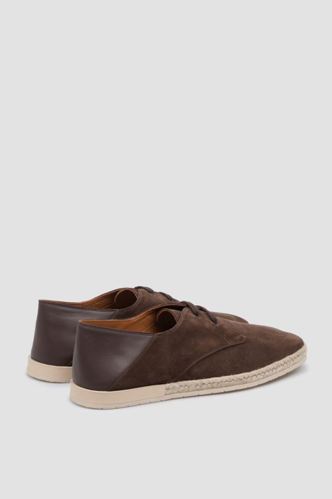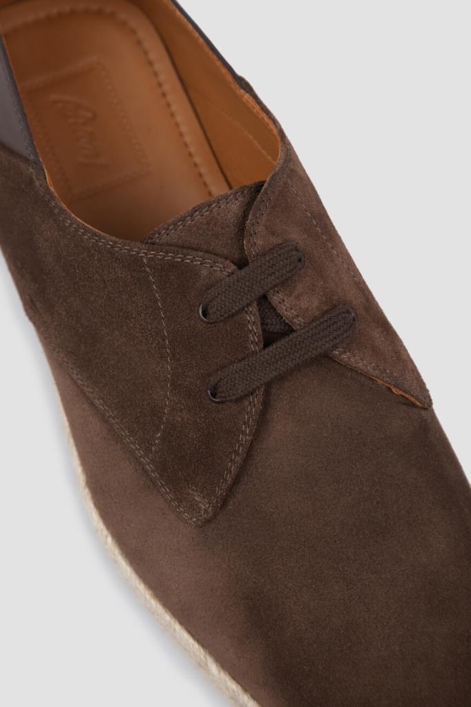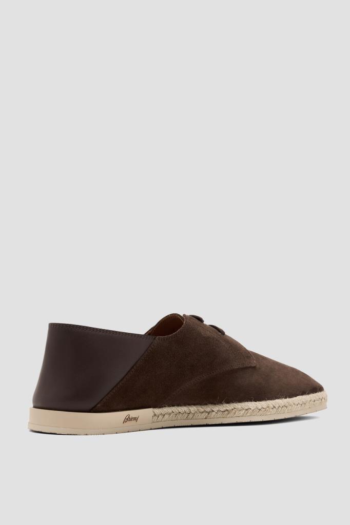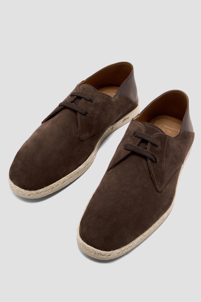 Замшевые эспадрильи-дерби от Brioni с мягким кожаным задником. Удобная пара выполнена в тёмно-коричневом цвете с бархатистой текстурой. Вдохновлённая классическим силуэтом эспадрилий, модель установлена на плоскую подошву из натуральной резины с плетёной джутовой накладкой и рифлением снизу. Изделие идеально подойдёт для того, чтобы придать Вашим образам изысканность.