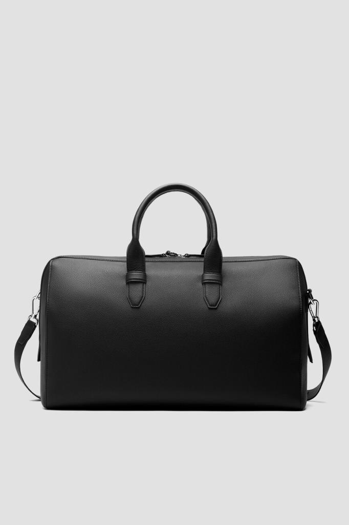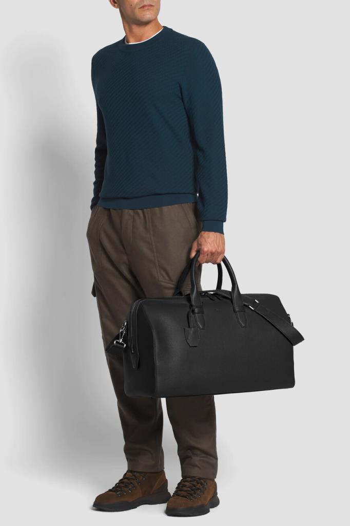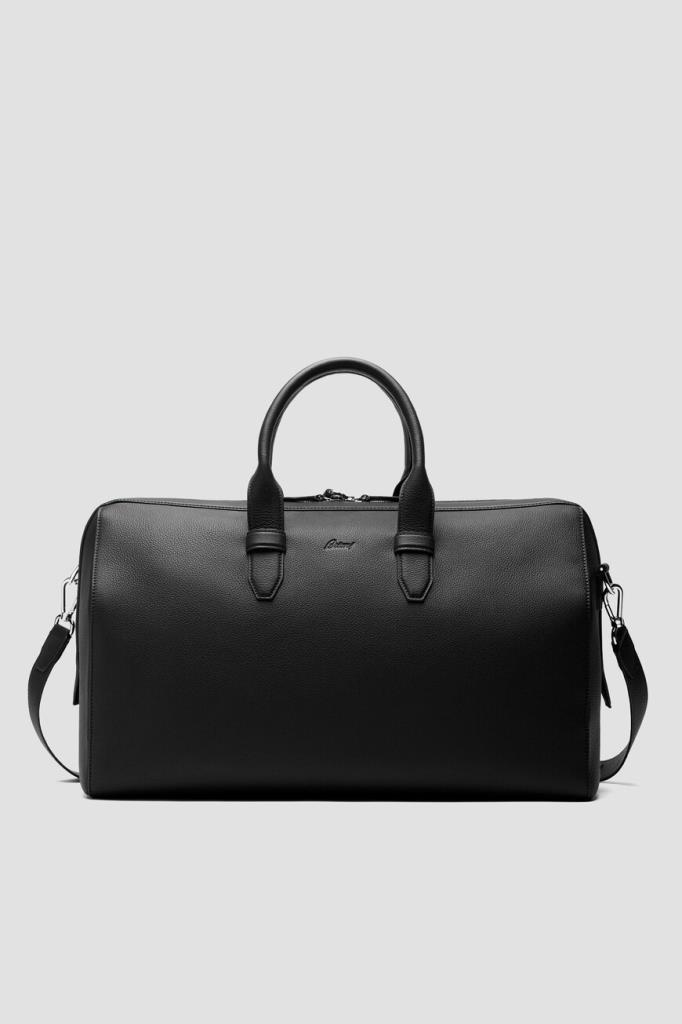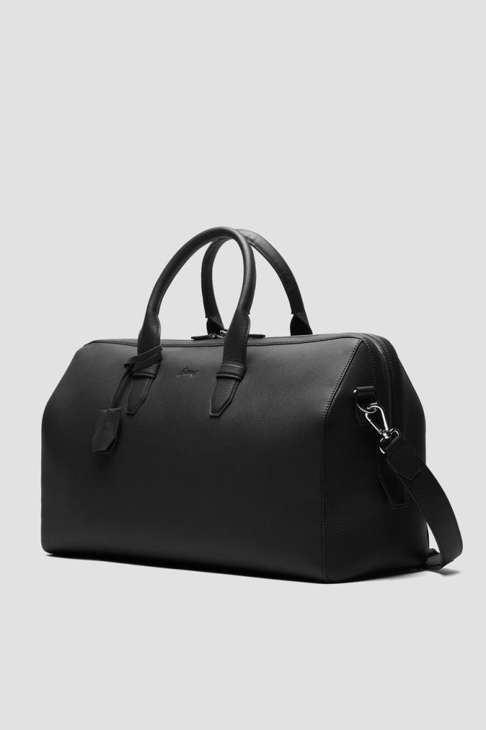 Чёрная дорожная сумка-дафл от Brioni. Для создания вместительной, но в то же время компактной модели выбрана зернистая кожа телёнка Rodos высочайшего качества. Благодаря особой отделке изделие со временем не теряет привлекательный вид. Две округлые ручки сверху и широкий плечевой ремень с серебристыми карабинами предлагают несколько вариантов переноски. Атрибутом Дома является минималистичный тиснёный логотип на лицевой стенке.