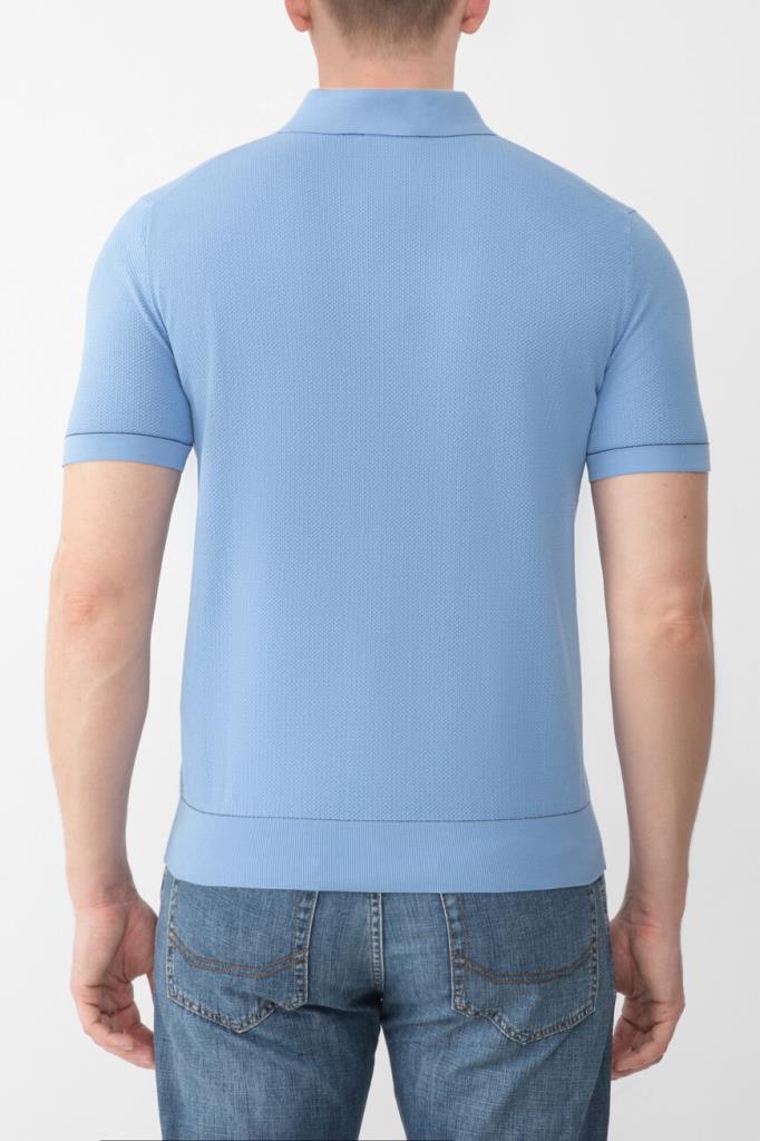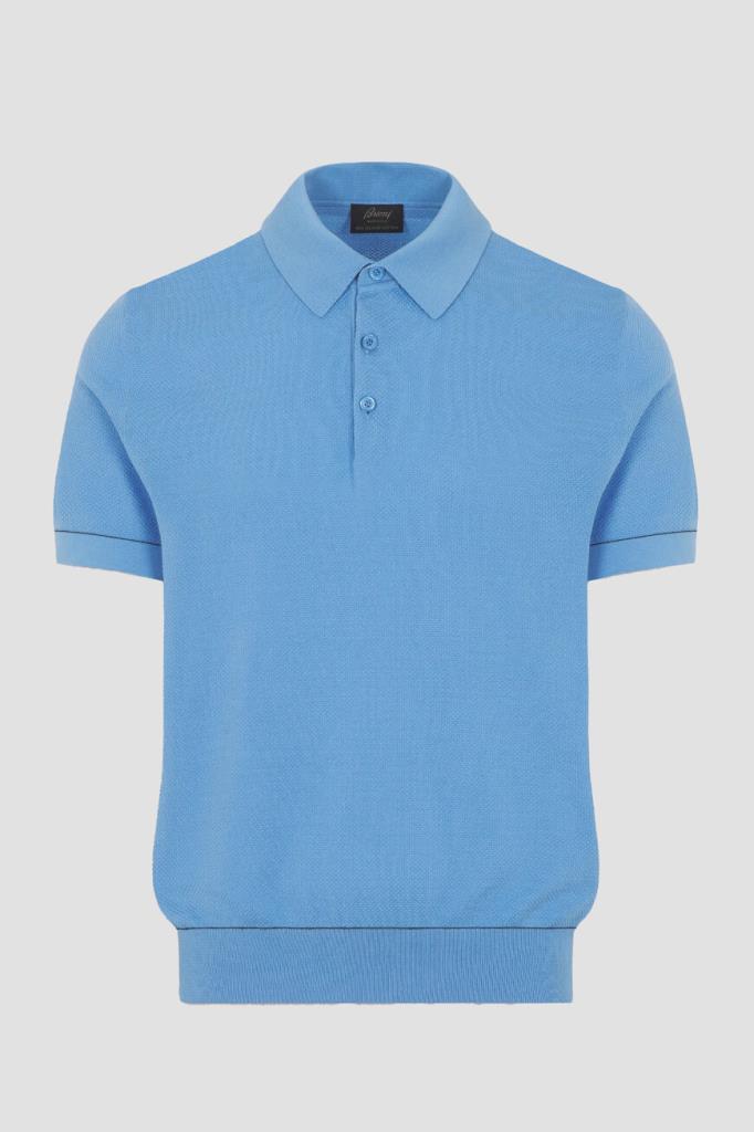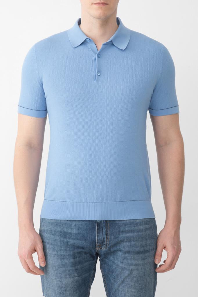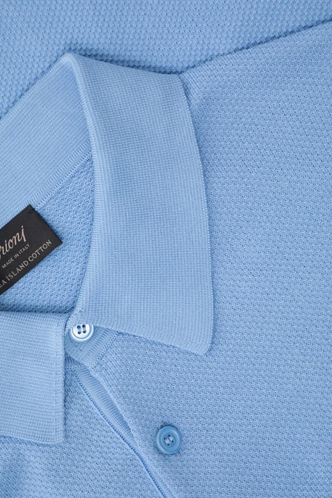 Хлопковое поло BRIONI с окантовкой-строчкой на манжетах рукавов и поясе. Для производства модели используется фактурное пике на основе тончайших ультрадлинных волокон Sea Island, поэтому изделие получилось лёгким, прочным и при этом исключительно приятным на ощупь. Поло небесно-голубого оттенка комфортно садится по фигуре благодаря широкому эластичному поясу и манжетам-резинкам.