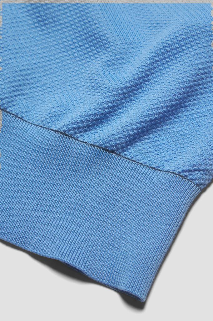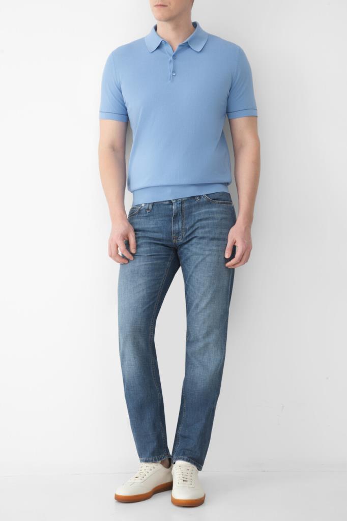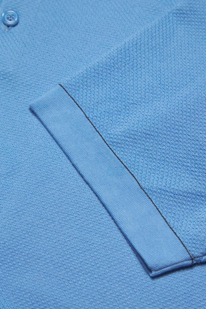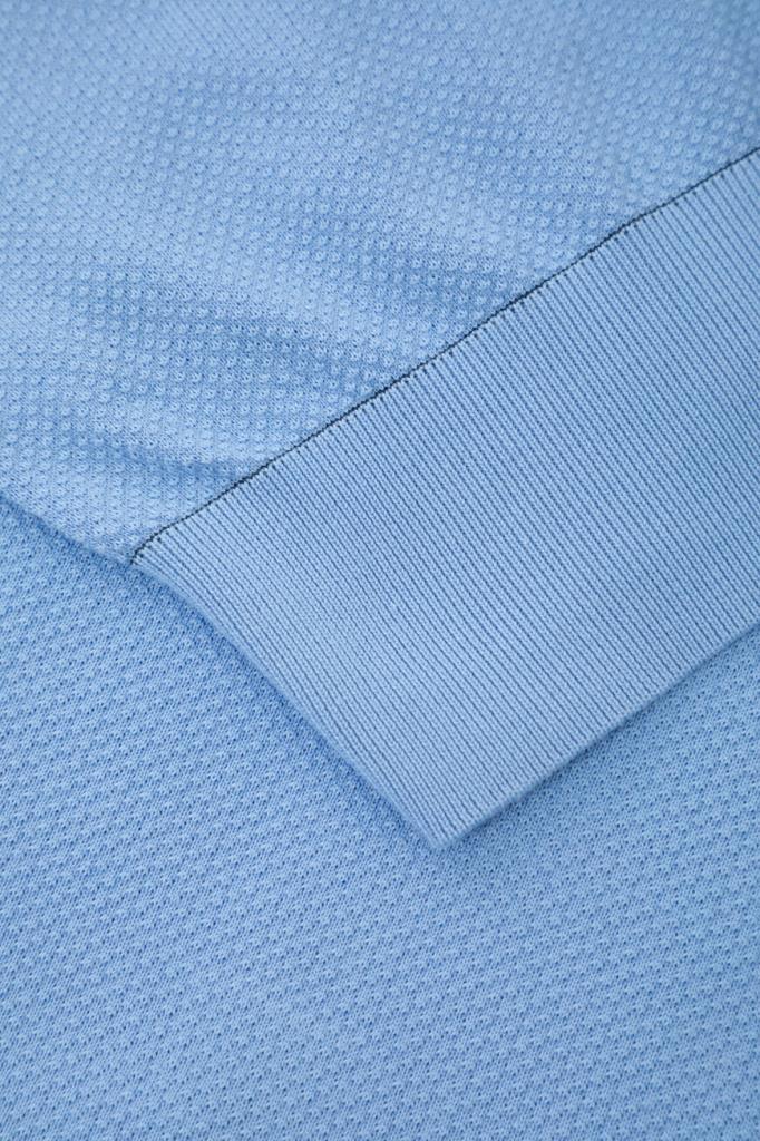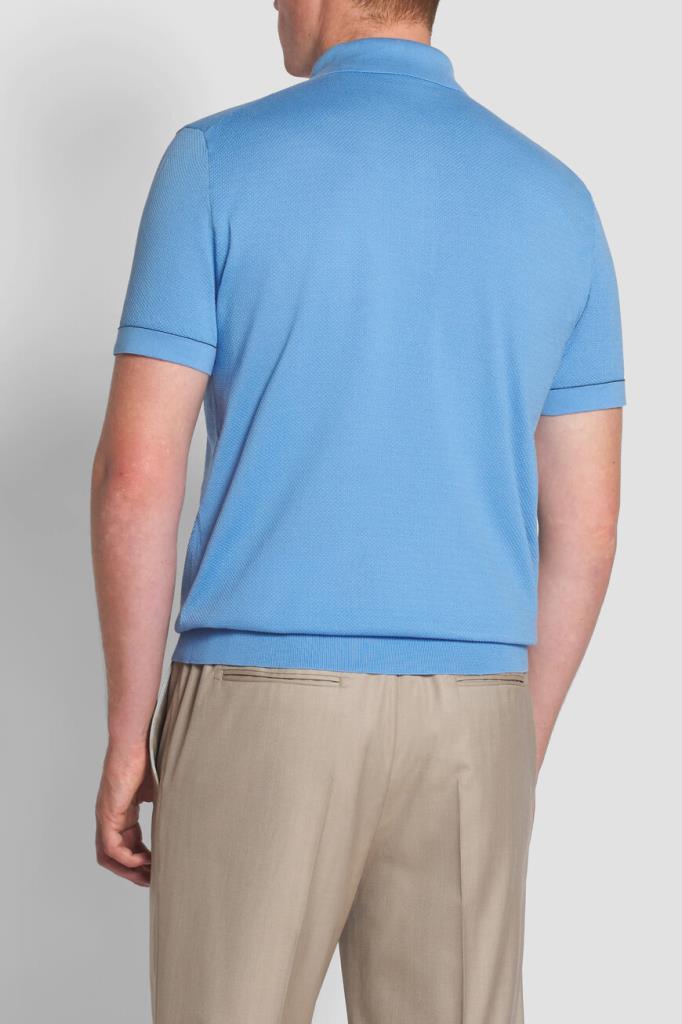 Хлопковое поло BRIONI с окантовкой-строчкой на манжетах рукавов и поясе. Для производства модели используется фактурное пике на основе тончайших ультрадлинных волокон Sea Island, поэтому изделие получилось лёгким, прочным и при этом исключительно приятным на ощупь. Поло небесно-голубого оттенка комфортно садится по фигуре благодаря широкому эластичному поясу и манжетам-резинкам.