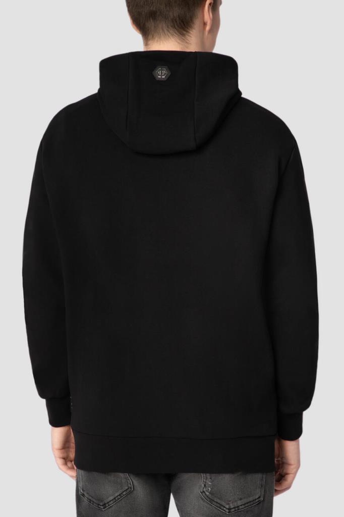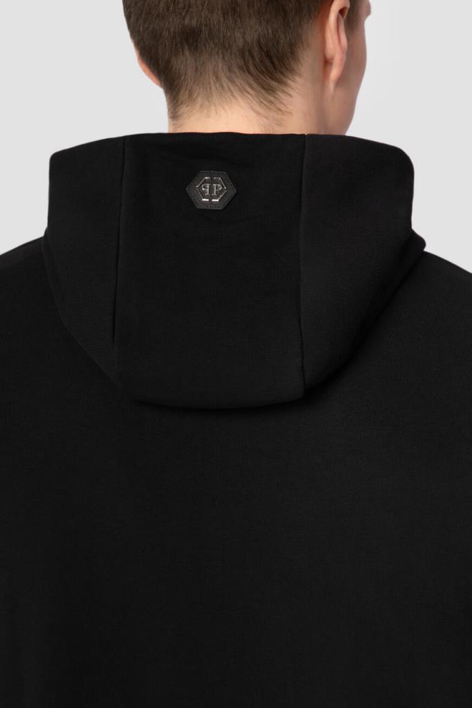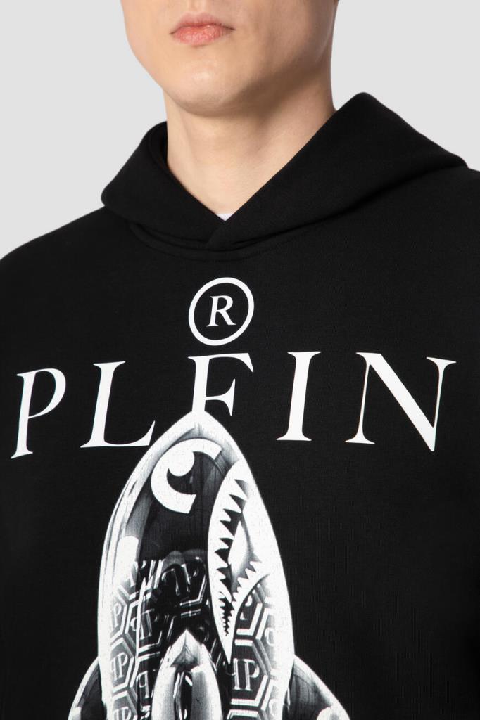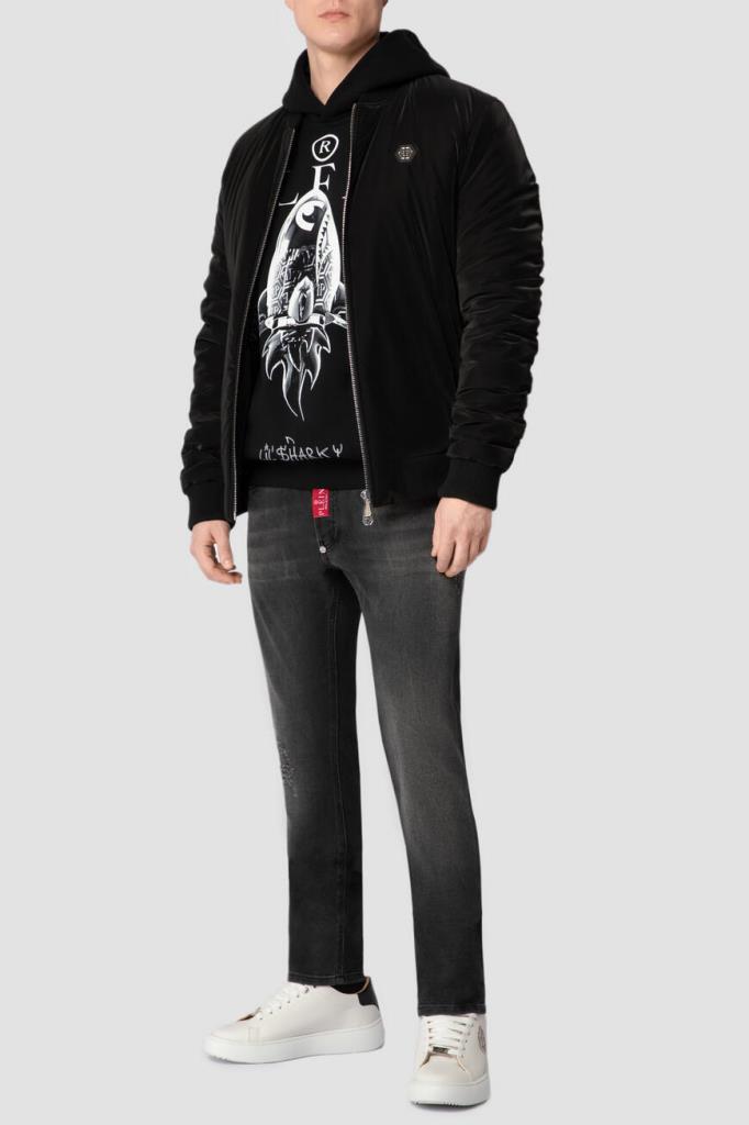 Чёрное худи из хлопка и полиэфира от бренда Philipp Plein. Фасон изделия предполагает прямой крой и объёмный капюшон со вставкой из сафьяновой кожи PP Hexagon с серебристой металлической монограммой в центре. Спереди модель украшают крупный принт с изображением ракеты-«акулы», контрастная надпись «Plein» и дизайнерская надпись снизу. Образ можно дополнить тёмно-серыми джинсами с эффектом делаве и комбинированными сникерами того же бренда.