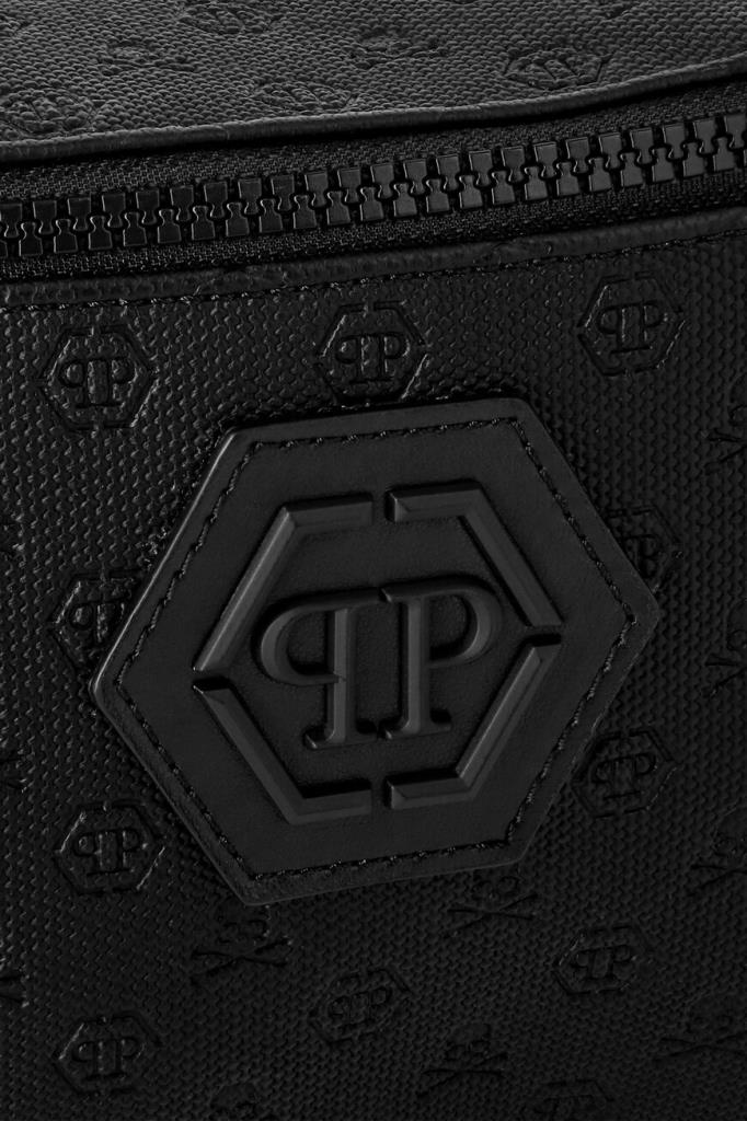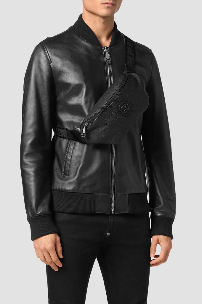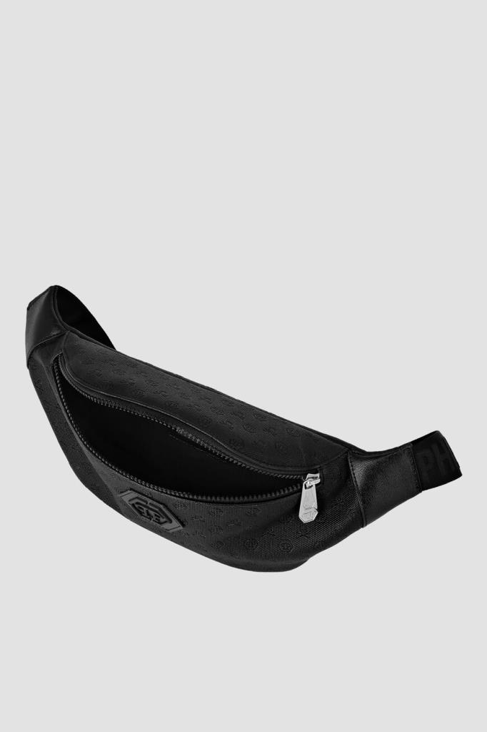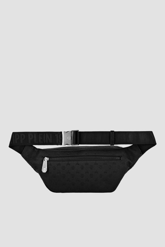 Поясная сумка на молнии от бренда PHILIPP PLEIN. Для создания модели с просторным внутренним отделением используется высокопрочный чёрный полиэфир. Декором выступают фактурный геометрический узор и тиснёный мотив в виде культового черепа и монограммы PP Hexagon в тон. Изделие можно носить на поясе или через плечо благодаря широкому регулируемому ремню из плотного текстиля с брендированием, серебристым фастексом и кожаными вставками по бокам. Сумка идеально подойдёт для поездок.