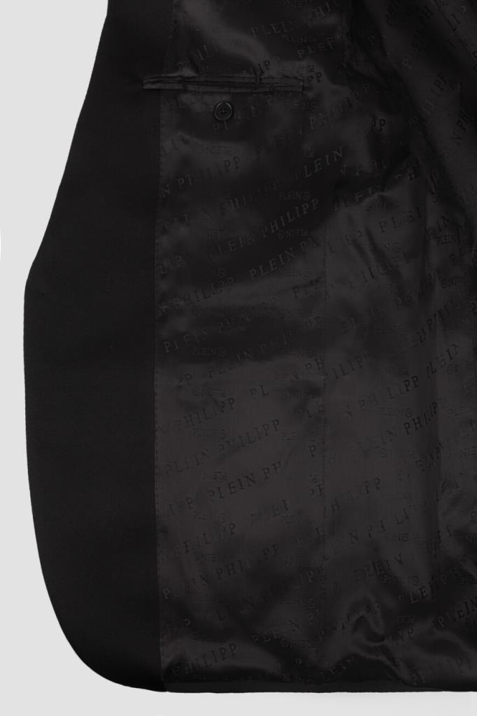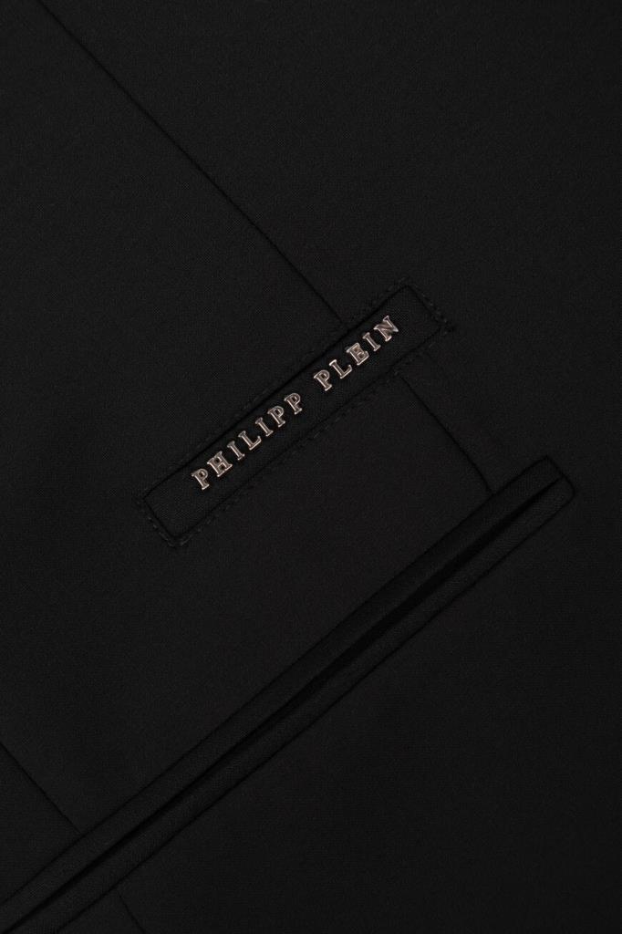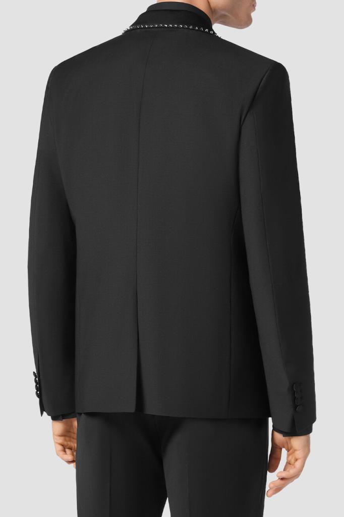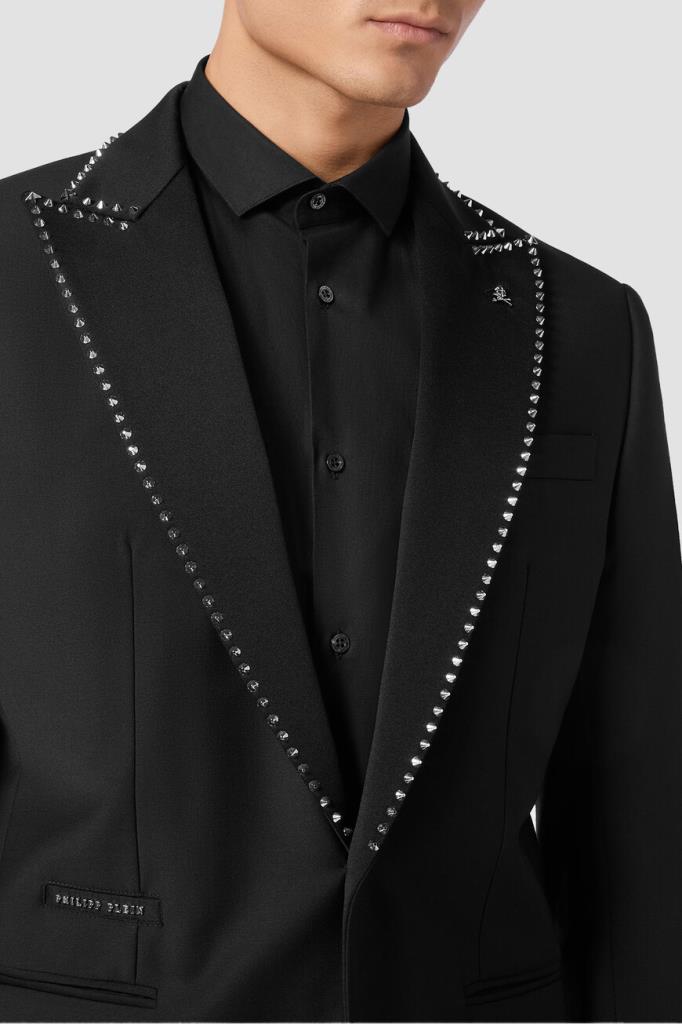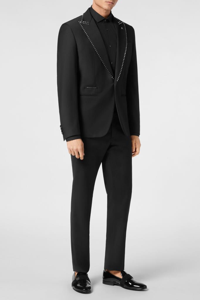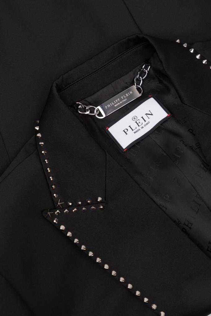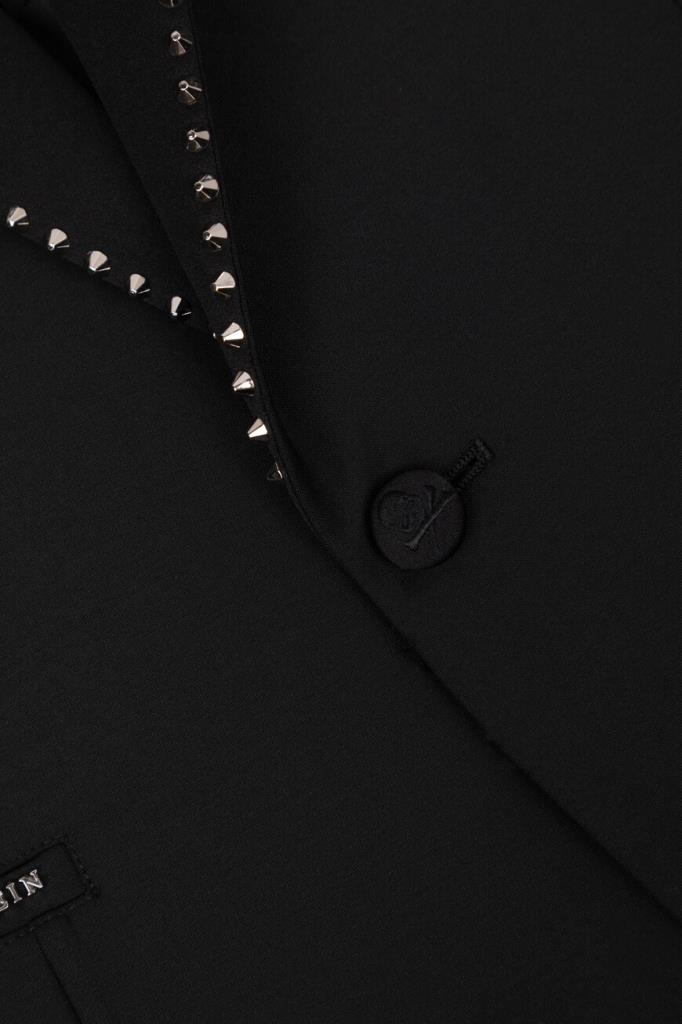 Прямой пиджак Philipp Plein LS Studs добавит изюминку в Ваш гардероб. Фасон изделия чёрного цвета, выполненного из лёгкого трикотажа на основе прочного полиэфира и мягкой вирджинской шерсти с добавлением эластичных волокон, предполагает наличие заострённых лацканов и трёх прорезных карманов: нагрудного с листочкой слева и двух по бокам. Модель с центральной шлицей интересна декором в виде серебристых металлических заклёпок-шипов на воротнике и лацканах, а также культовыми элементами: черепом на левом лацкане и надписью-лого Дома спереди справа.